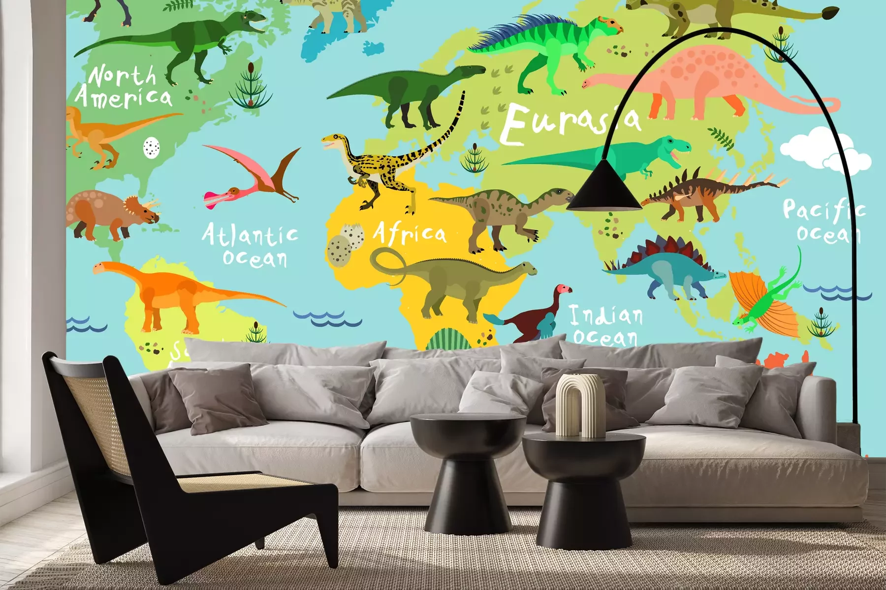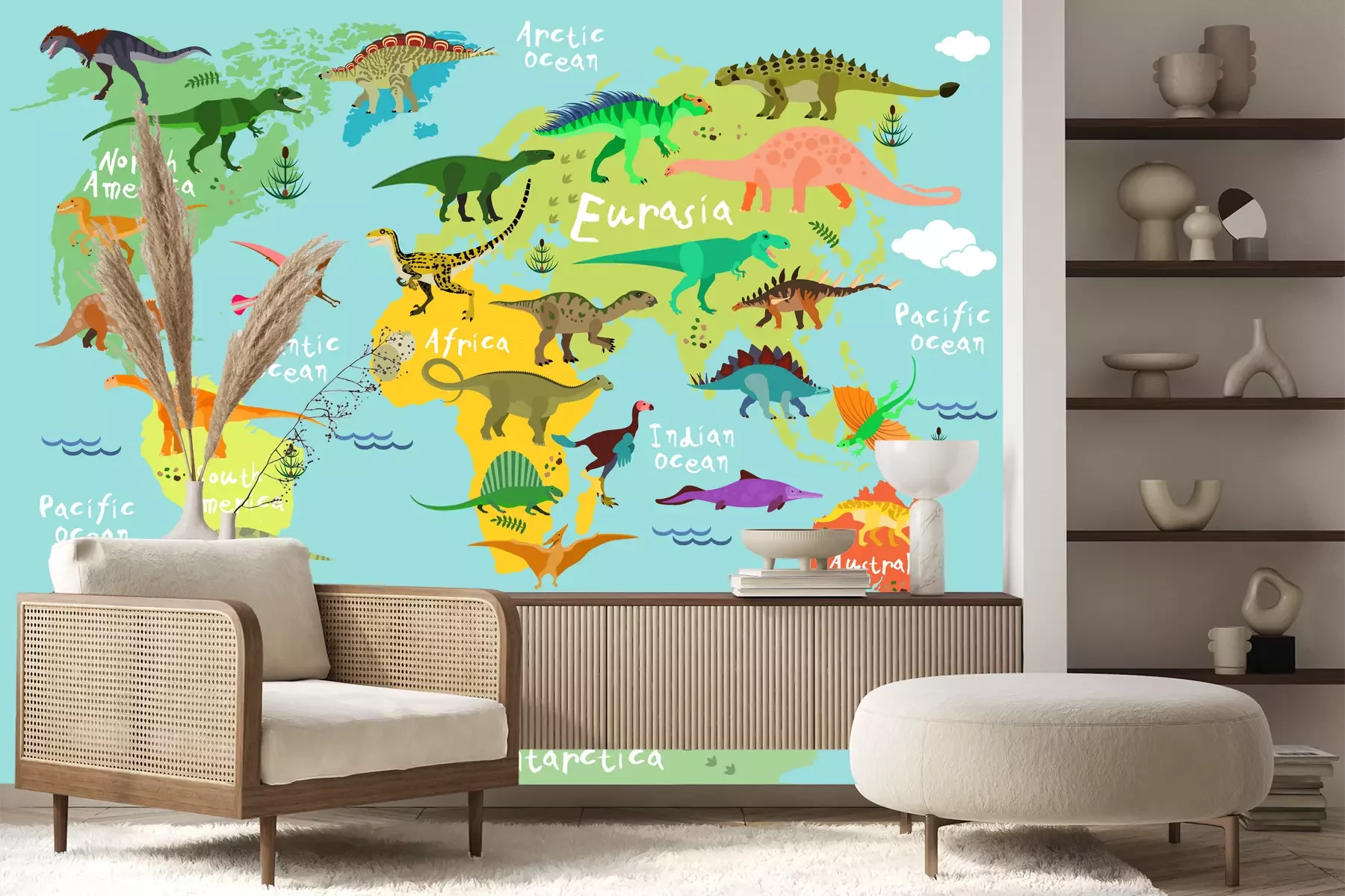 Wereldkaart voor kinderen met dinosaurussen