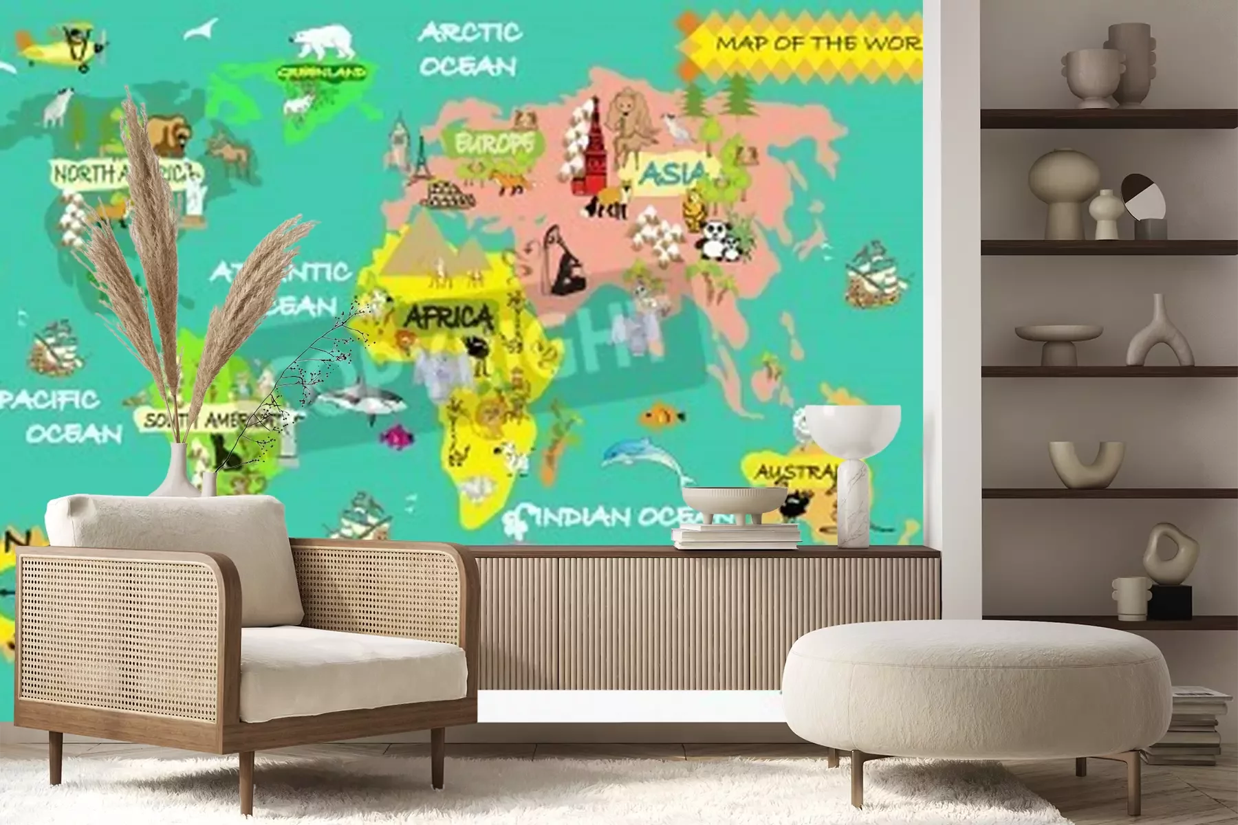 Fotobehang Wereldkaart voor kinderen met oceanen