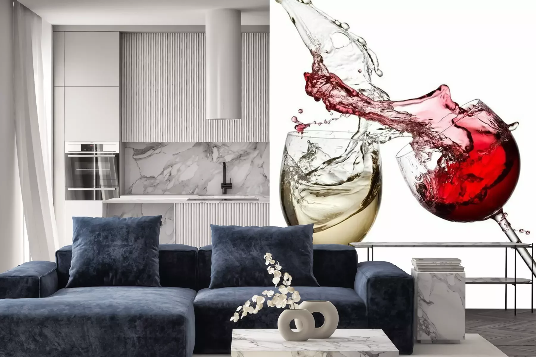Het materiaal Premium is een glad vinyl op vlies, dat bestand is tegen uitrekken en vervorming. Het is dampdoorlatend – de muren kunnen vrij ademen – waardoor het geschikt is voor gebruik in de keuken en badkamer. Bij vervuiling kan het materiaal worden afgenomen met een vochtige doek. De maximale breedte van één baan bedraagt 95 of 105 cm, afhankelijk van de beschikbaarheid. Montage vindt plaats met de rand-aan-rand methode, wat een esthetisch resultaat zonder zichtbare naden oplevert. Omdat de lijm rechtstreeks op de muur wordt aangebracht, verloopt de installatie van het fotobehang snel en eenvoudig.