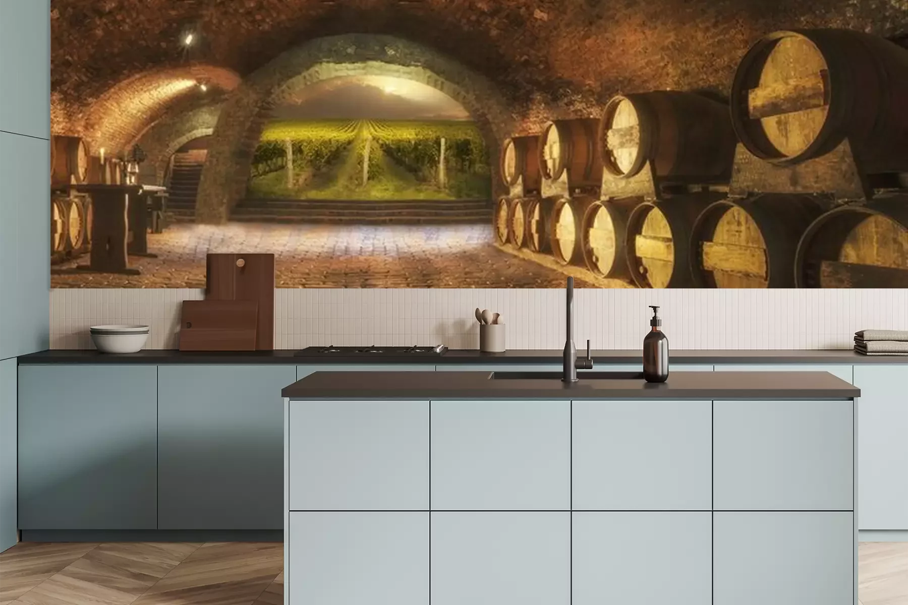 Het materiaal Premium is een glad vinyl op vlies, dat bestand is tegen uitrekken en vervorming. Het is dampdoorlatend – de muren kunnen vrij ademen – waardoor het geschikt is voor gebruik in de keuken en badkamer. Bij vervuiling kan het materiaal worden afgenomen met een vochtige doek. De maximale breedte van één baan bedraagt 95 of 105 cm, afhankelijk van de beschikbaarheid. Montage vindt plaats met de rand-aan-rand methode, wat een esthetisch resultaat zonder zichtbare naden oplevert. Omdat de lijm rechtstreeks op de muur wordt aangebracht, verloopt de installatie van het fotobehang snel en eenvoudig.