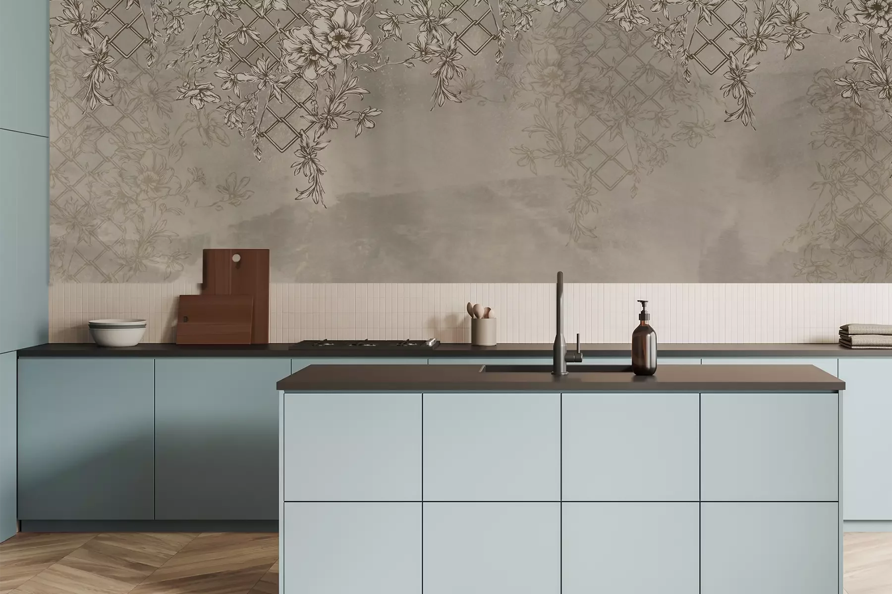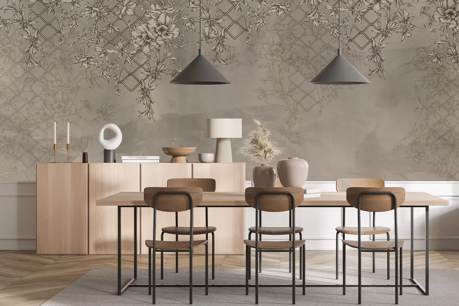 Waterlelies en groene bladerenHet door ons gepresenteerde fotobehang met bloemen is een voorbeeld van een decoratieve oplossing die niet alleen zeer indrukwekkend en origineel is, maar ook tijdloos. Bloemmotieven zijn een bewezen manier om een inrichting te creëren met een tijdloze schoonheid. Wat ons voorstel onderscheidt, is de speciale veroudering van het patroon, waardoor dit decoratiestuk de indruk wekt bedekt te zijn met een nobele patina van de tijd. Dit is te zien aan de subtiele verkleuringen van kleuren en slijtage op plantaardige motieven. Hierdoor wordt het een buitengewoon interessant voorstel voor een fotobehang. Bloemen zullen niet alleen de ruimte versieren, maar deze ook een gezellig karakter geven, waardoor het lijkt alsof de decoratie er altijd al is geweest. Het zachte, warme kleurenpalet en de klimmende planten op het rooster zorgen ervoor dat de kamer een ideale plek wordt om te ontspannen en tot rust te komen. Hoewel het misschien lijkt dat een fotobehang met bloemen alleen geschikt is voor een vintage stijl, is niets minder waar. Het is een patroon dat in veel verschillende arrangementen kan worden toegepast. Zo zal een plantaardig bloemen fotobehang perfect passen in een glamoureuze woonkamer. Bloemen op een speciaal verouderd patroon zullen de elegantie van de inrichting doorbreken, waardoor de ruimte een meer uitgesproken uitstraling krijgt. Een andere suggestie is een minimalistisch ingerichte slaapkamer, waarin klimmende bloemen perfect passen. Dankzij het zachte kleurenpalet zal het fotobehang bloemenbijdragen aan de kalmte en de moderne inrichting gezelligheid geven. Interessant genoeg is dit ook een oplossing voor de industriële stijl. Het volstaat om betonnen wandbekledingen te combineren met klimmende bloemen. Het fotobehang bloemen past perfect bij de rauwe, loftachtige ruimte. Hoewel de shabby chic-stijl wordt geassocieerd met lichtere kleuren, past ons fotobehang lianen ook goed bij deze inrichting. Klimplanten verweven met bloemtakken zullen een perfecte achtergrond vormen voor witgekalkt houten meubilair, waardoor een enigszins hofachtige, enigszins rustieke sfeer ontstaat. Zoals je kunt zien, zijn er heel wat arrangementen waarin ons bloemen fotobehang goed zal passen. Bloemen zullen zowel een versiering van de woning zijn als een idee om een vleugje natuur binnen te halen.