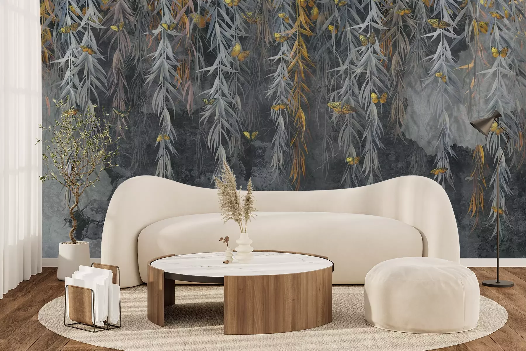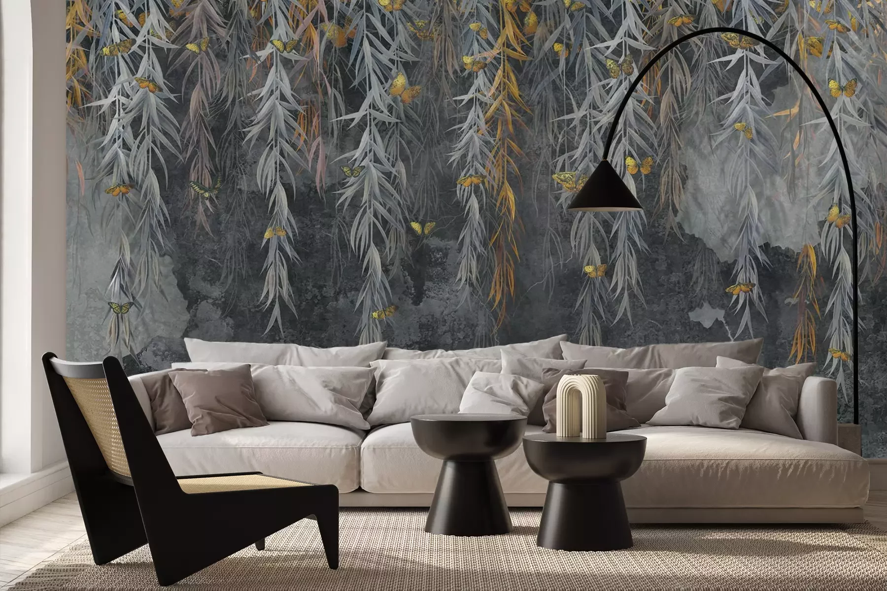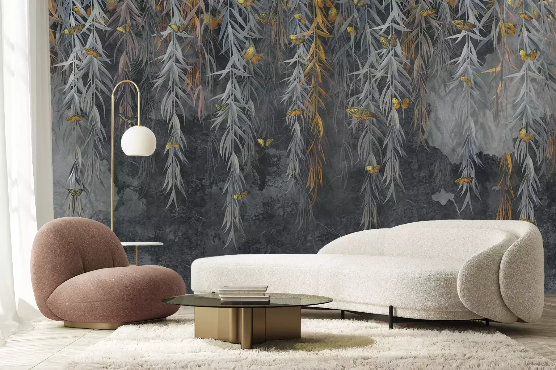 Wijnstokken hangen erboven en vlinders op een betonnen achtergrond