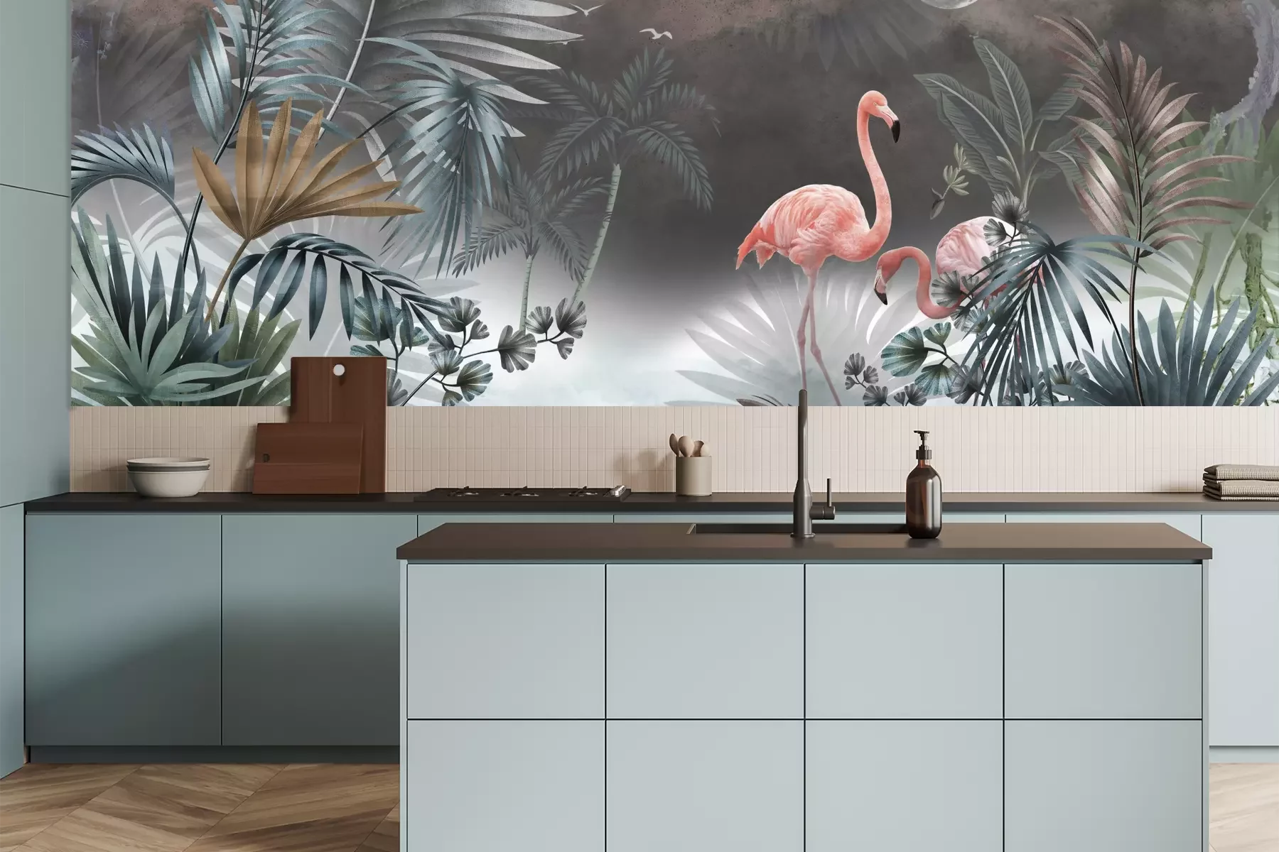 Het materiaal Premium is een glad vinyl op vlies, dat bestand is tegen uitrekken en vervorming. Het is dampdoorlatend – de muren kunnen vrij ademen – waardoor het geschikt is voor gebruik in de keuken en badkamer. Bij vervuiling kan het materiaal worden afgenomen met een vochtige doek. De maximale breedte van één baan bedraagt 95 of 105 cm, afhankelijk van de beschikbaarheid. Montage vindt plaats met de rand-aan-rand methode, wat een esthetisch resultaat zonder zichtbare naden oplevert. Omdat de lijm rechtstreeks op de muur wordt aangebracht, verloopt de installatie van het fotobehang snel en eenvoudig.