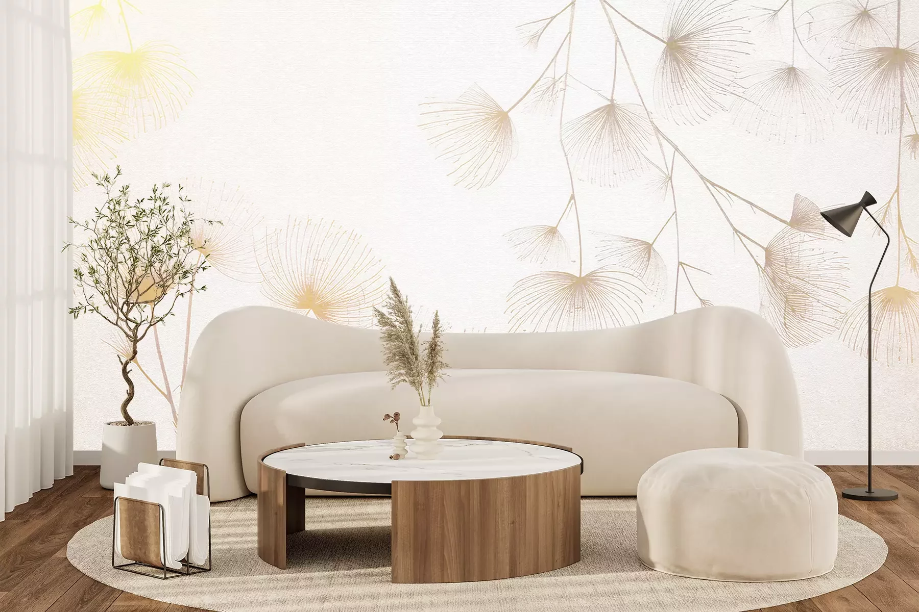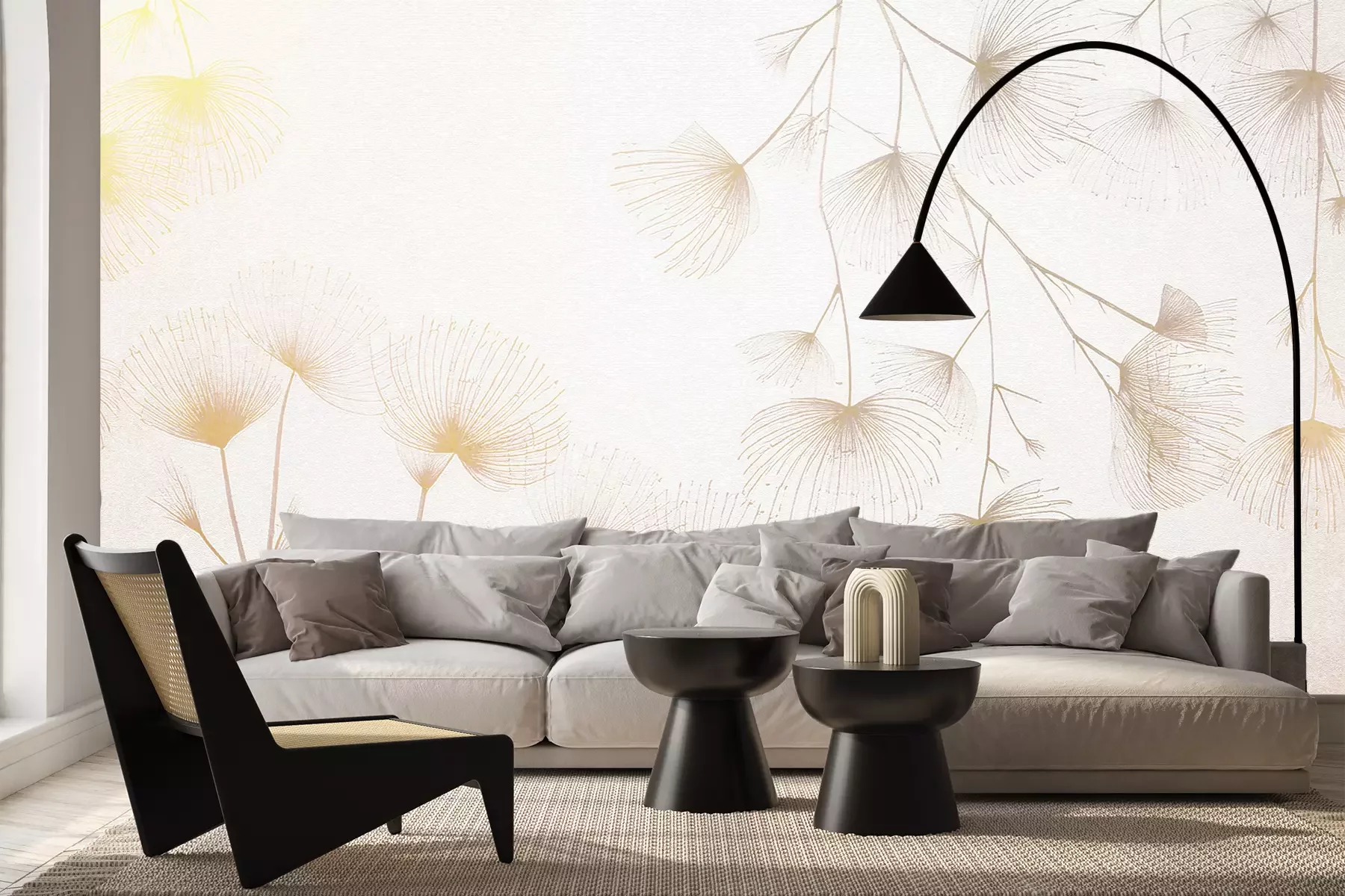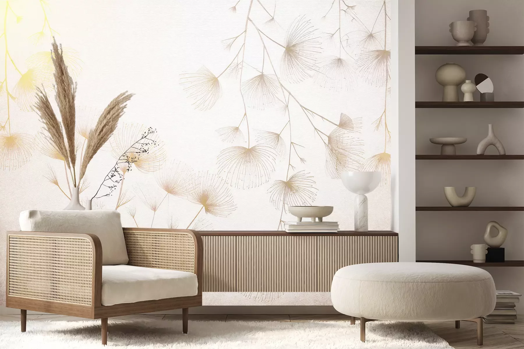 Het materiaal Premium+ is een gestructureerd vinyl op vlies met een gewicht van 255 g/m², dat kleine oneffenheden in de muur effectief camoufleert. De subtiele structuur van fijn zand geeft het oppervlak een exclusieve uitstraling, terwijl de halfmatte afwerking de diepte van de kleuren benadrukt. Het materiaal is dampdoorlatend, waardoor het ook in de keuken en badkamer kan worden gebruikt. De maximale breedte van één baan bedraagt 100 cm – bij grotere afmetingen wordt het fotobehang in meerdere gelijke banen verdeeld. De lijm wordt direct op de muur aangebracht en het behang wordt rand-aan-rand geplakt, wat zorgt voor een esthetisch resultaat zonder zichtbare naden. Het oppervlak kan gemakkelijk worden schoongemaakt door het voorzichtig af te nemen met een vochtige doek.