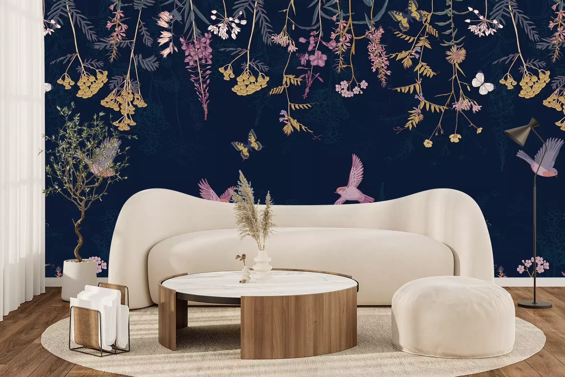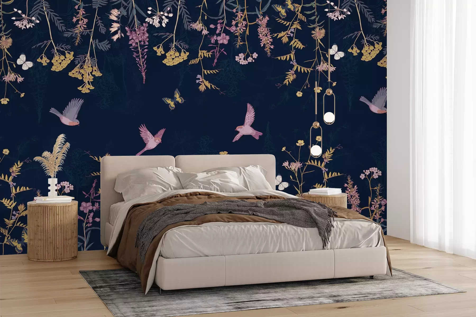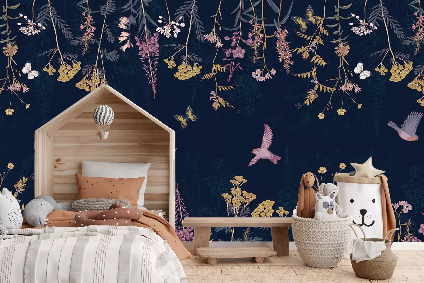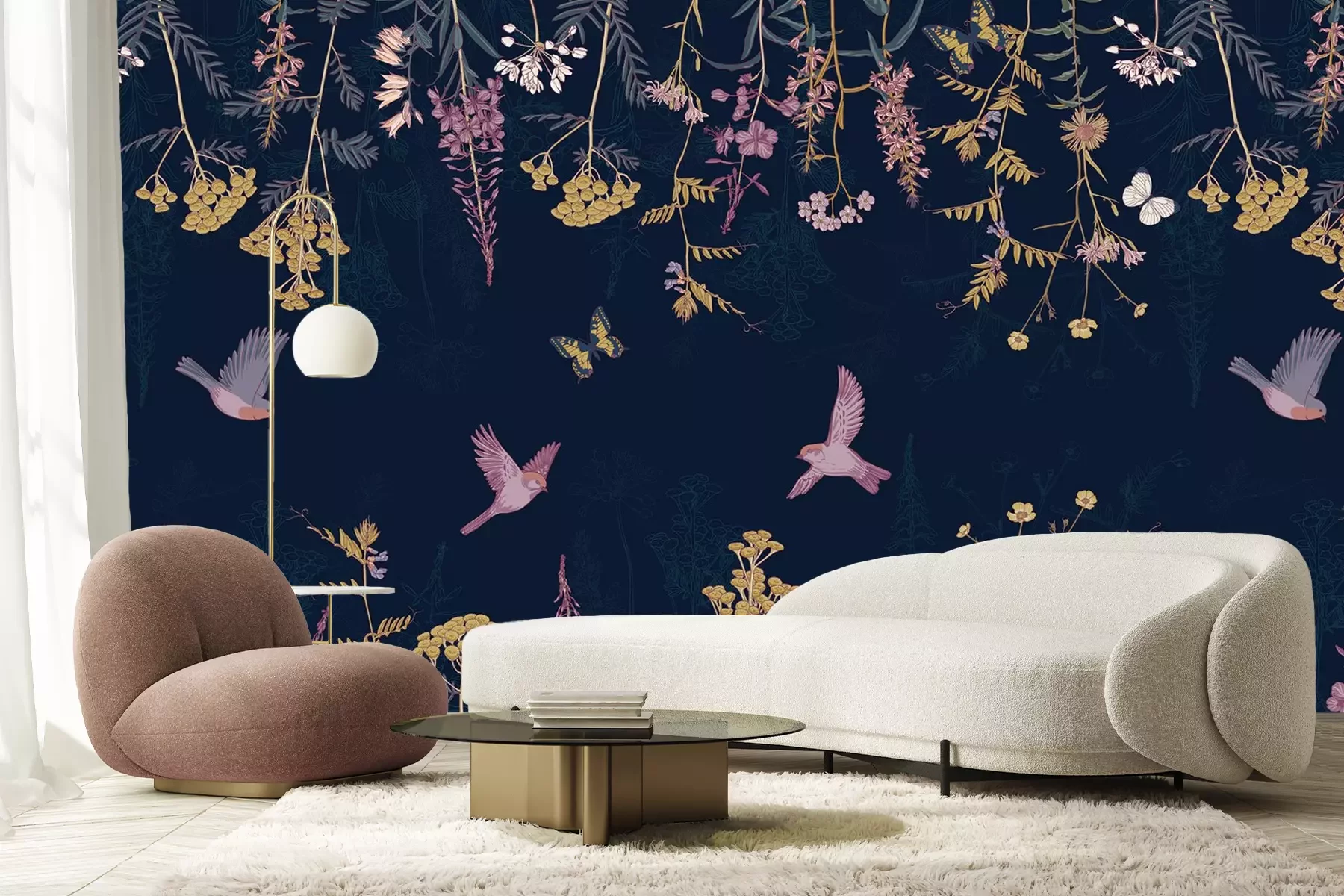 Wilde bloemen, vlinders en vogels in een botanisch patroon geïnspireerd door de natuur
