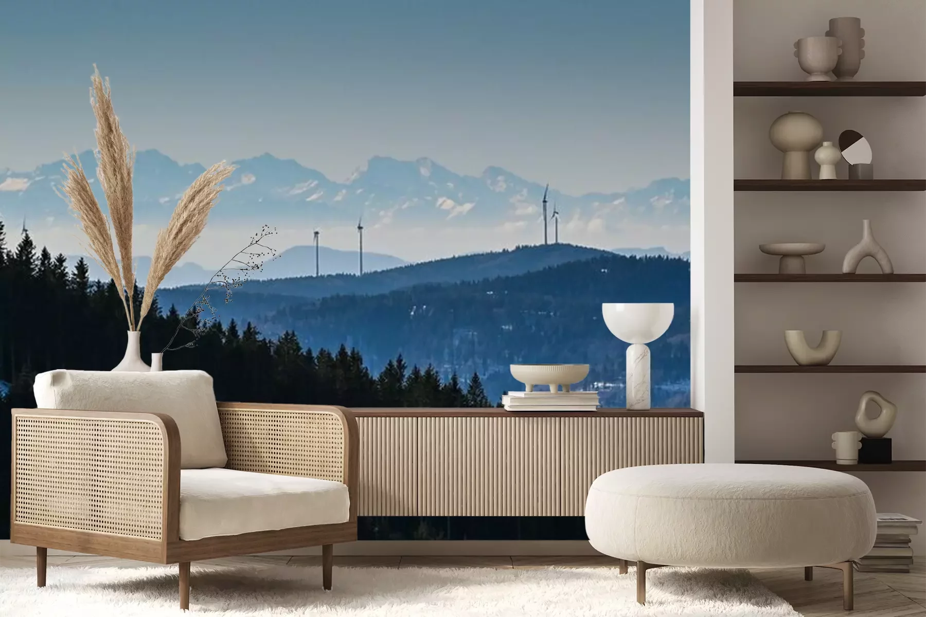 Fotobehang Windkraft im Südschwarzwald mit Alpenpanorama