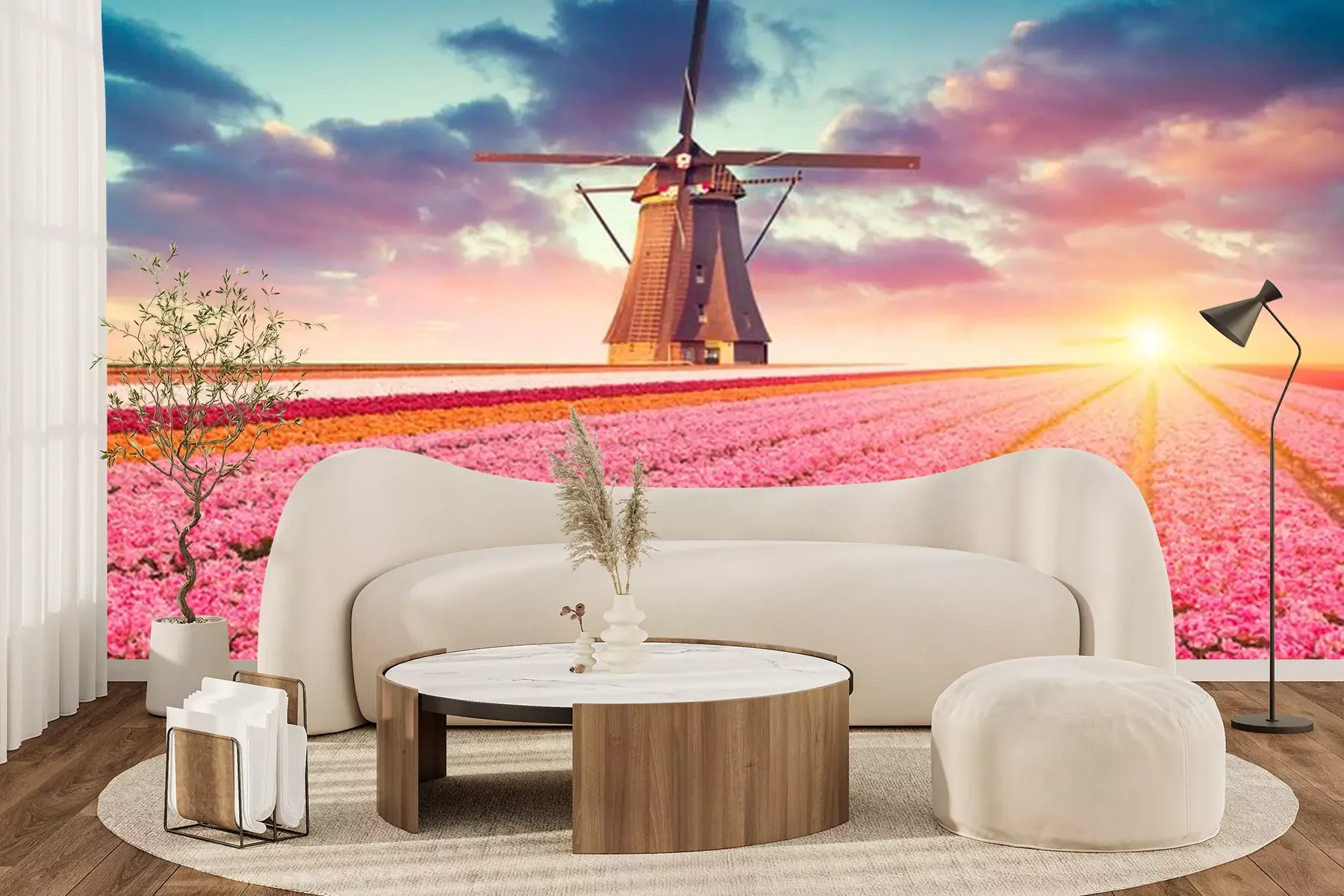 Fotobehang Windmolen in een veld met tulpen