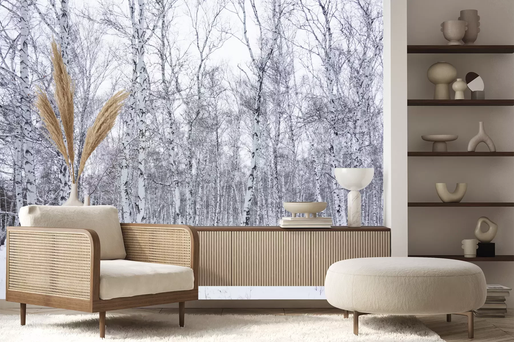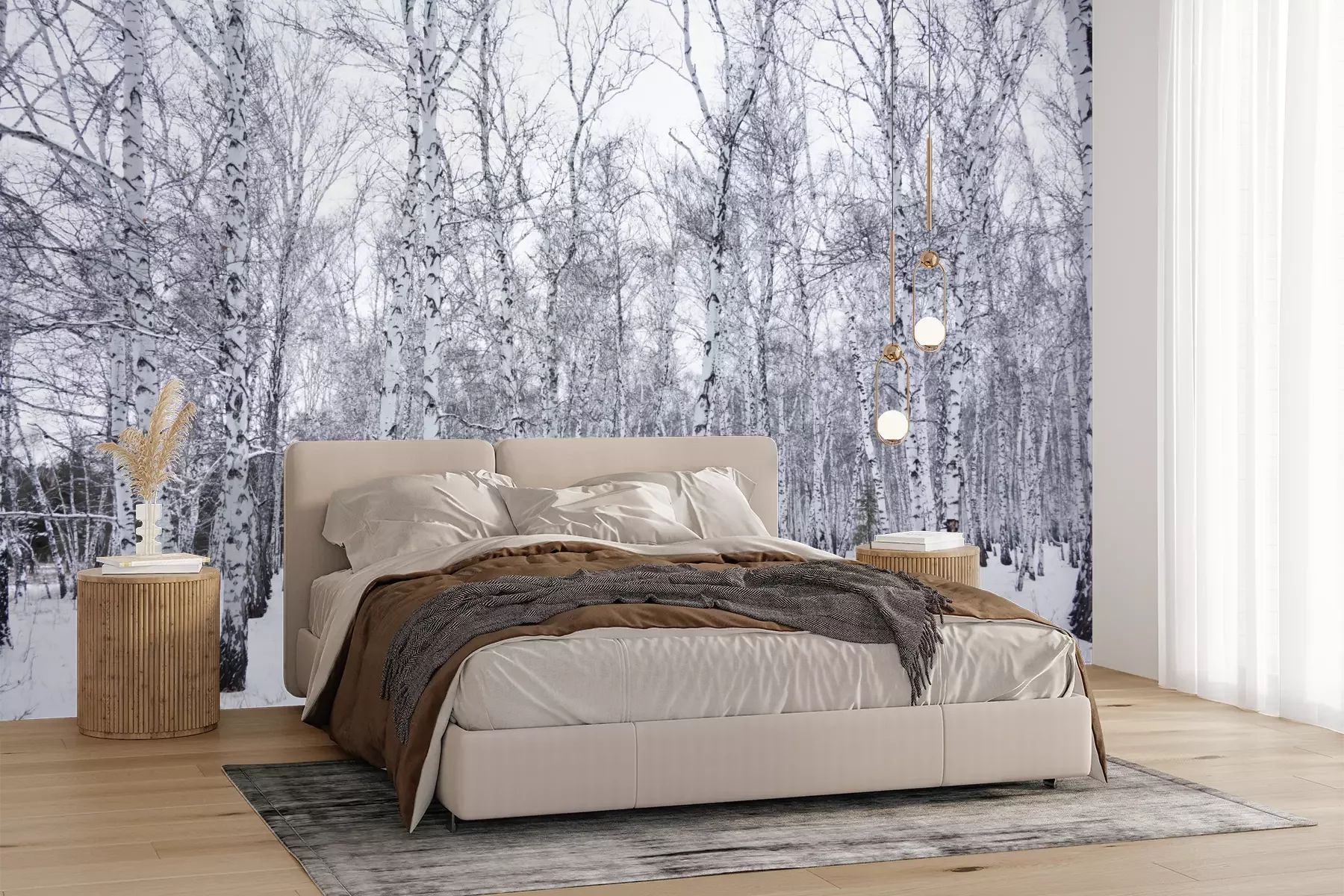Het materiaal Premium+ is een gestructureerd vinyl op vlies met een gewicht van 255 g/m², dat kleine oneffenheden in de muur effectief camoufleert. De subtiele structuur van fijn zand geeft het oppervlak een exclusieve uitstraling, terwijl de halfmatte afwerking de diepte van de kleuren benadrukt. Het materiaal is dampdoorlatend, waardoor het ook in de keuken en badkamer kan worden gebruikt. De maximale breedte van één baan bedraagt 100 cm – bij grotere afmetingen wordt het fotobehang in meerdere gelijke banen verdeeld. De lijm wordt direct op de muur aangebracht en het behang wordt rand-aan-rand geplakt, wat zorgt voor een esthetisch resultaat zonder zichtbare naden. Het oppervlak kan gemakkelijk worden schoongemaakt door het voorzichtig af te nemen met een vochtige doek.