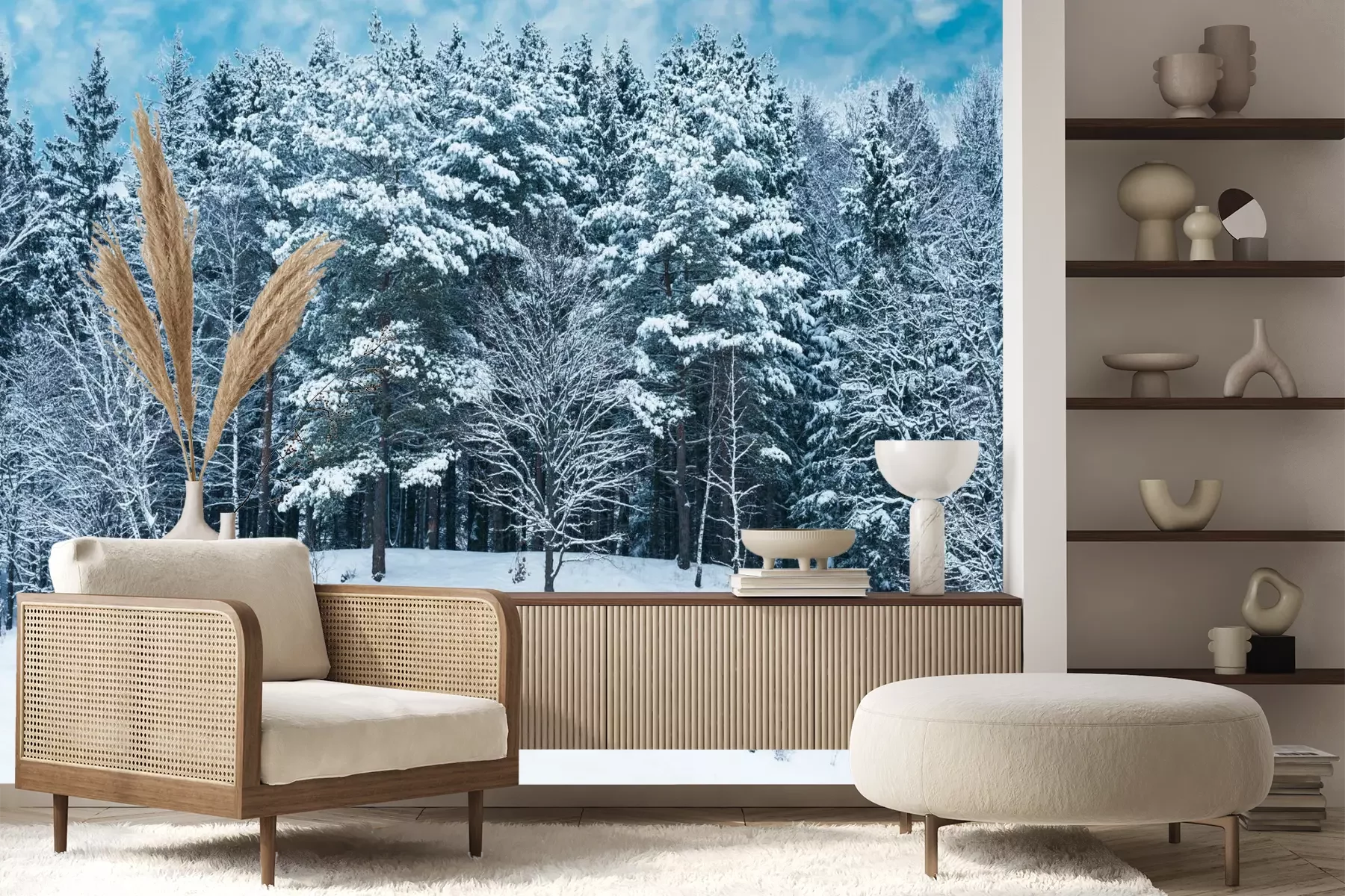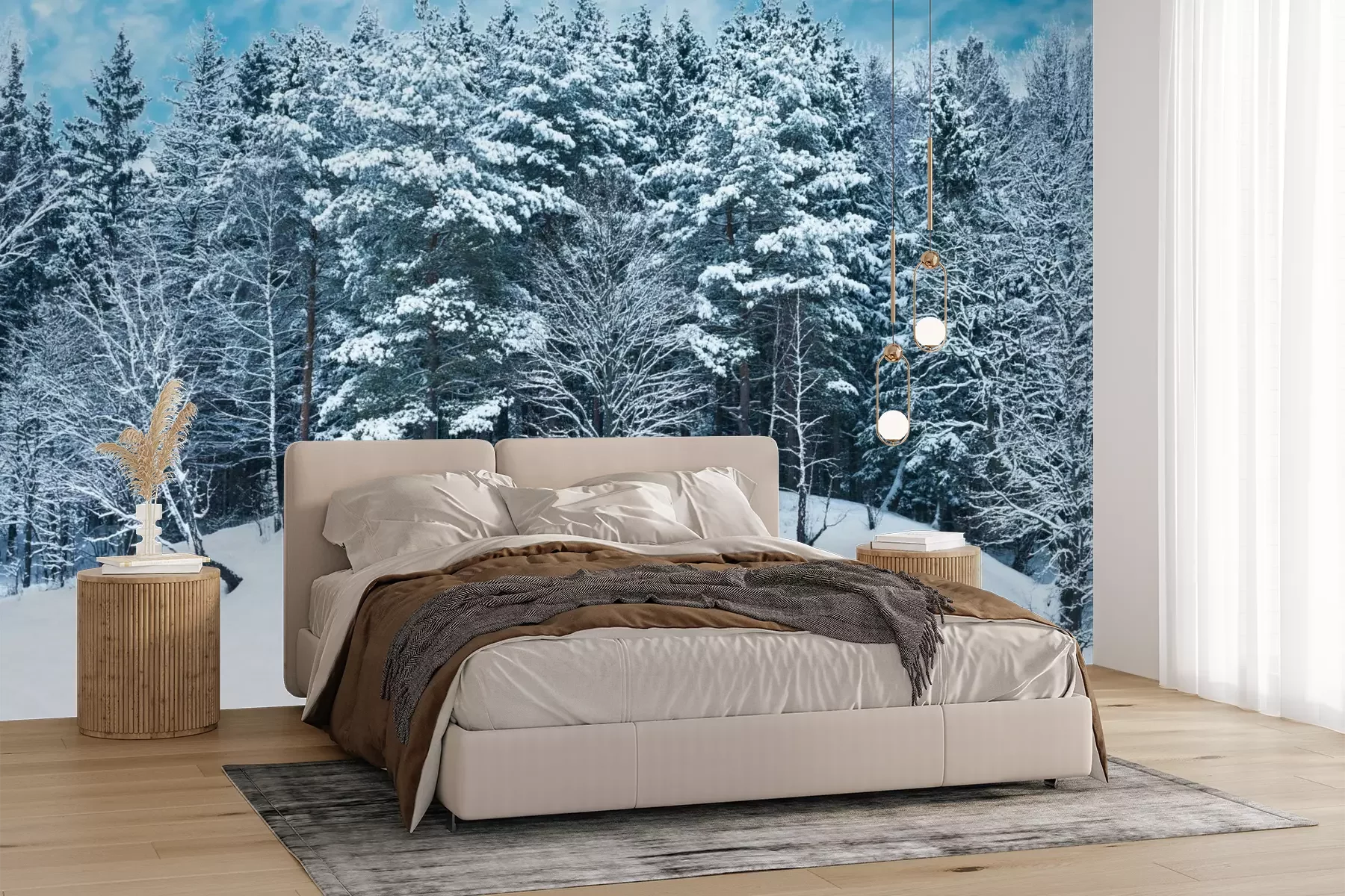 Het materiaal Premium+ is een gestructureerd vinyl op vlies met een gewicht van 255 g/m², dat kleine oneffenheden in de muur effectief camoufleert. De subtiele structuur van fijn zand geeft het oppervlak een exclusieve uitstraling, terwijl de halfmatte afwerking de diepte van de kleuren benadrukt. Het materiaal is dampdoorlatend, waardoor het ook in de keuken en badkamer kan worden gebruikt. De maximale breedte van één baan bedraagt 100 cm – bij grotere afmetingen wordt het fotobehang in meerdere gelijke banen verdeeld. De lijm wordt direct op de muur aangebracht en het behang wordt rand-aan-rand geplakt, wat zorgt voor een esthetisch resultaat zonder zichtbare naden. Het oppervlak kan gemakkelijk worden schoongemaakt door het voorzichtig af te nemen met een vochtige doek.