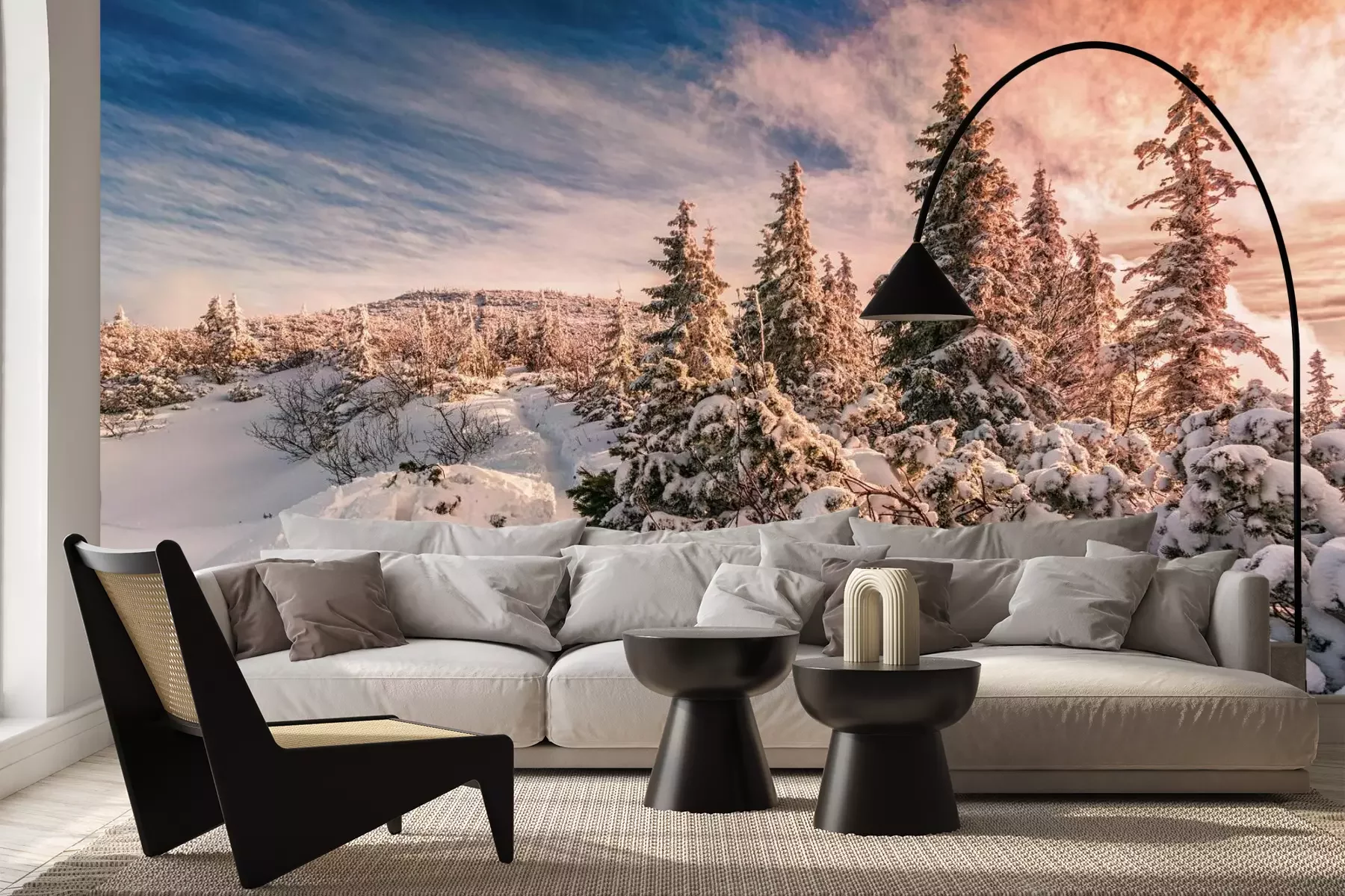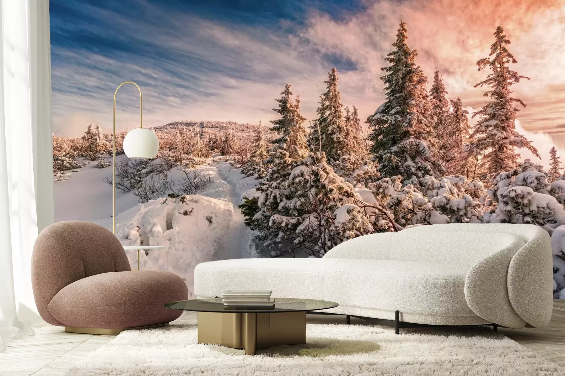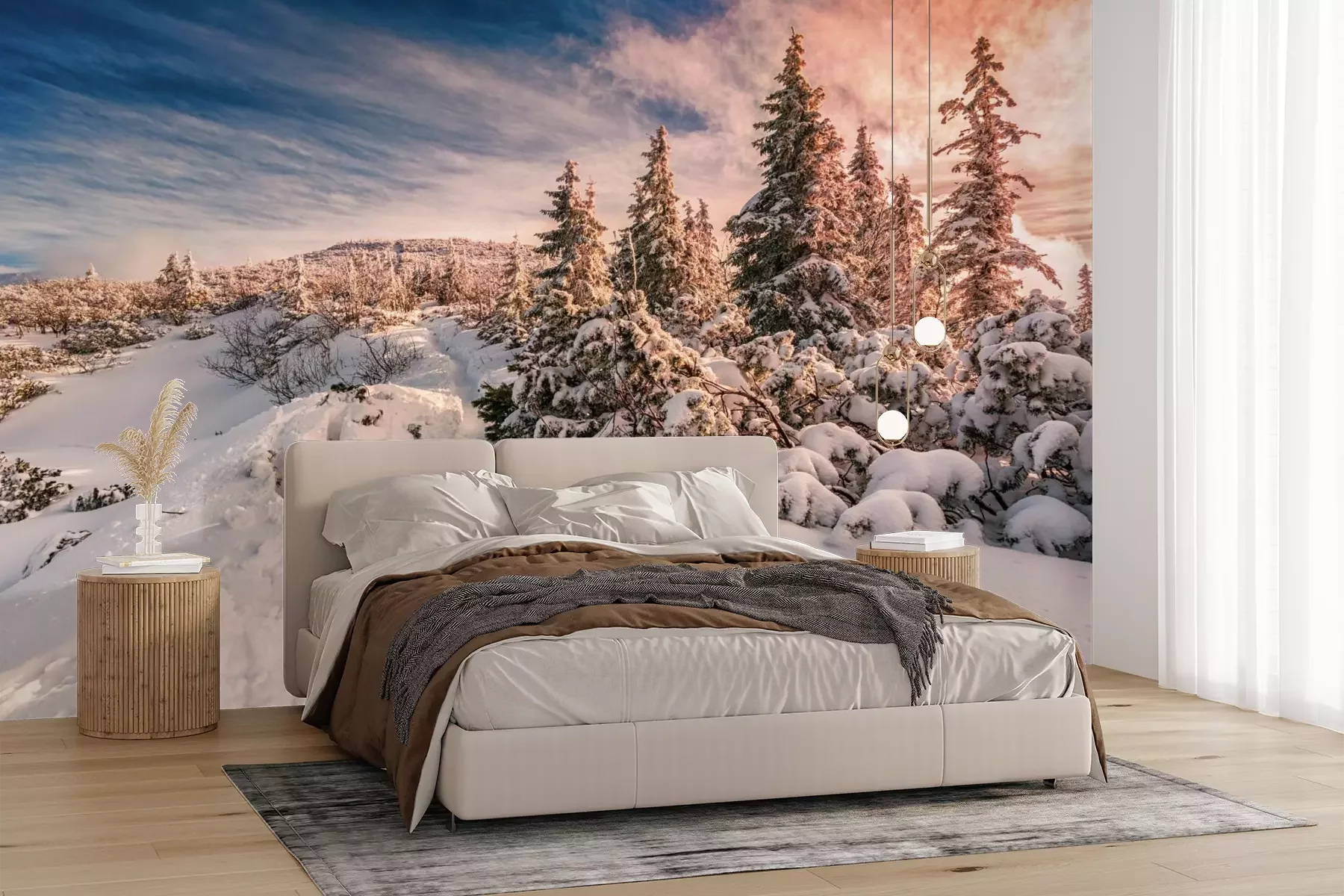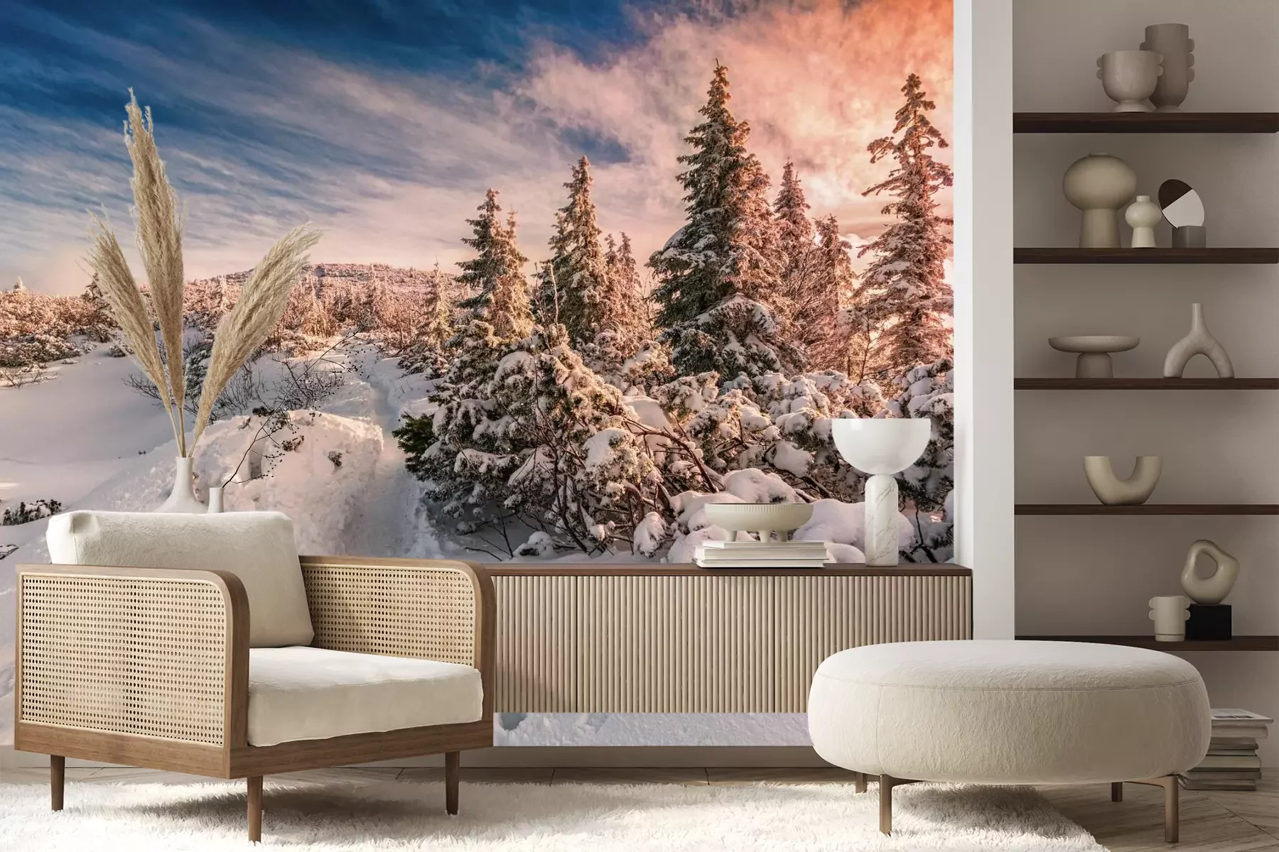 Het materiaal Premium+ is een gestructureerd vinyl op vlies met een gewicht van 255 g/m², dat kleine oneffenheden in de muur effectief camoufleert. De subtiele structuur van fijn zand geeft het oppervlak een exclusieve uitstraling, terwijl de halfmatte afwerking de diepte van de kleuren benadrukt. Het materiaal is dampdoorlatend, waardoor het ook in de keuken en badkamer kan worden gebruikt. De maximale breedte van één baan bedraagt 100 cm – bij grotere afmetingen wordt het fotobehang in meerdere gelijke banen verdeeld. De lijm wordt direct op de muur aangebracht en het behang wordt rand-aan-rand geplakt, wat zorgt voor een esthetisch resultaat zonder zichtbare naden. Het oppervlak kan gemakkelijk worden schoongemaakt door het voorzichtig af te nemen met een vochtige doek.