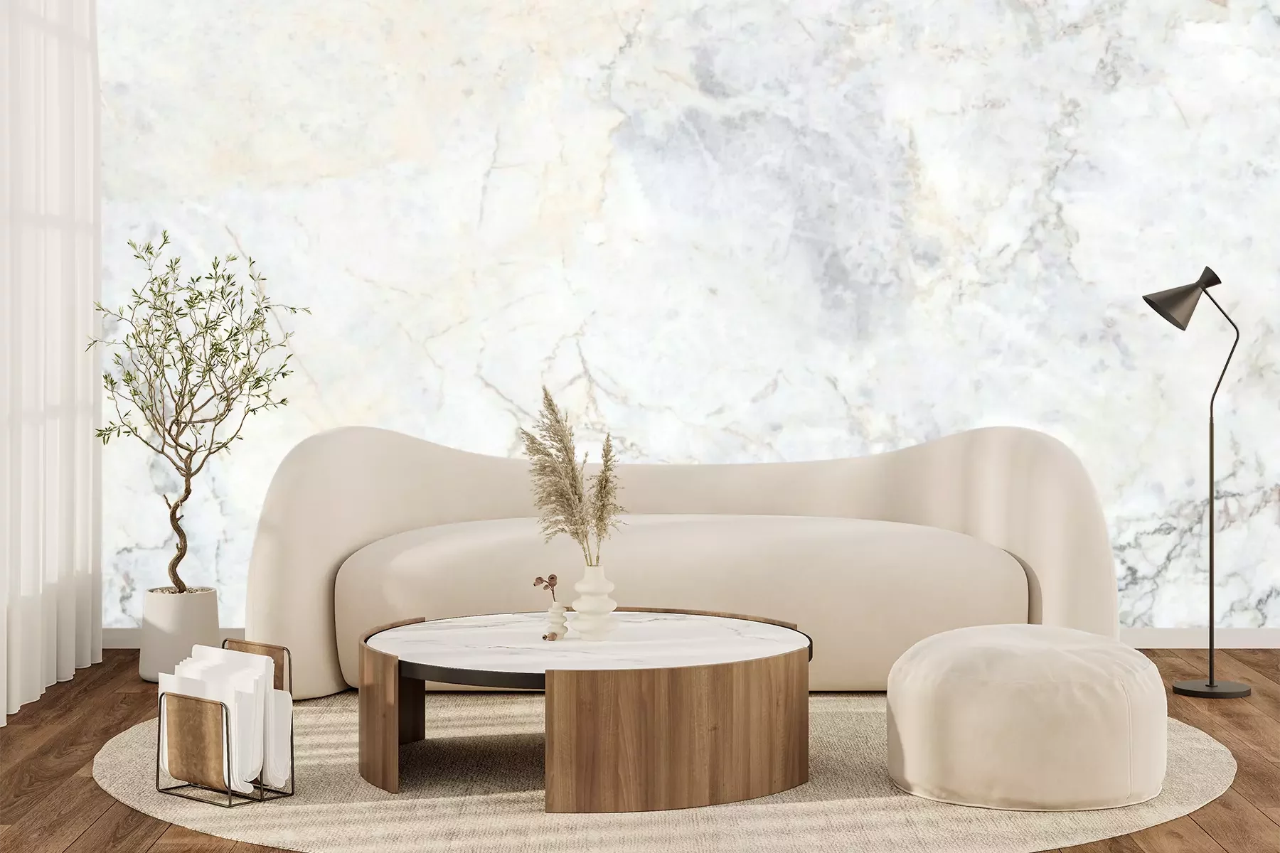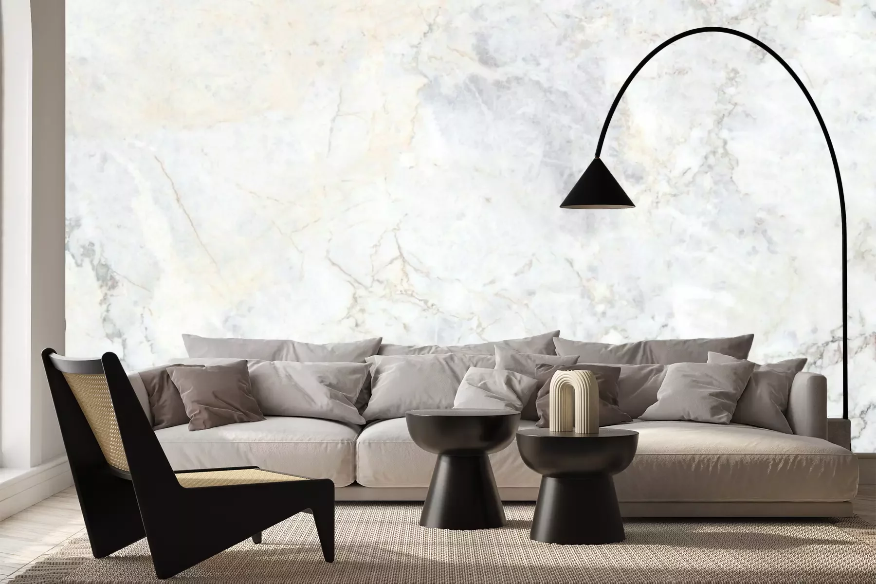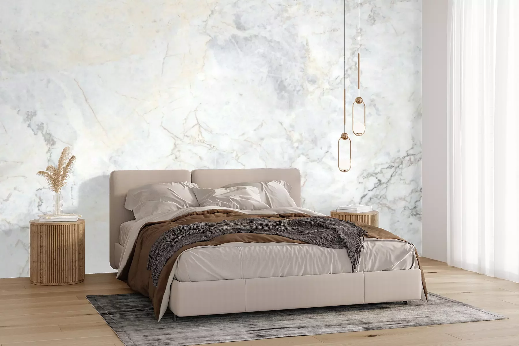 Het materiaal Premium+ is een gestructureerd vinyl op vlies met een gewicht van 255 g/m², dat kleine oneffenheden in de muur effectief camoufleert. De subtiele structuur van fijn zand geeft het oppervlak een exclusieve uitstraling, terwijl de halfmatte afwerking de diepte van de kleuren benadrukt. Het materiaal is dampdoorlatend, waardoor het ook in de keuken en badkamer kan worden gebruikt. De maximale breedte van één baan bedraagt 100 cm – bij grotere afmetingen wordt het fotobehang in meerdere gelijke banen verdeeld. De lijm wordt direct op de muur aangebracht en het behang wordt rand-aan-rand geplakt, wat zorgt voor een esthetisch resultaat zonder zichtbare naden. Het oppervlak kan gemakkelijk worden schoongemaakt door het voorzichtig af te nemen met een vochtige doek.