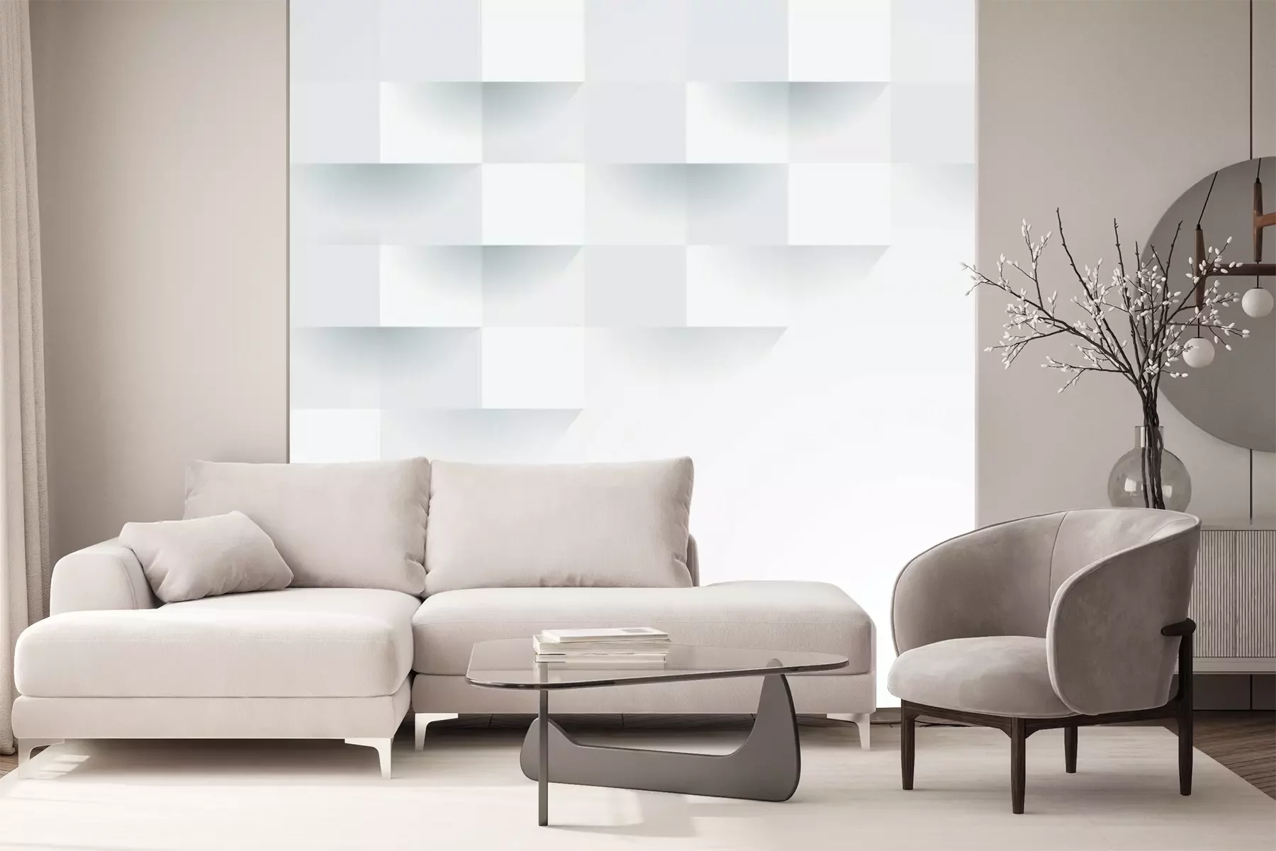 Het materiaal Premium+ is een gestructureerd vinyl op vlies met een gewicht van 255 g/m², dat kleine oneffenheden in de muur effectief camoufleert. De subtiele structuur van fijn zand geeft het oppervlak een exclusieve uitstraling, terwijl de halfmatte afwerking de diepte van de kleuren benadrukt. Het materiaal is dampdoorlatend, waardoor het ook in de keuken en badkamer kan worden gebruikt. De maximale breedte van één baan bedraagt 100 cm – bij grotere afmetingen wordt het fotobehang in meerdere gelijke banen verdeeld. De lijm wordt direct op de muur aangebracht en het behang wordt rand-aan-rand geplakt, wat zorgt voor een esthetisch resultaat zonder zichtbare naden. Het oppervlak kan gemakkelijk worden schoongemaakt door het voorzichtig af te nemen met een vochtige doek.