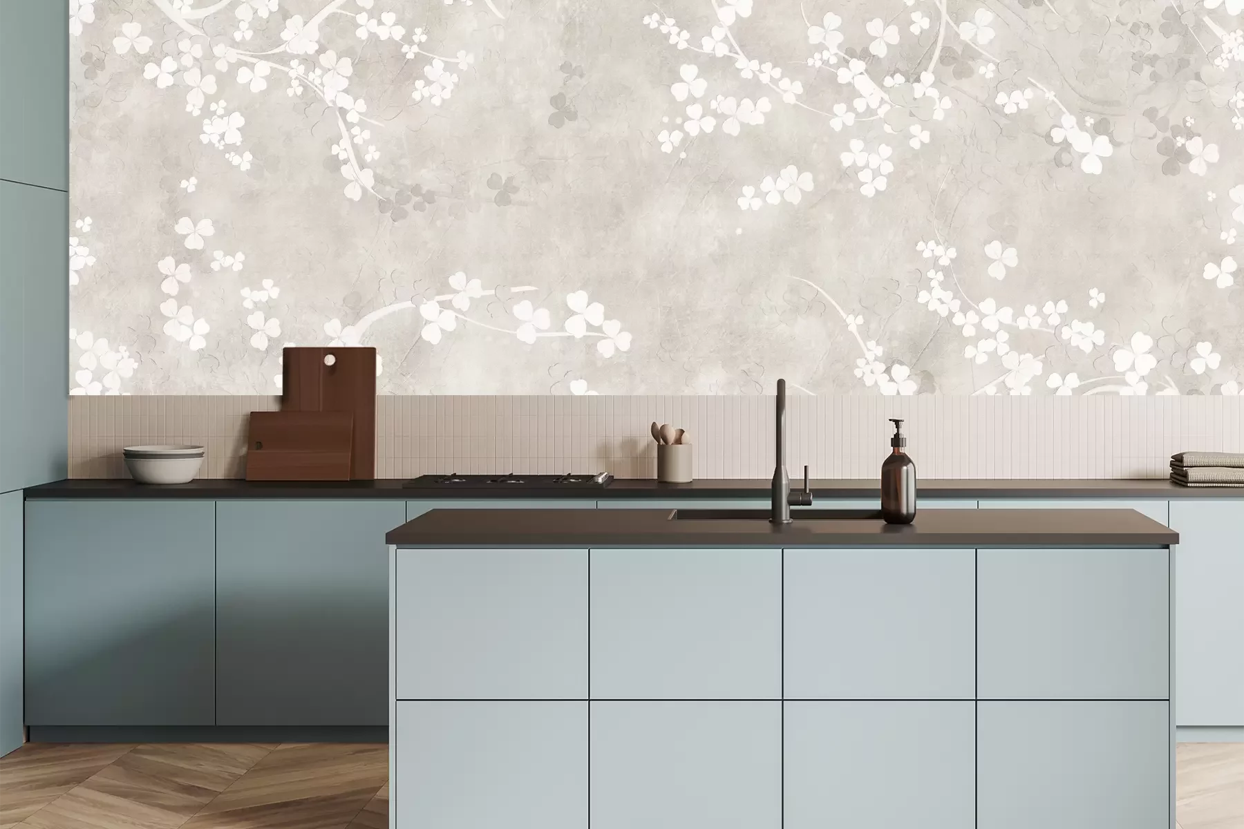 Het materiaal Premium is een glad vinyl op vlies, dat bestand is tegen uitrekken en vervorming. Het is dampdoorlatend – de muren kunnen vrij ademen – waardoor het geschikt is voor gebruik in de keuken en badkamer. Bij vervuiling kan het materiaal worden afgenomen met een vochtige doek. De maximale breedte van één baan bedraagt 95 of 105 cm, afhankelijk van de beschikbaarheid. Montage vindt plaats met de rand-aan-rand methode, wat een esthetisch resultaat zonder zichtbare naden oplevert. Omdat de lijm rechtstreeks op de muur wordt aangebracht, verloopt de installatie van het fotobehang snel en eenvoudig.