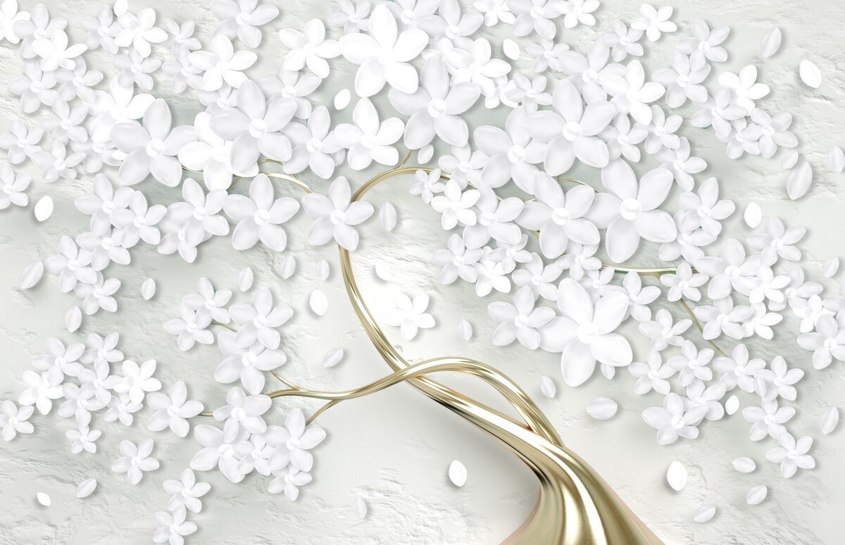 Fotobehang: Witte bloemen op een boom met een 3D-effect