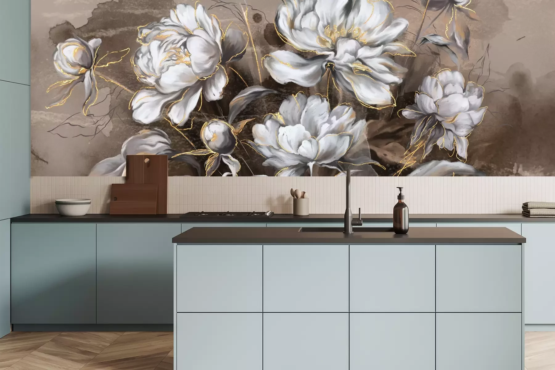 Het materiaal Premium is een glad vinyl op vlies, dat bestand is tegen uitrekken en vervorming. Het is dampdoorlatend – de muren kunnen vrij ademen – waardoor het geschikt is voor gebruik in de keuken en badkamer. Bij vervuiling kan het materiaal worden afgenomen met een vochtige doek. De maximale breedte van één baan bedraagt 95 of 105 cm, afhankelijk van de beschikbaarheid. Montage vindt plaats met de rand-aan-rand methode, wat een esthetisch resultaat zonder zichtbare naden oplevert. Omdat de lijm rechtstreeks op de muur wordt aangebracht, verloopt de installatie van het fotobehang snel en eenvoudig.
