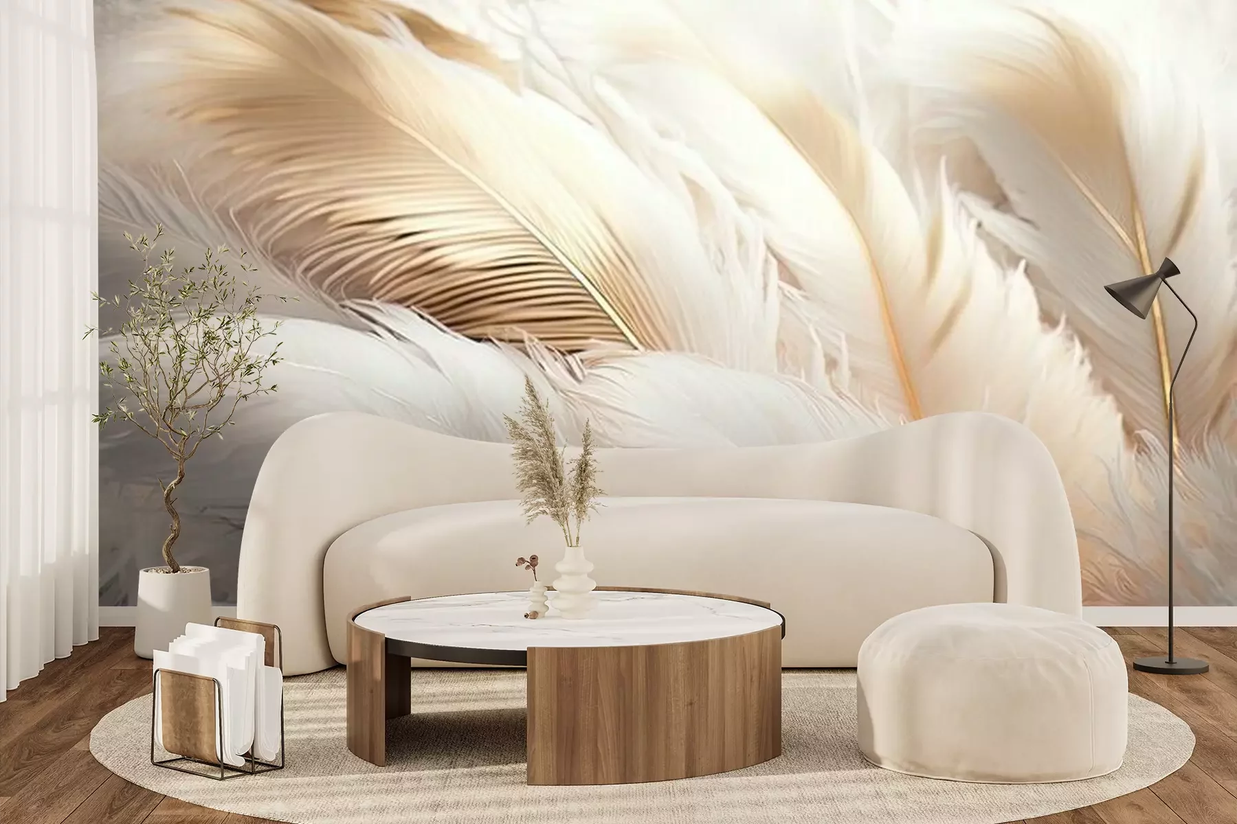 Abstracte zwarte en gouden 3D verenSoms zijn er geen grote veranderingen nodig om het interieur een frisse uitstraling te geven. Als je op zoek bent naar iets dat de aandacht trekt, kies dan voor ons fotobehang. Veren in subtiele tinten vormen een elegant, decoratief motief dat bij veel interieurstijlen past. Het komt het beste tot zijn recht op één van de muren, vooral in ruimtes met veel wit of zachte beige tinten. Fotobehang met veren is een uitstekende oplossing voor moderne interieurs. Het is aangenaam om naar te kijken en past perfect in een romantisch ingerichte slaapkamer. Zachte veren, die doen denken aan zachtheid en lichtheid, creëren de ideale achtergrond voor het bed en zorgen voor een ontspannen sfeer. Kies voor subtiel fotobehang – veertjes in decoratieve stijl geven de muur een verfijnd karakter en helpen een gezellige, sfeervolle ruimte te creëren die uitnodigt tot ontspanning. Je kunt ook je boho-woonkamer transformeren met ons fotobehang. Veertjes in wit en beige voegen sfeer toe en maken het interieur tot een harmonieus geheel. Het patroon sluit mooi aan bij aardetinten, houten meubels, natuurlijke stoffen en rotan. Ons aangeboden fotobehang zal je verrassen met de scherpte van de print, die perfect de structuur van veren weergeeft. De decoratie is bestand tegen verkleuring en behoudt langdurig haar originele uitstraling zonder kwaliteitsverlies. Het duurzame materiaal voorkomt bovendien beschadigingen aan het oppervlak van het fotobehang. Als je van elegante oplossingen houdt, staat niets je in de weg om je interieur een chique uitstraling te geven. Het enige wat je hoeft te doen, is decoratief fotobehang toevoegen. Veren 3D zullen de muren van een glamour woonkamer verfraaien en tegelijkertijd meer diepte geven. Een vleugje stoerheid in deze stijl wordt toegevoegd door grijstinten en diep zwart – meubels in deze kleuren komen mooi uit tegen de luchtige achtergrond van veren. Zo’n inrichting werkt ook goed in een kantoor, dus het is de moeite waard om op één van de muren fotobehang aan te brengen. Veren in lichte tinten zijn een van de motieven die wat elegantie toevoegen aan je thuiskantoor. Het opvallende patroon is ook geschikt voor schoonheidssalons, kapsalons en andere commerciële ruimtes. Het fotobehang kan op maat worden gemaakt voor verschillende formaten ruimtes, omdat wij het op maat printen. De installatie is eenvoudig – het gebruikte materiaal hecht goed aan de muur en maakt een snelle toepassing mogelijk zonder luchtbellen.