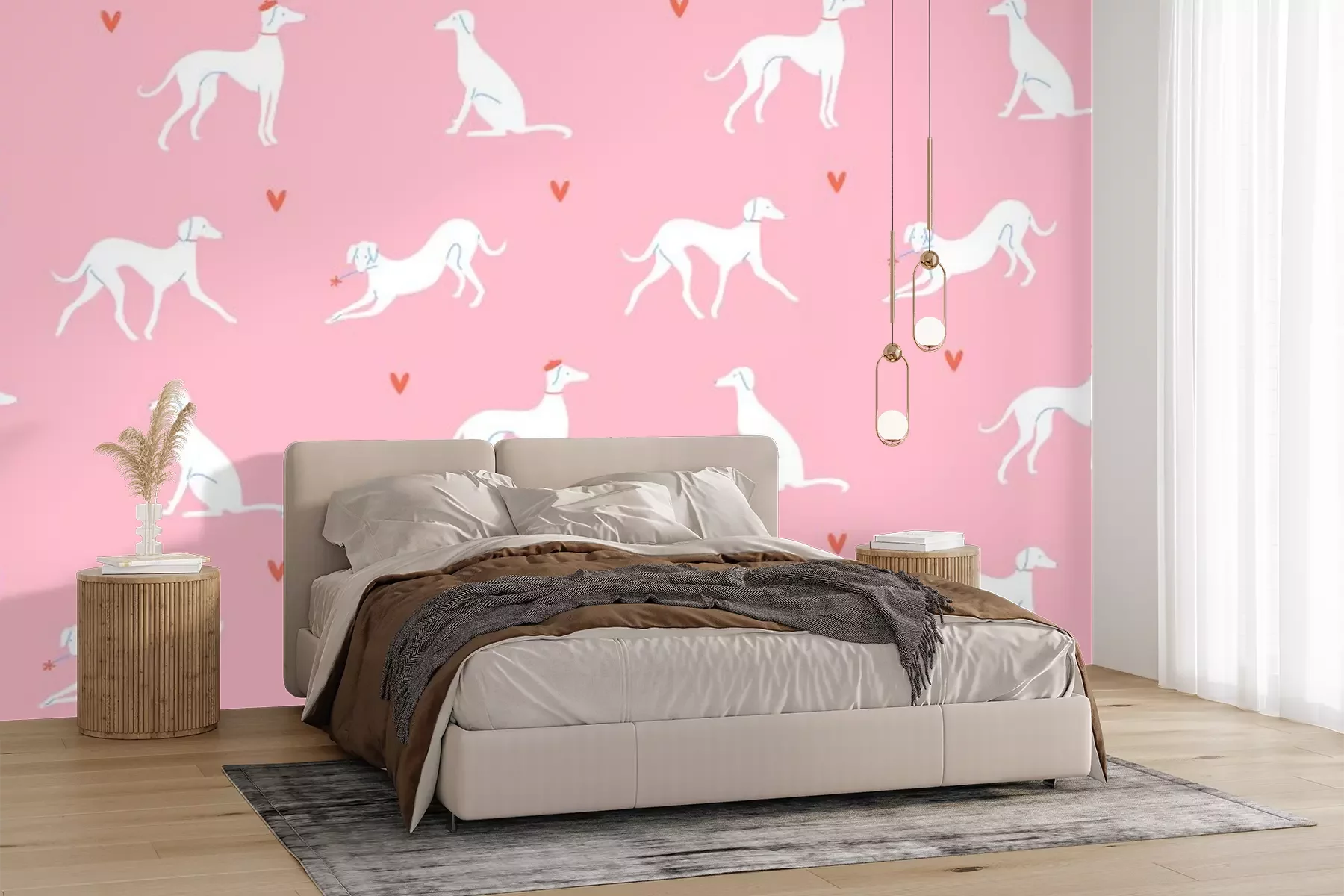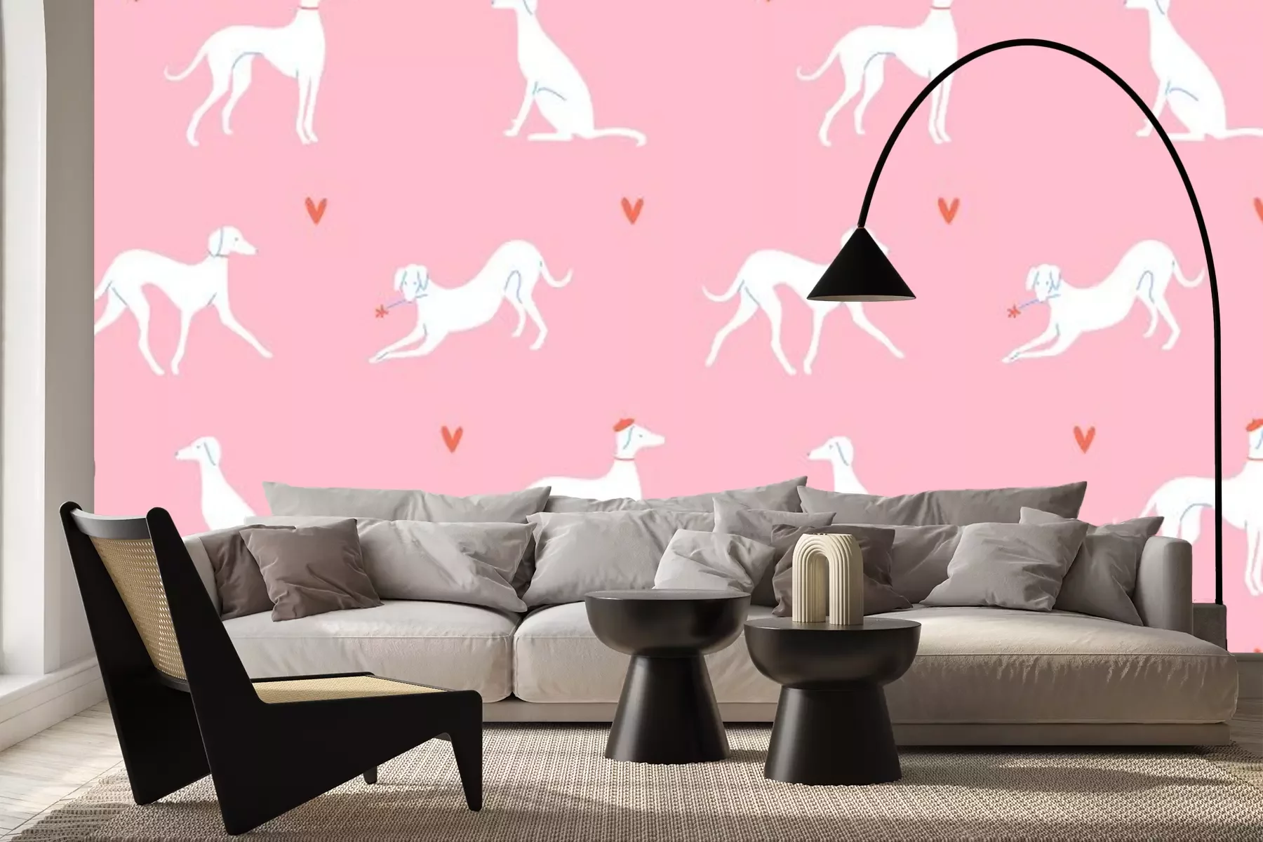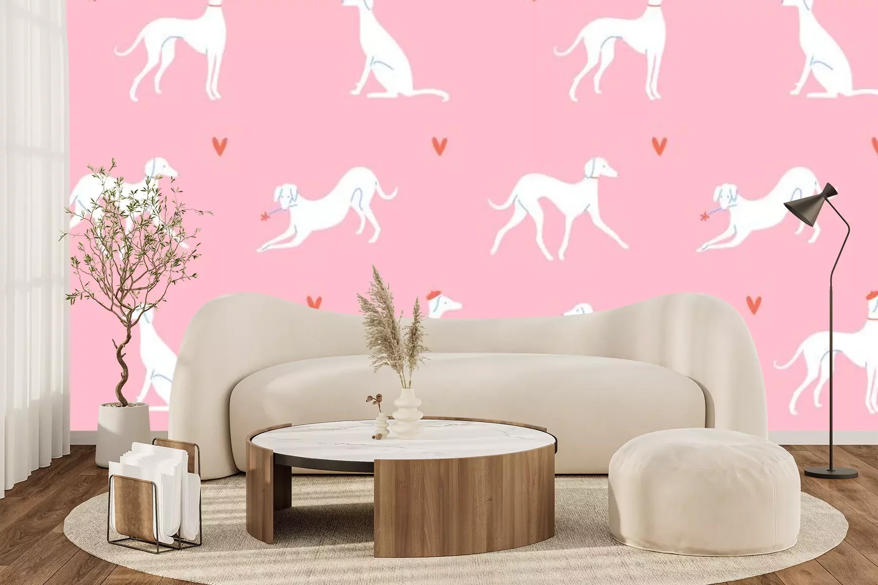 Fotobehang Witte honden in Franse stijl tussen hartjes op roze achtergrond