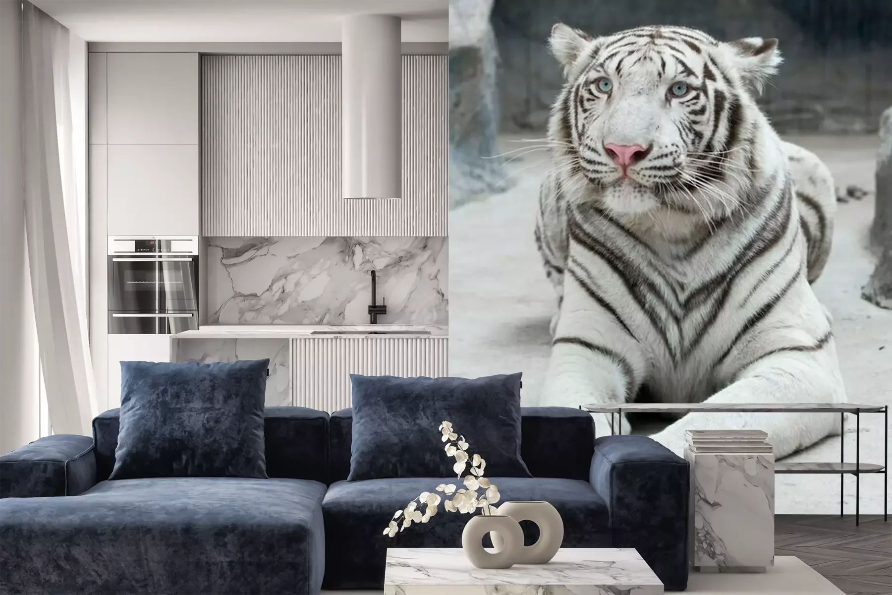 Het materiaal Premium is een glad vinyl op vlies, dat bestand is tegen uitrekken en vervorming. Het is dampdoorlatend – de muren kunnen vrij ademen – waardoor het geschikt is voor gebruik in de keuken en badkamer. Bij vervuiling kan het materiaal worden afgenomen met een vochtige doek. De maximale breedte van één baan bedraagt 95 of 105 cm, afhankelijk van de beschikbaarheid. Montage vindt plaats met de rand-aan-rand methode, wat een esthetisch resultaat zonder zichtbare naden oplevert. Omdat de lijm rechtstreeks op de muur wordt aangebracht, verloopt de installatie van het fotobehang snel en eenvoudig.