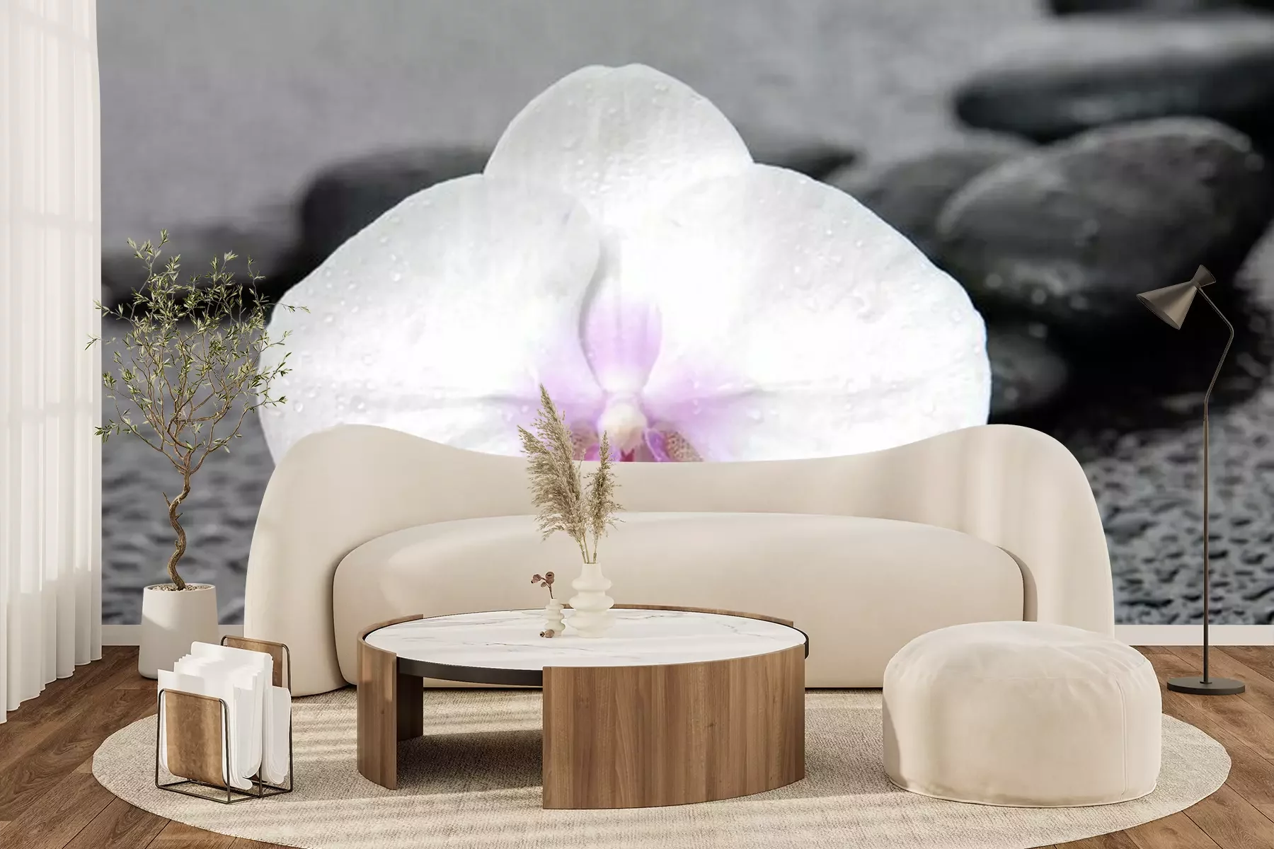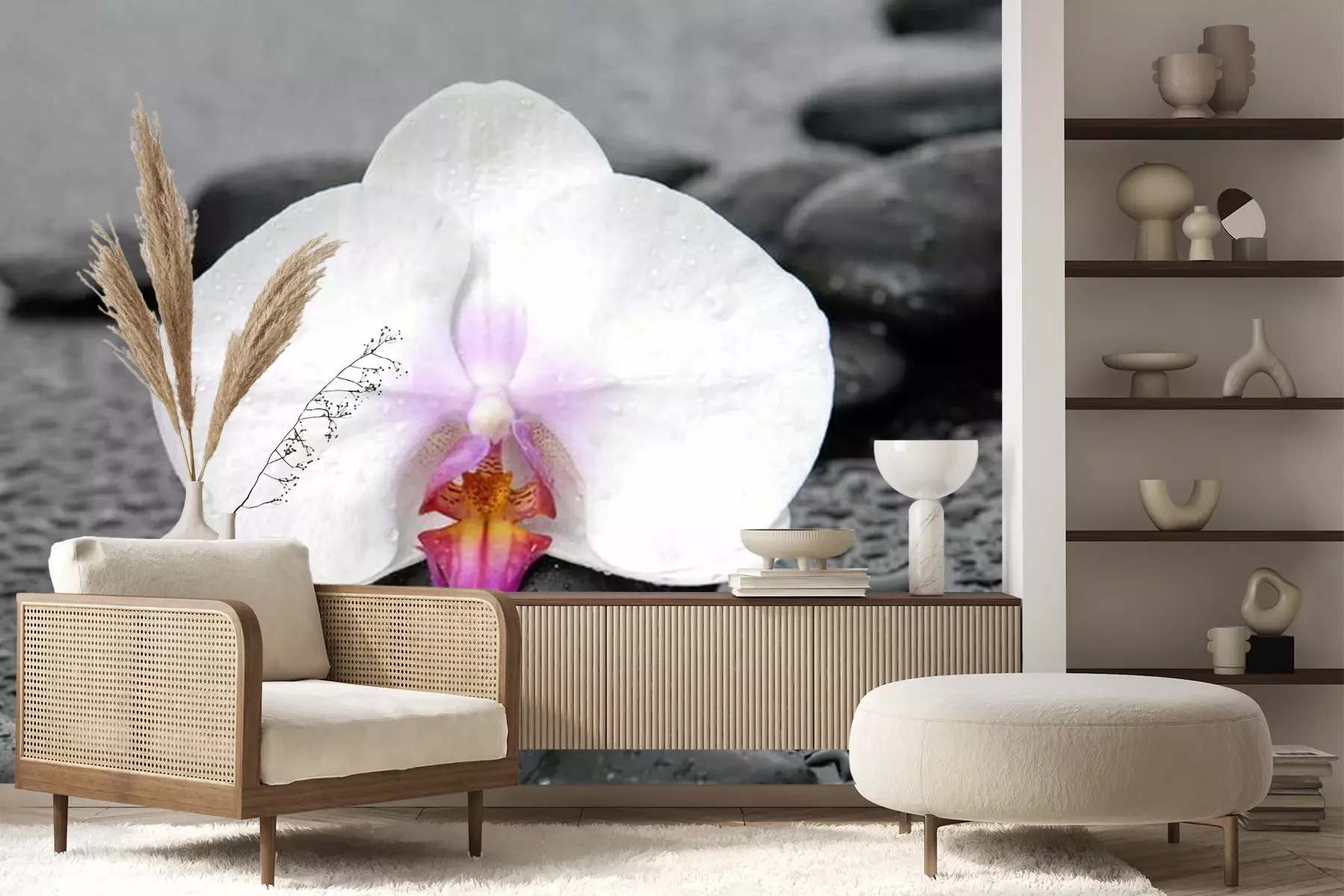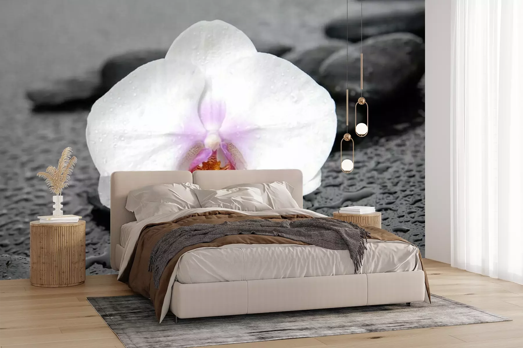 Het materiaal Premium+ is een gestructureerd vinyl op vlies met een gewicht van 255 g/m², dat kleine oneffenheden in de muur effectief camoufleert. De subtiele structuur van fijn zand geeft het oppervlak een exclusieve uitstraling, terwijl de halfmatte afwerking de diepte van de kleuren benadrukt. Het materiaal is dampdoorlatend, waardoor het ook in de keuken en badkamer kan worden gebruikt. De maximale breedte van één baan bedraagt 100 cm – bij grotere afmetingen wordt het fotobehang in meerdere gelijke banen verdeeld. De lijm wordt direct op de muur aangebracht en het behang wordt rand-aan-rand geplakt, wat zorgt voor een esthetisch resultaat zonder zichtbare naden. Het oppervlak kan gemakkelijk worden schoongemaakt door het voorzichtig af te nemen met een vochtige doek.