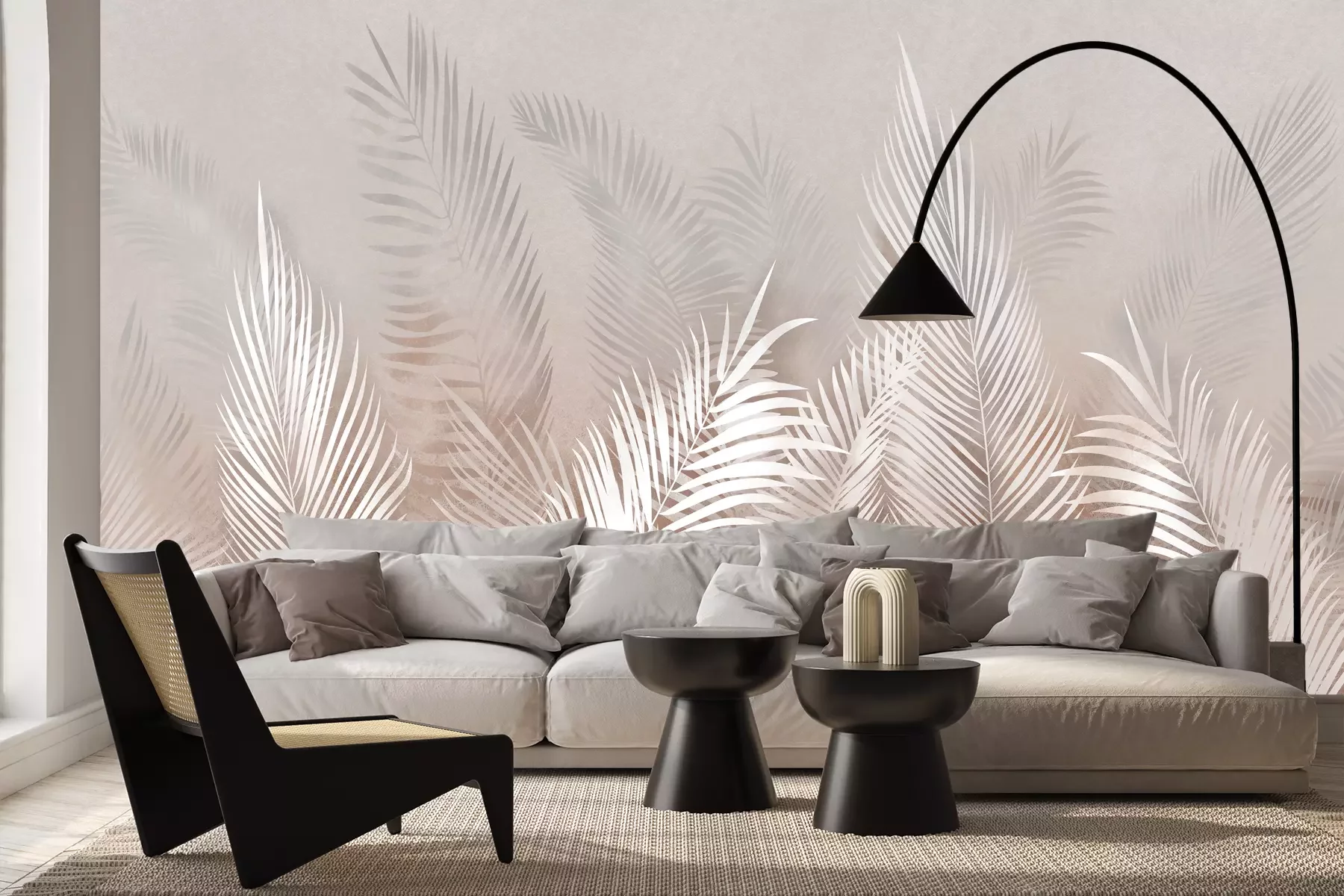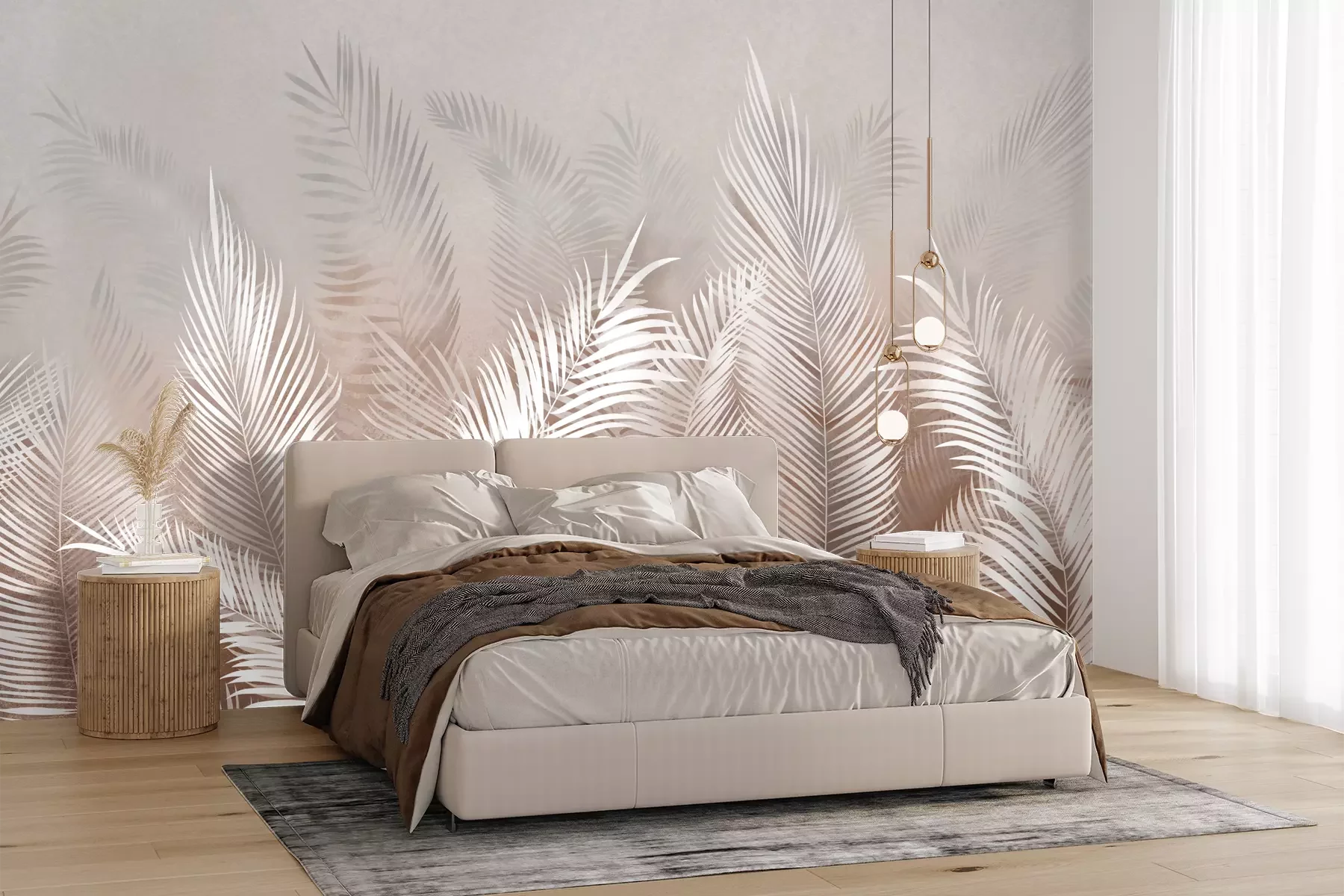 *Korting is niet van toepassing op lijmen, accessoires en cadeaubonnen.Met een wanddecoratie kun je op een eenvoudige en doeltreffende manier een rustgevende sfeer creëren die geïnspireerd is op de natuur – een perfect voorbeeld daarvan is het hier gepresenteerde fotobehang. Palmbladeren, weergegeven als een ingetogen, minimalistische illustratie, verrijken niet alleen het interieur, maar zorgen er ook voor dat je dagelijks kunt genieten van een weelderige, groene uitstraling. Het crème-beige kleurenpalet van het ontwerp is uitzonderlijk veelzijdig – het combineert prachtig met zowel warme als koele tinten, waardoor dit fotobehang moeiteloos in uiteenlopende interieurstijlen past. Een extra pluspunt van ons ontwerp is het 3D-effect dat dit fotobehang kenmerkt. Tropische bladeren met een ruimtelijk karakter vergroten de ruimte optisch en geven diepte aan het interieur. Het is een eenvoudige maar doeltreffende manier om een kamer visueel te vergroten – vooral handig in kleinere ruimtes. Een goed voorbeeld is een compacte badkamer die dankzij dit motief een totaal nieuw karakter krijgt. In dergelijke omstandigheden is een waterbestendig, gelamineerd ideaal fotobehang. Bladeren die op stroken zijn gedrukt en bedekt met een beschermende folie zien er zelfs in de directe nabijheid van een bad of wastafel jarenlang perfect uit. De veelzijdigheid van dit ontwerp maakt het een uitstekende keuze voor veel interieurstijlen. In een minimalistische of ecologische woonkamer komt een botanisch fotobehang bijzonder goed tot zijn recht. Tropische bladeren brengen visuele warmte in de ruimte en zorgen voor een gezellige sfeer. Het is ook een uitstekende keuze voor een slaapkamer in retro-, glamour- of bohostijl – de beige kleurtinten zorgen voor een rustgevende en sensuele ambiance. Let ook op de manier waarop het fotobehang kan worden aangebracht. Palmbladeren kunnen de onderkant van de muur sieren en de indruk wekken dat ze uit de grond groeien, of juist bovenaan worden geplakt, zodat ze een sierlijke guirlande van hangende takken vormen. Beide varianten zijn zeer decoratief, waarbij de tweede zich bijzonder goed leent voor ruimtes met veel meubels die het patroon van het anders fotobehang zouden kunnen bedekken. Natuur is een tijdloos decoratief thema dat perfect past in zowel particuliere als commerciële interieurs, zoals kantoren, praktijken of dienstverlenende salons. Ze brengt tijdloze elegantie en creëert een aangename sfeer.