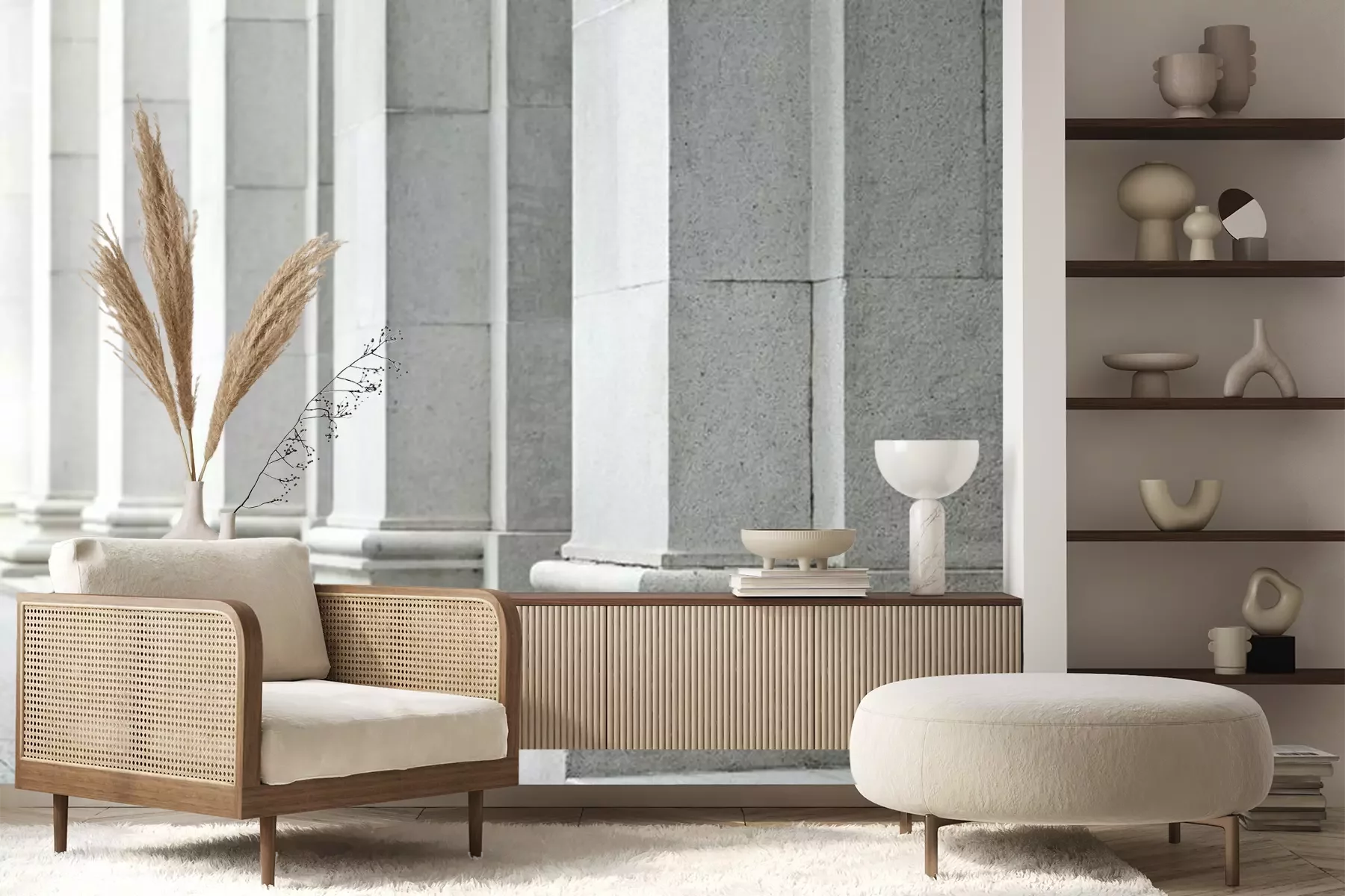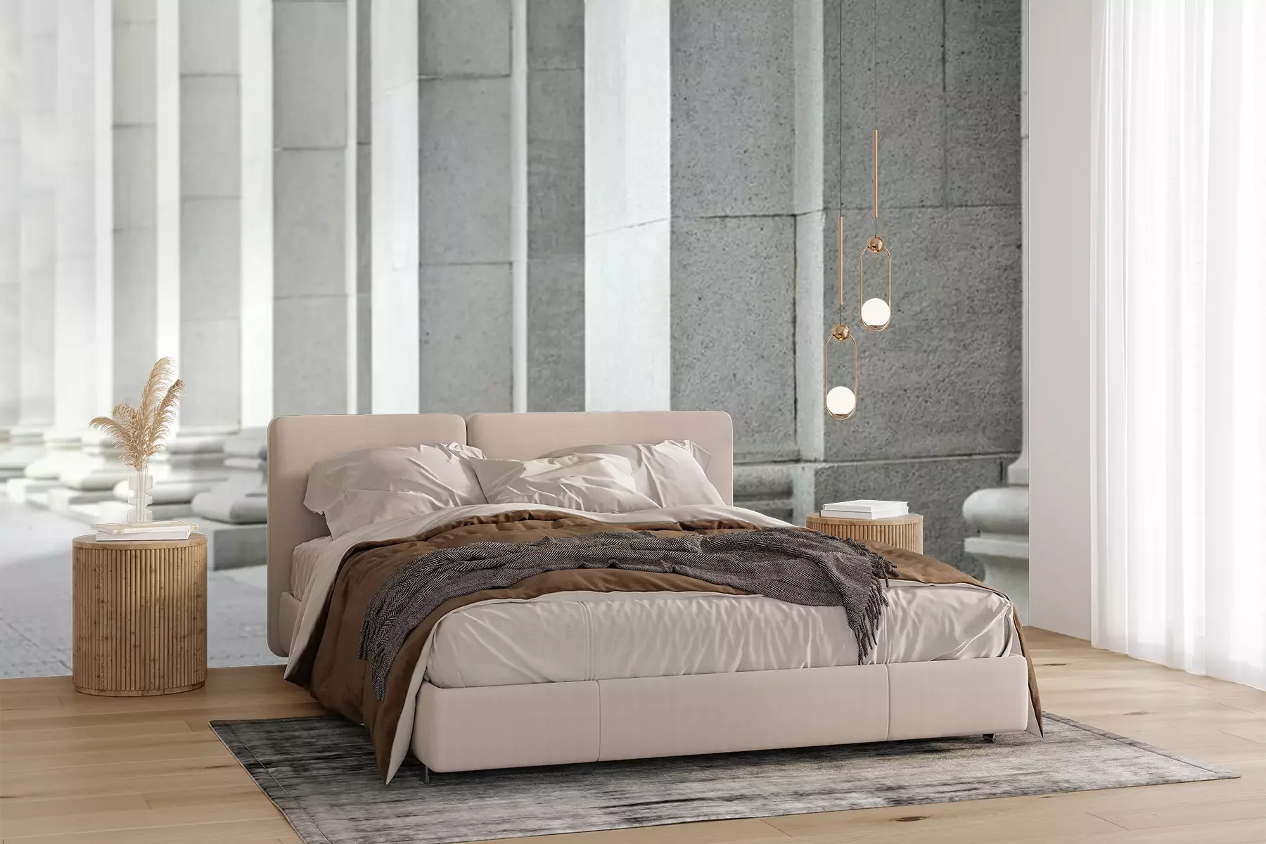 Het materiaal Premium+ is een gestructureerd vinyl op vlies met een gewicht van 255 g/m², dat kleine oneffenheden in de muur effectief camoufleert. De subtiele structuur van fijn zand geeft het oppervlak een exclusieve uitstraling, terwijl de halfmatte afwerking de diepte van de kleuren benadrukt. Het materiaal is dampdoorlatend, waardoor het ook in de keuken en badkamer kan worden gebruikt. De maximale breedte van één baan bedraagt 100 cm – bij grotere afmetingen wordt het fotobehang in meerdere gelijke banen verdeeld. De lijm wordt direct op de muur aangebracht en het behang wordt rand-aan-rand geplakt, wat zorgt voor een esthetisch resultaat zonder zichtbare naden. Het oppervlak kan gemakkelijk worden schoongemaakt door het voorzichtig af te nemen met een vochtige doek.