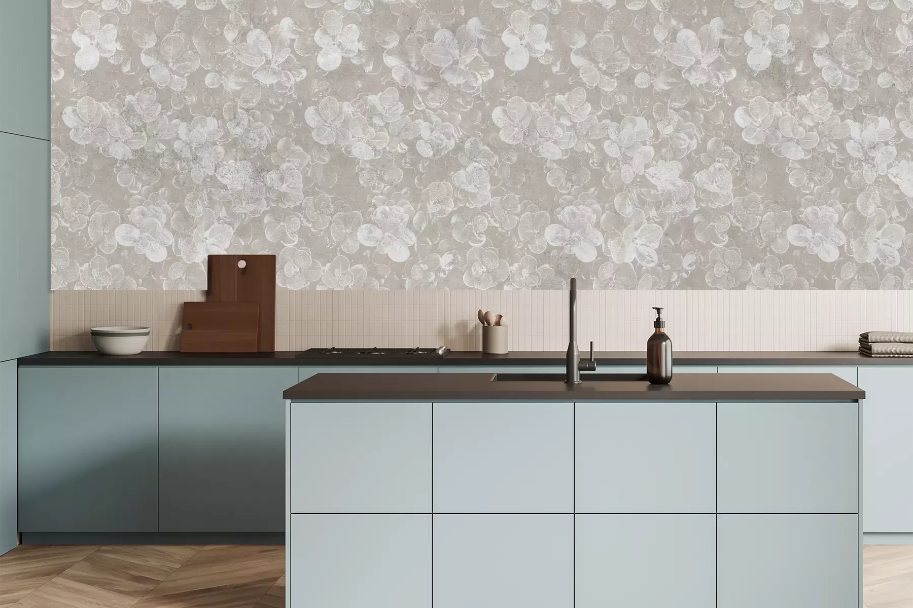 Het materiaal Premium is een glad vinyl op vlies, dat bestand is tegen uitrekken en vervorming. Het is dampdoorlatend – de muren kunnen vrij ademen – waardoor het geschikt is voor gebruik in de keuken en badkamer. Bij vervuiling kan het materiaal worden afgenomen met een vochtige doek. De maximale breedte van één baan bedraagt 95 of 105 cm, afhankelijk van de beschikbaarheid. Montage vindt plaats met de rand-aan-rand methode, wat een esthetisch resultaat zonder zichtbare naden oplevert. Omdat de lijm rechtstreeks op de muur wordt aangebracht, verloopt de installatie van het fotobehang snel en eenvoudig.