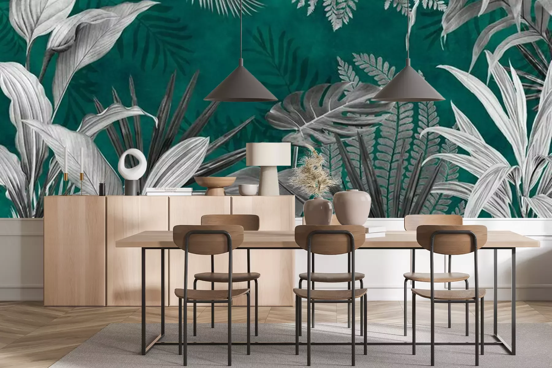 Tropische bladeren in tinten groen en grijsFotobehang