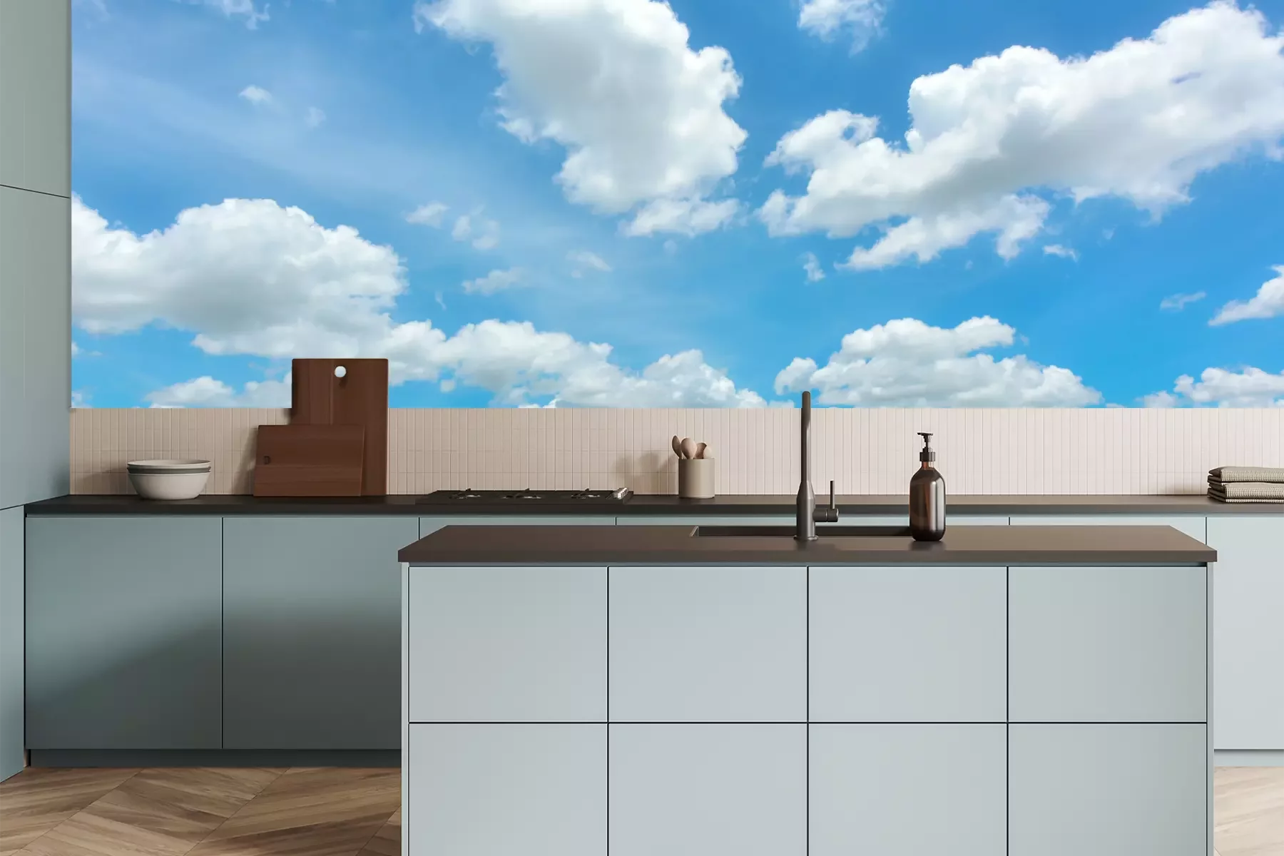 Het materiaal Premium is een glad vinyl op vlies, dat bestand is tegen uitrekken en vervorming. Het is dampdoorlatend – de muren kunnen vrij ademen – waardoor het geschikt is voor gebruik in de keuken en badkamer. Bij vervuiling kan het materiaal worden afgenomen met een vochtige doek. De maximale breedte van één baan bedraagt 95 of 105 cm, afhankelijk van de beschikbaarheid. Montage vindt plaats met de rand-aan-rand methode, wat een esthetisch resultaat zonder zichtbare naden oplevert. Omdat de lijm rechtstreeks op de muur wordt aangebracht, verloopt de installatie van het fotobehang snel en eenvoudig.