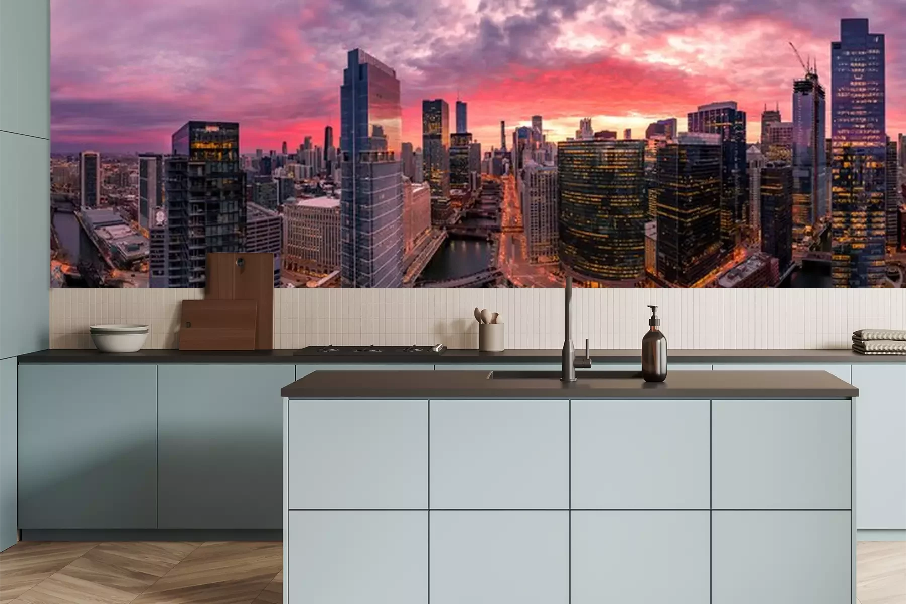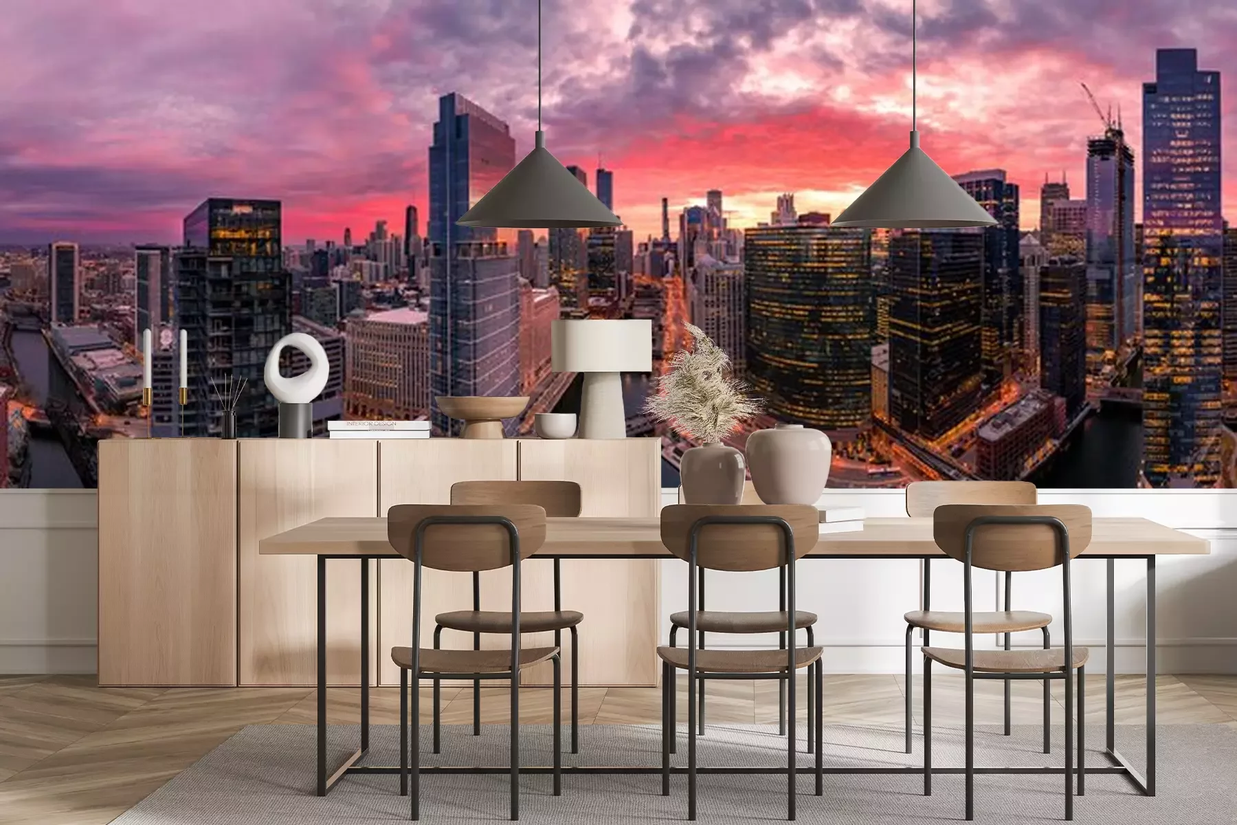 Fotobehang Wolkenkrabbers en zonsondergang in de stad