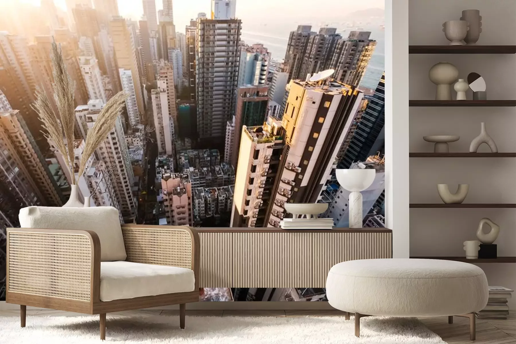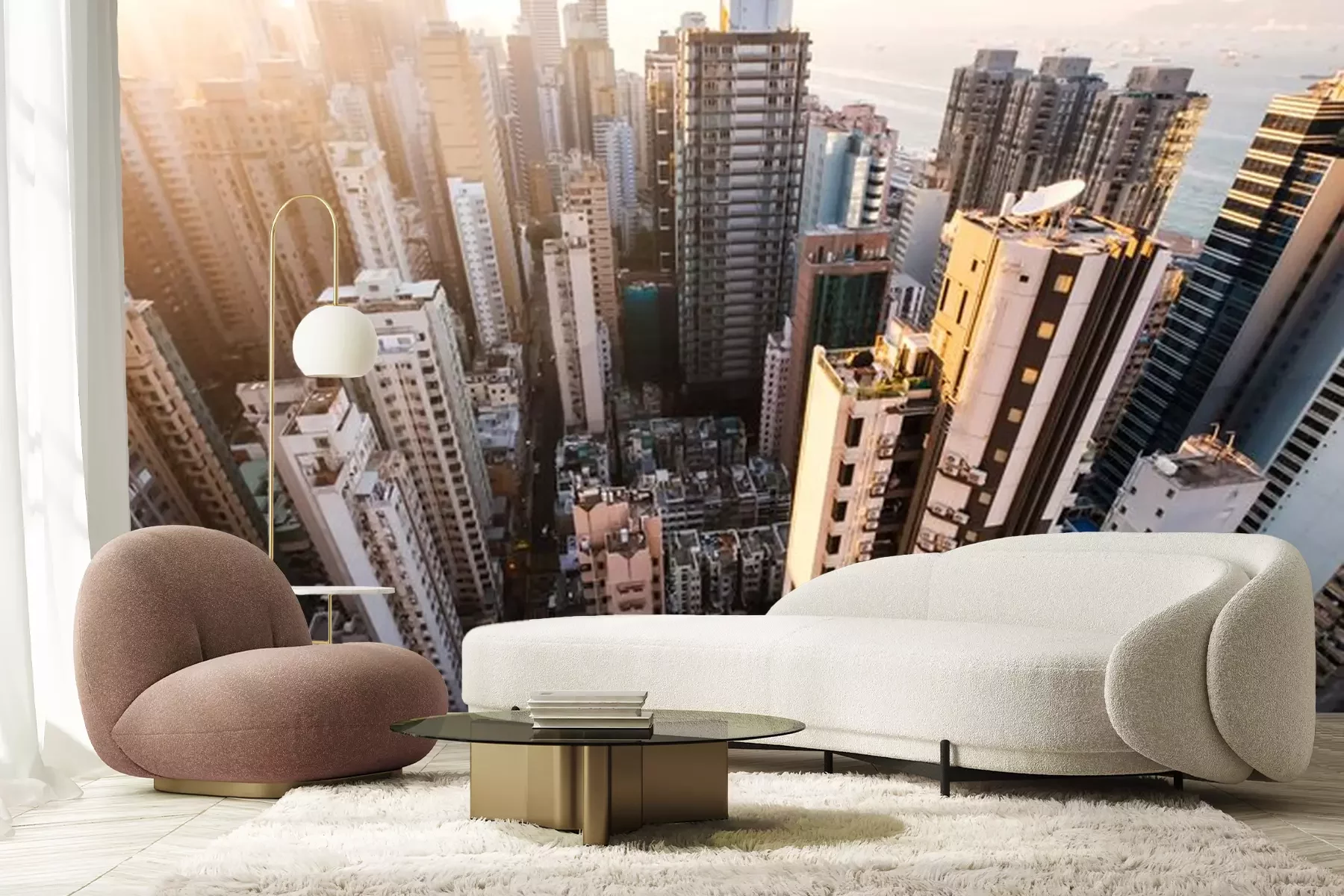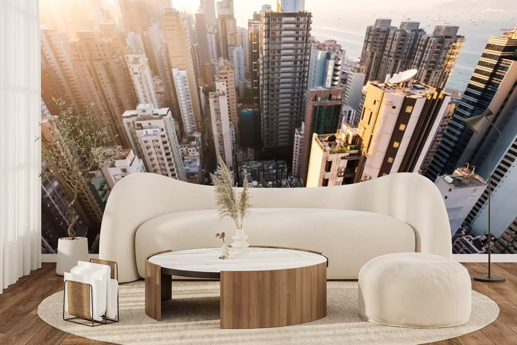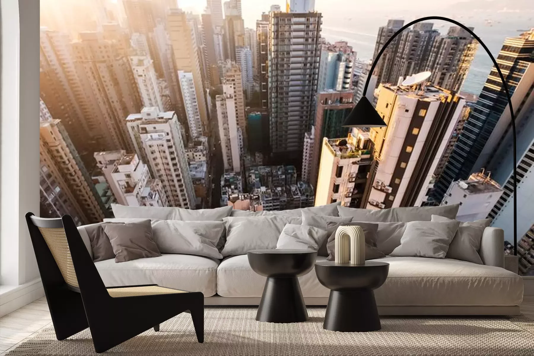 Fotobehang Wolkenkrabbers in Hong Kong in de ochtend