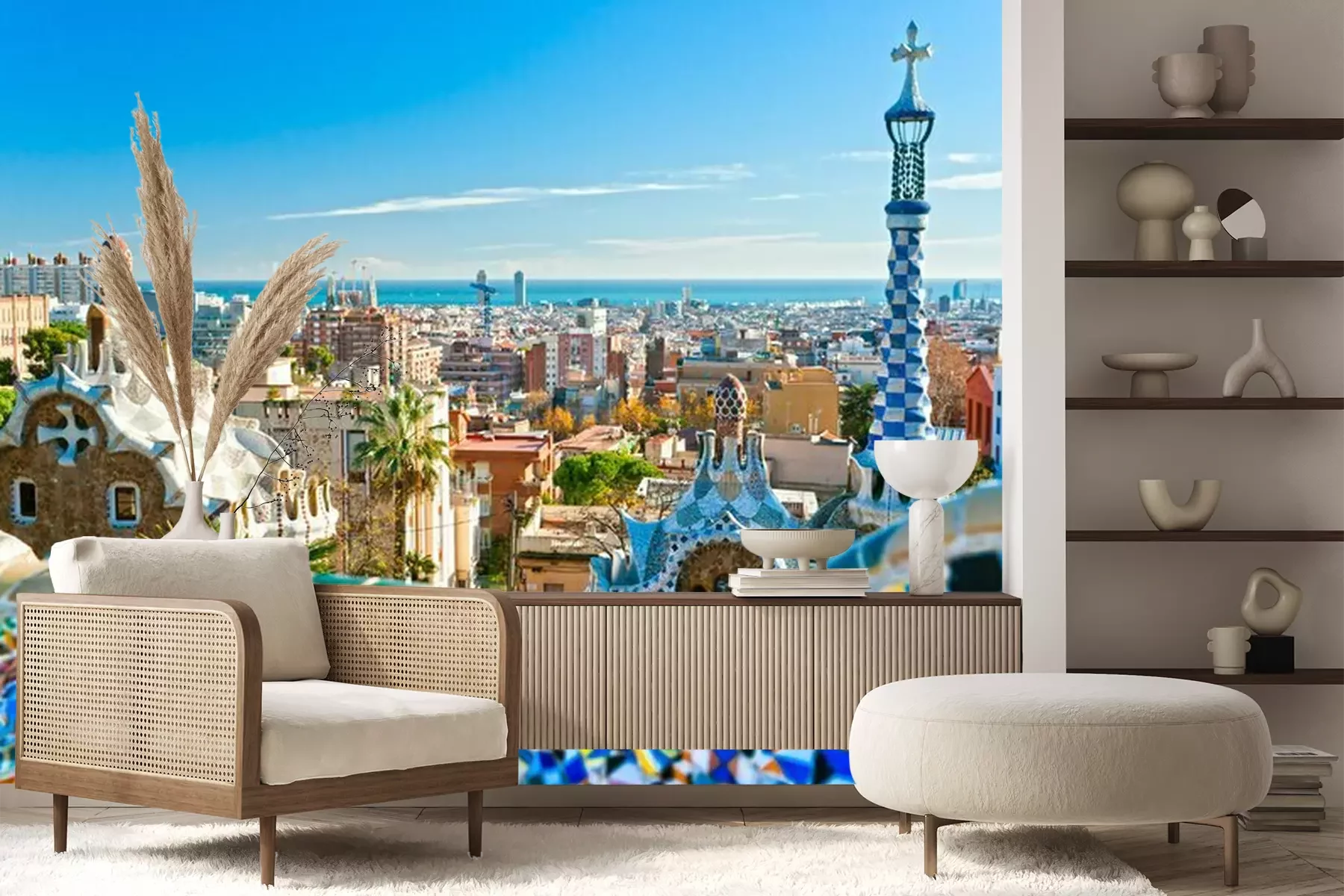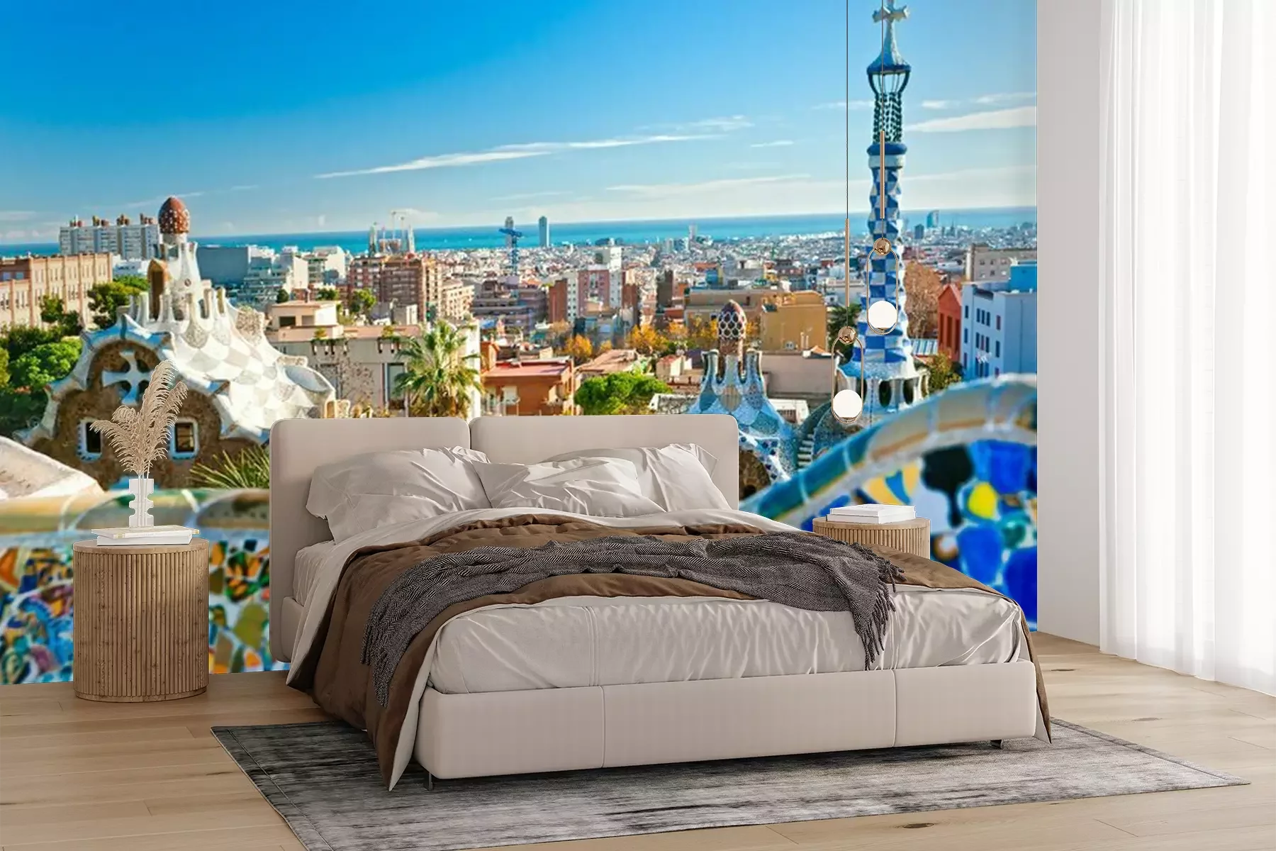 Het materiaal Premium+ is een gestructureerd vinyl op vlies met een gewicht van 255 g/m², dat kleine oneffenheden in de muur effectief camoufleert. De subtiele structuur van fijn zand geeft het oppervlak een exclusieve uitstraling, terwijl de halfmatte afwerking de diepte van de kleuren benadrukt. Het materiaal is dampdoorlatend, waardoor het ook in de keuken en badkamer kan worden gebruikt. De maximale breedte van één baan bedraagt 100 cm – bij grotere afmetingen wordt het fotobehang in meerdere gelijke banen verdeeld. De lijm wordt direct op de muur aangebracht en het behang wordt rand-aan-rand geplakt, wat zorgt voor een esthetisch resultaat zonder zichtbare naden. Het oppervlak kan gemakkelijk worden schoongemaakt door het voorzichtig af te nemen met een vochtige doek.