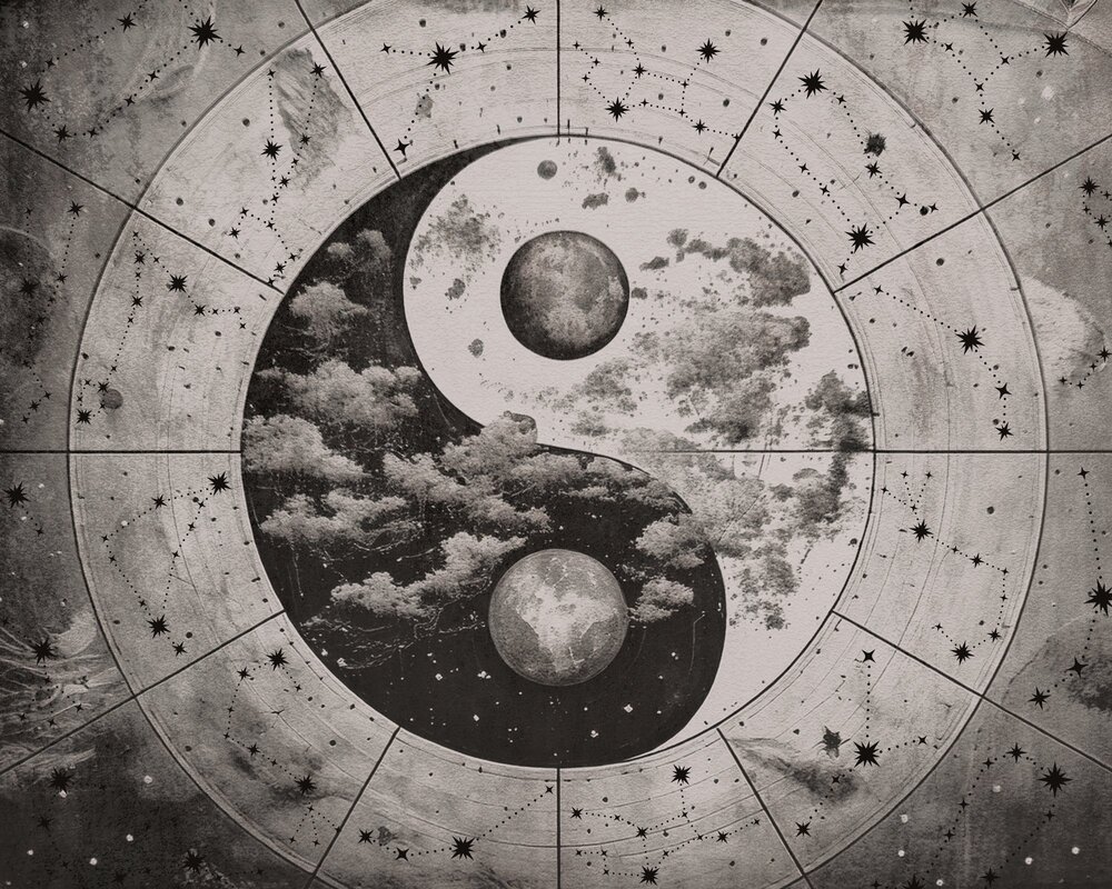 Fotobehang: Yin Yang-symbool op een sterrenachtergrond