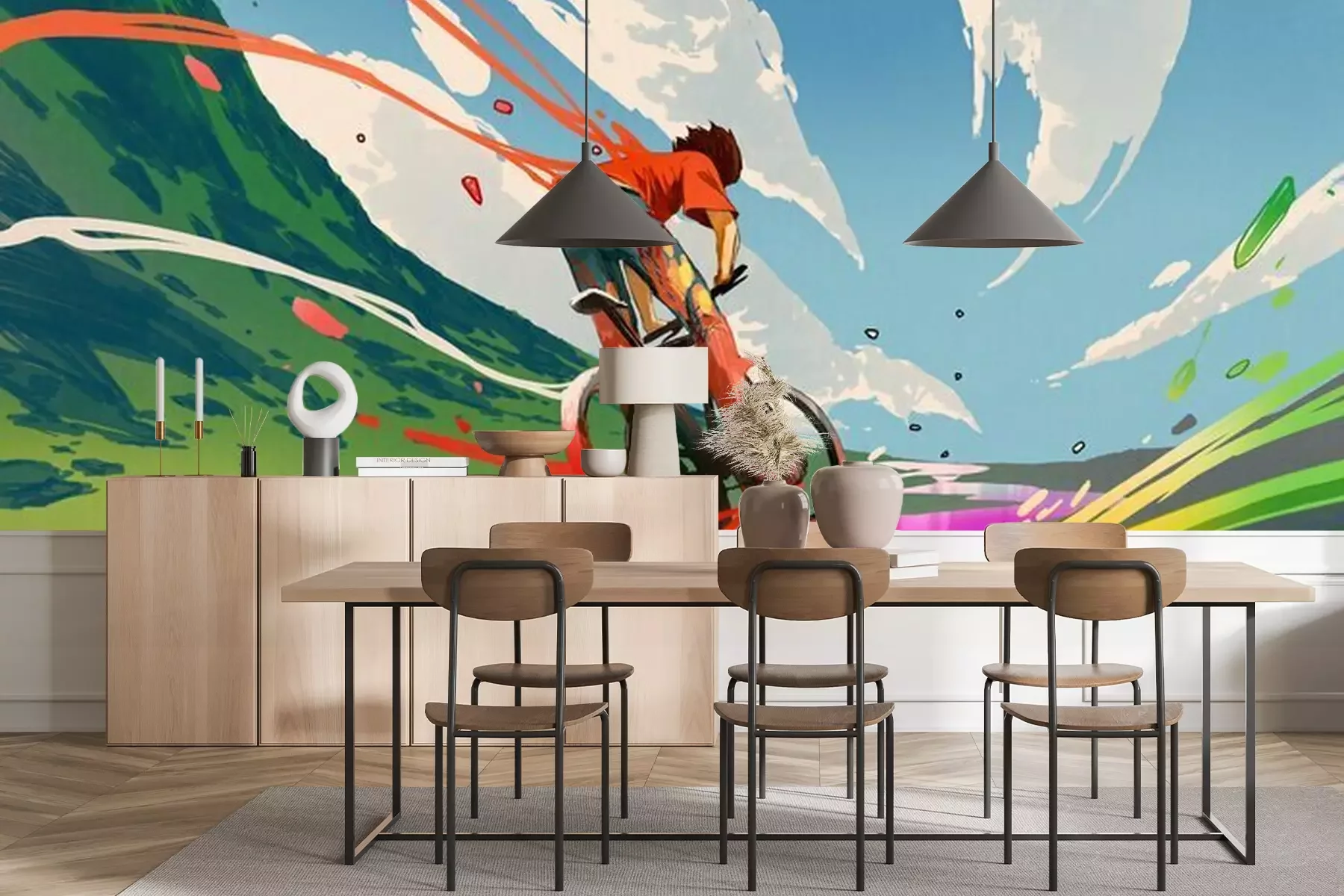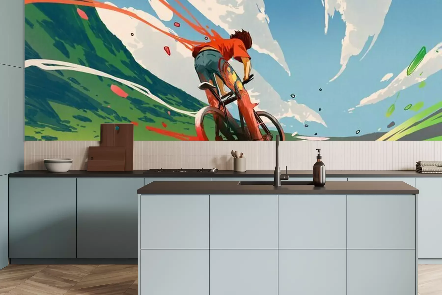 *Korting is niet van toepassing op lijmen, accessoires en cadeaubonnen.Het hier gepresenteerde fotobehang – illustratie van een jongen op een fiets – is de ideale oplossing niet alleen voor liefhebbers van fietsen, maar ook voor fans van anime, oftewel Japanse animatiefilms. Wat deze door ons voorgestelde decoratie zo bijzonder maakt, is het uiterst dynamische karakter ervan. De compositie is zodanig ontworpen dat de opstelling van de wolken en het veelkleurige spoor dat de fietser achterlaat een gevoel van beweging creëren. Hierdoor zal dit kleurrijke fotobehang niet alleen het interieur tot leven brengen, maar ook de ruimte een uitgesproken karakter geven. Omdat het een kleurrijke illustratie is, zal dit type grafiek goed passen in de inrichting van een kinderkamer. Als het kind van fietsen houdt, zal hij of zij zeker dol zijn op dit fotobehang. Fiets wordt gepresenteerd tegen de achtergrond van een landschap – een vallei die zich tussen groene heuvels uitstrekt – waardoor een vleugje natuur in huis wordt gehaald. Dit is een uitstekende manier om de inrichting direct veel vriendelijker en gezelliger te maken. Het is ook vermeldenswaard dat dit soort kleurrijk fotobehang een vrolijke sfeer in de kinderkamer zal brengen. Dankzij het uitgebalanceerde kleurenpalet wordt de indruk van chaos of overbelasting in de inrichting vermeden. De wanddecoratie kan echter niet alleen decoreren. Door een sportdiscipline, in dit geval wielrennen, weer te geven, zal het kind aangemoedigd worden om zijn vrije tijd actief door te brengen en zal het een uitstekende weerspiegeling zijn van zijn passie voor fietsen. Een dergelijk fotobehang zal ook goed passen in een tienerinterieur. Fiets die in de anime-stijl illustratie wordt getoond, zal een tiener aanspreken die geïnteresseerd is in de Japanse popcultuur. Hoewel het een tekening is, hoeft het helemaal niet kinderachtig te zijn, zoals elke anime-fan weet. Als dit fotobehang het dominante element in de kamer van de tiener wordt, zal de fiets op deze opvallende grafiek een volledige transformatie van het bestaande interieur mogelijk maken, zelfs als de meubels en andere elementen ongewijzigd blijven.