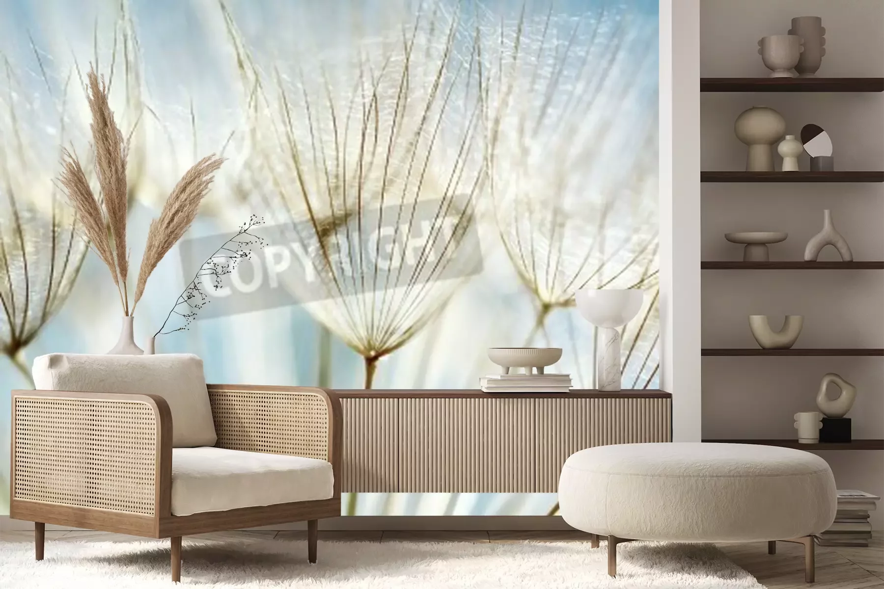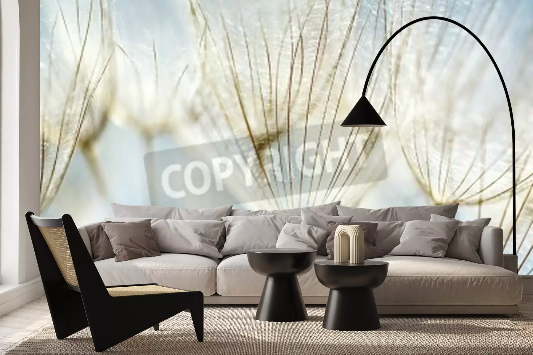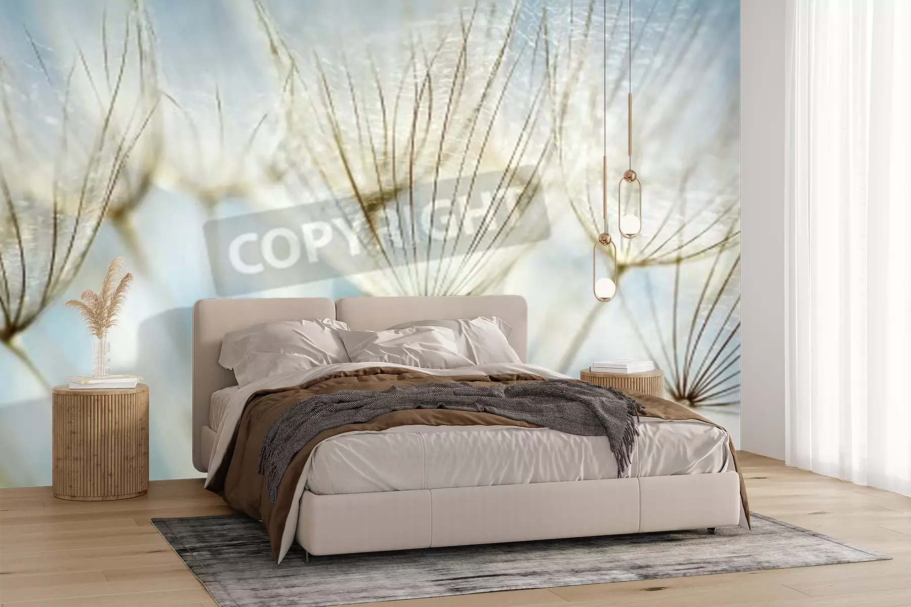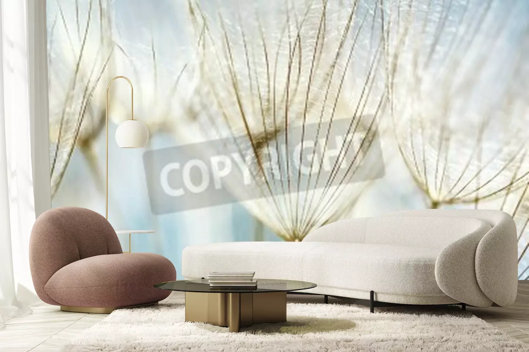 Fotobehang Zaden van een paardenbloem op de achtergrond van de hemel