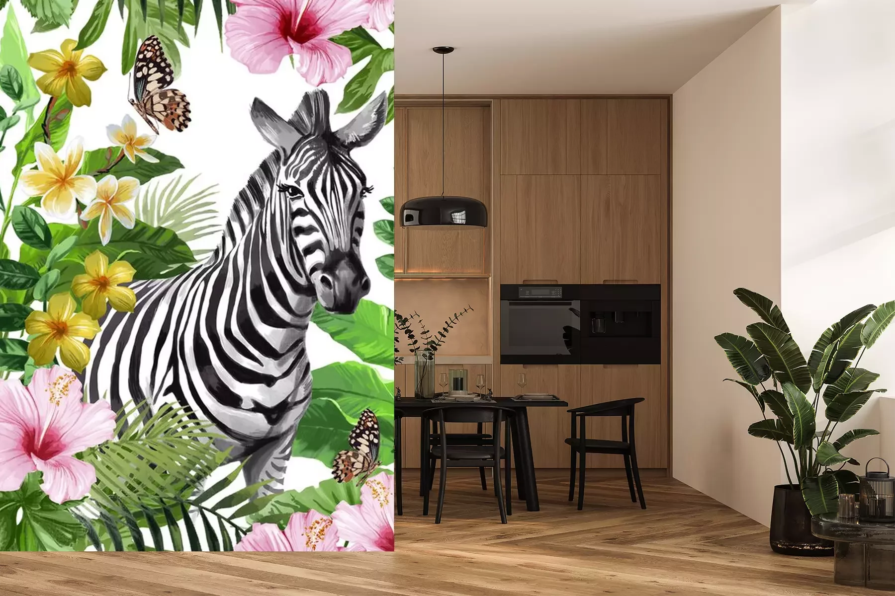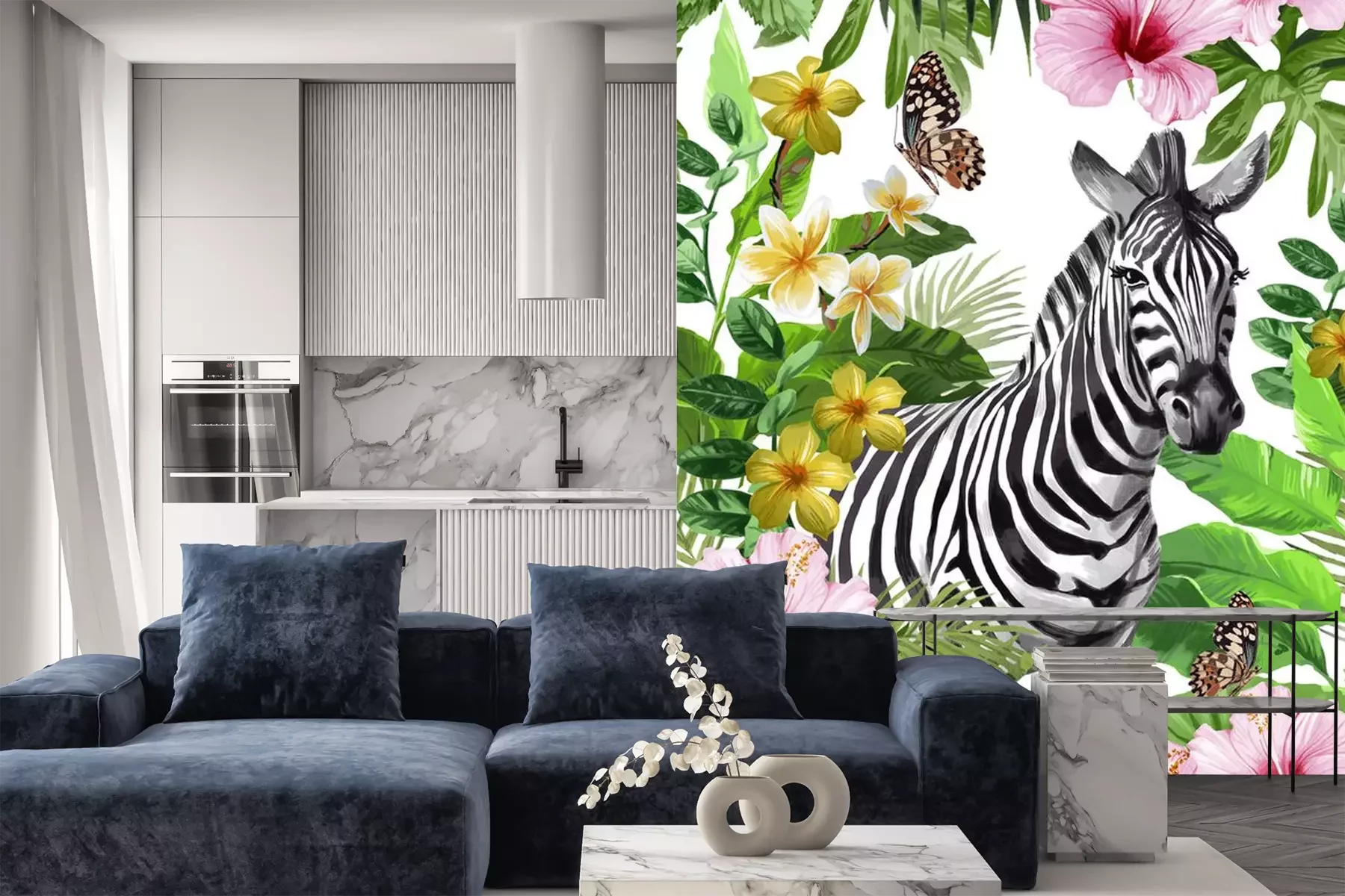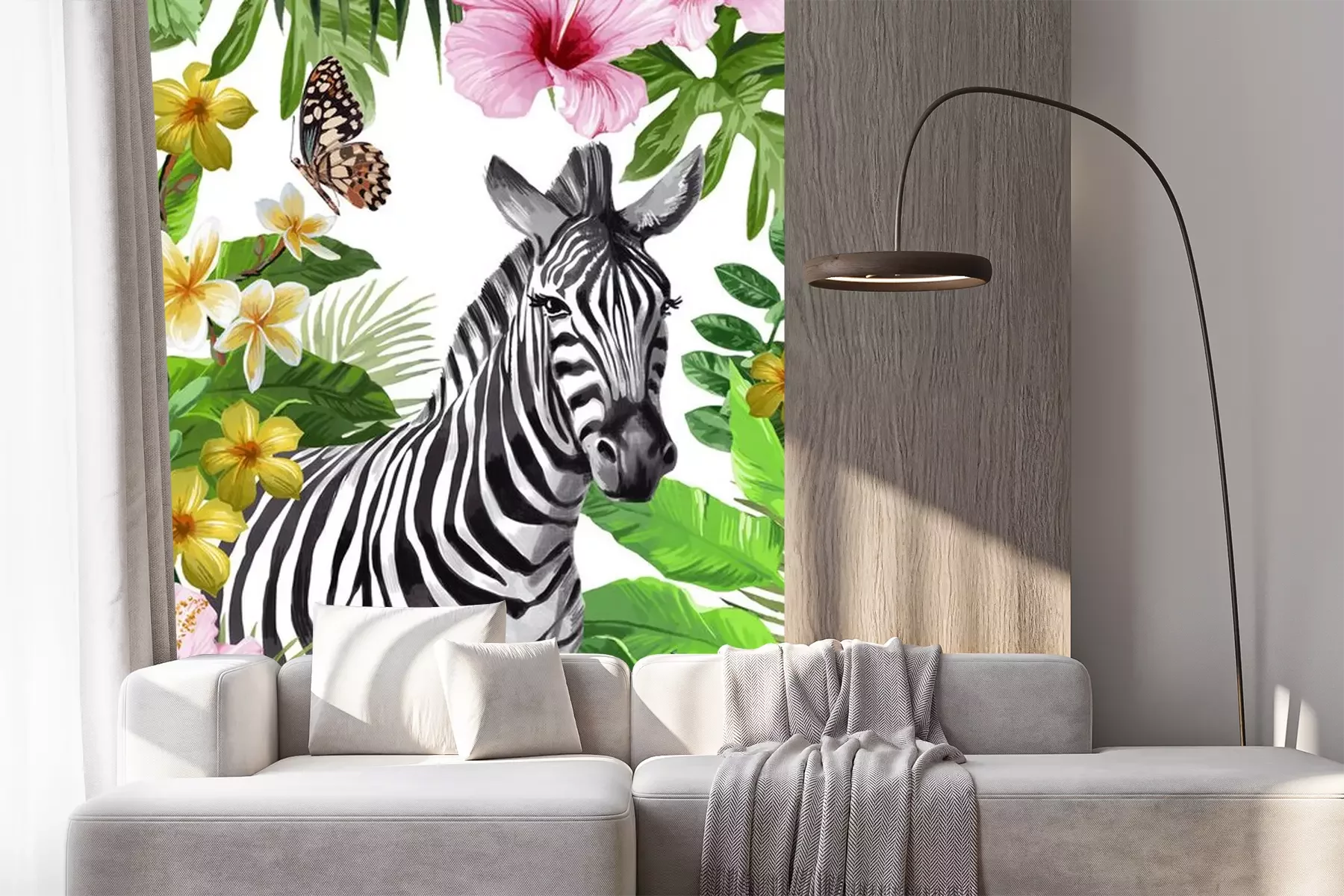 Fotobehang Zebra tussen kleurrijke tropische bloemen