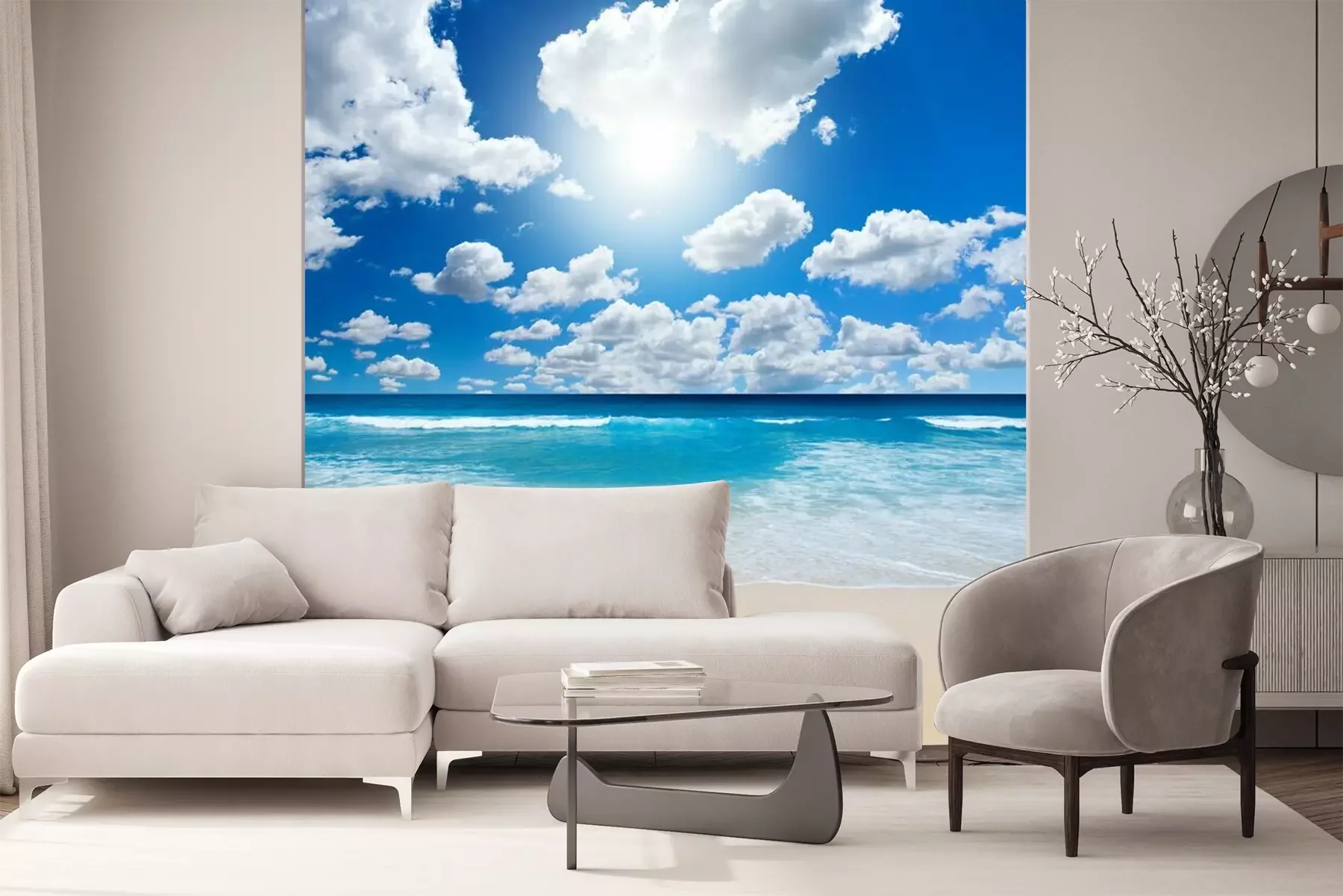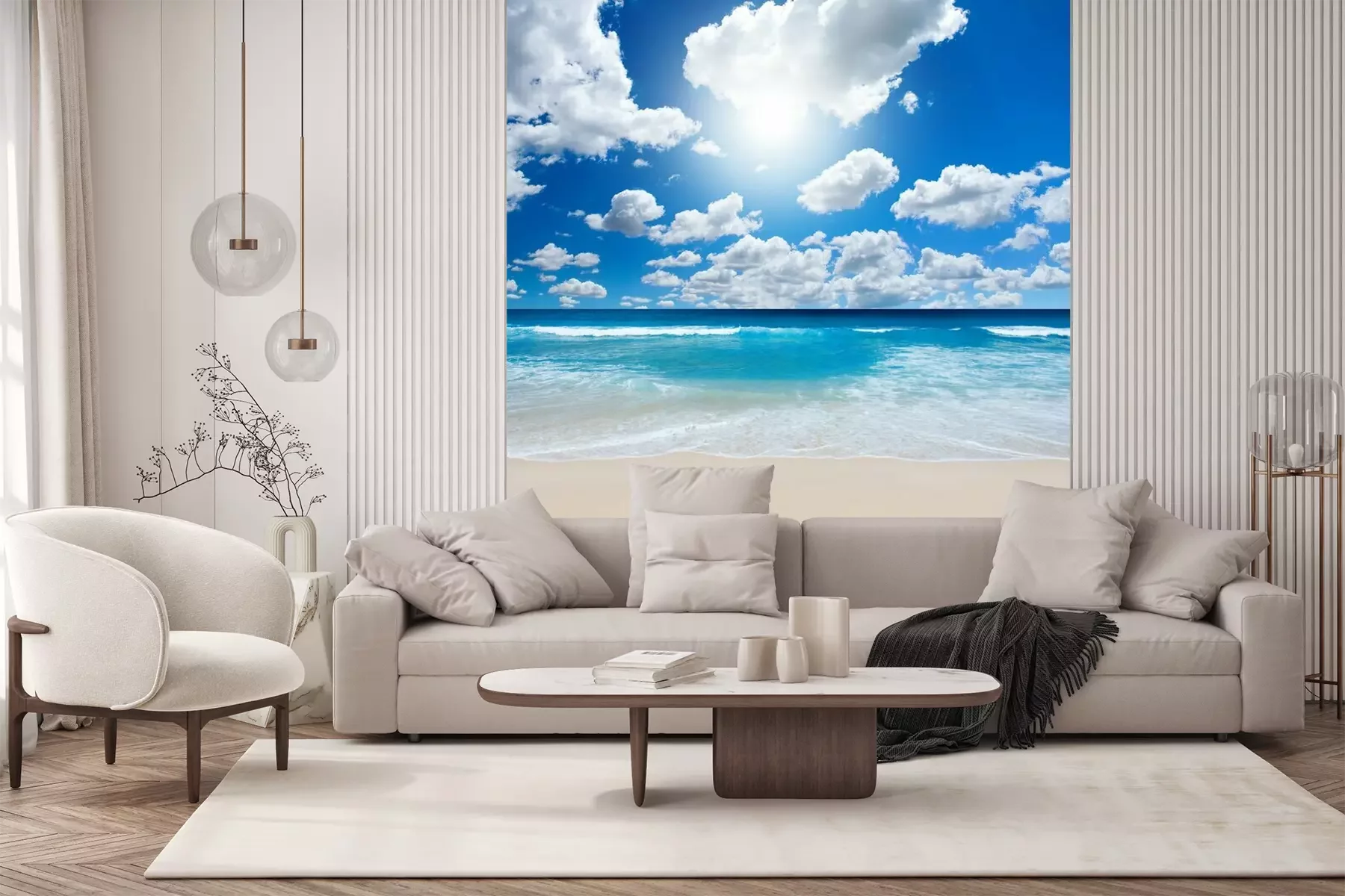 Het materiaal Premium+ is een gestructureerd vinyl op vlies met een gewicht van 255 g/m², dat kleine oneffenheden in de muur effectief camoufleert. De subtiele structuur van fijn zand geeft het oppervlak een exclusieve uitstraling, terwijl de halfmatte afwerking de diepte van de kleuren benadrukt. Het materiaal is dampdoorlatend, waardoor het ook in de keuken en badkamer kan worden gebruikt. De maximale breedte van één baan bedraagt 100 cm – bij grotere afmetingen wordt het fotobehang in meerdere gelijke banen verdeeld. De lijm wordt direct op de muur aangebracht en het behang wordt rand-aan-rand geplakt, wat zorgt voor een esthetisch resultaat zonder zichtbare naden. Het oppervlak kan gemakkelijk worden schoongemaakt door het voorzichtig af te nemen met een vochtige doek.
