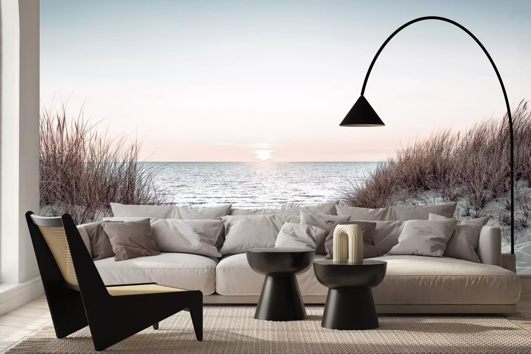Het materiaal Premium+ is een gestructureerd vinyl op vlies met een gewicht van 255 g/m², dat kleine oneffenheden in de muur effectief camoufleert. De subtiele structuur van fijn zand geeft het oppervlak een exclusieve uitstraling, terwijl de halfmatte afwerking de diepte van de kleuren benadrukt. Het materiaal is dampdoorlatend, waardoor het ook in de keuken en badkamer kan worden gebruikt. De maximale breedte van één baan bedraagt 100 cm – bij grotere afmetingen wordt het fotobehang in meerdere gelijke banen verdeeld. De lijm wordt direct op de muur aangebracht en het behang wordt rand-aan-rand geplakt, wat zorgt voor een esthetisch resultaat zonder zichtbare naden. Het oppervlak kan gemakkelijk worden schoongemaakt door het voorzichtig af te nemen met een vochtige doek.