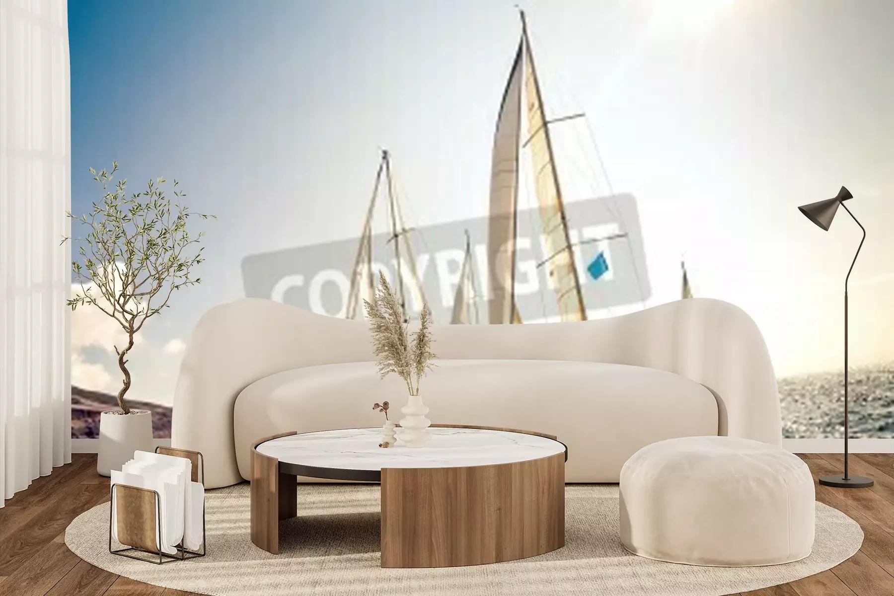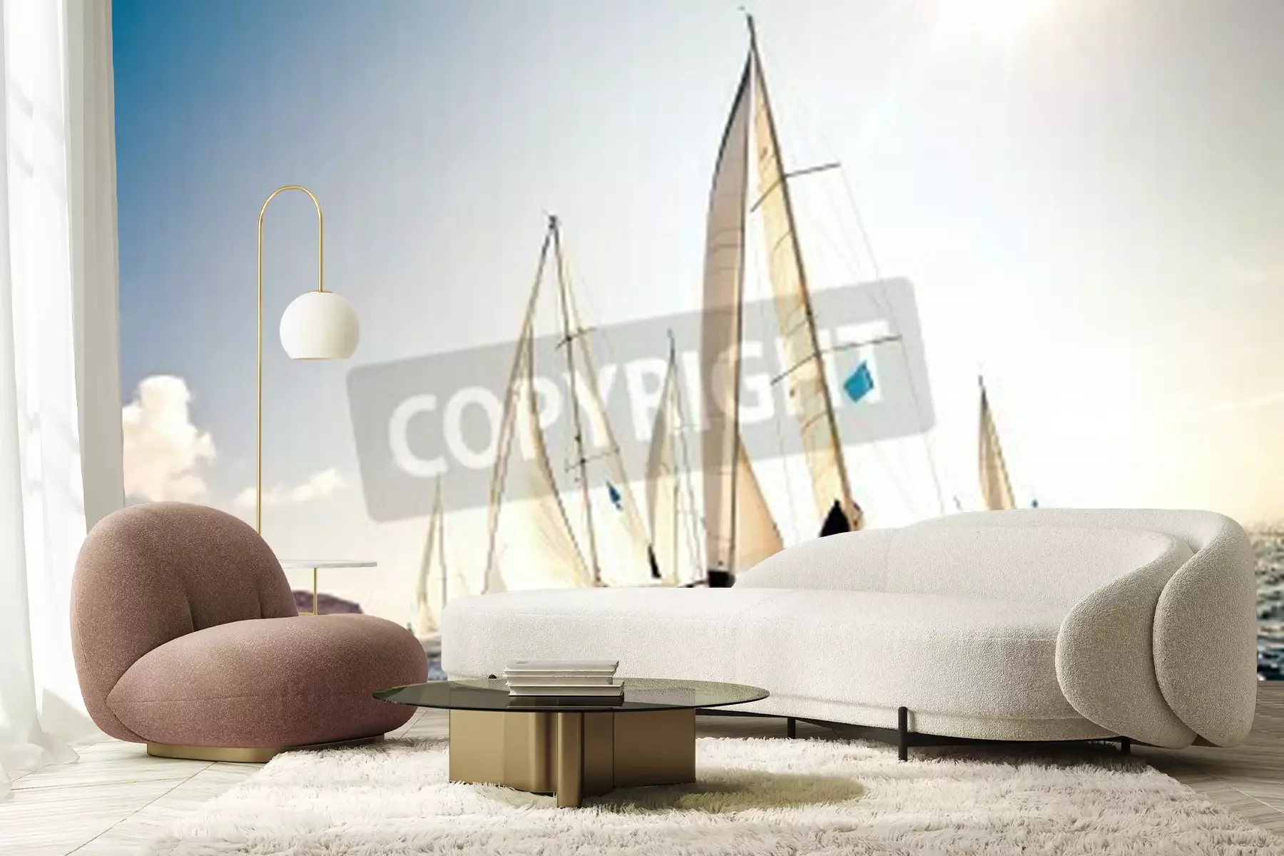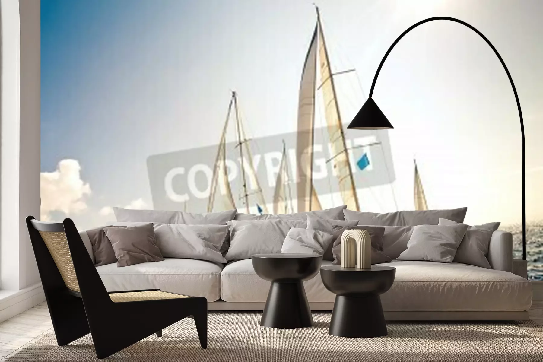 Fotobehang Zeilboten bij rotsen