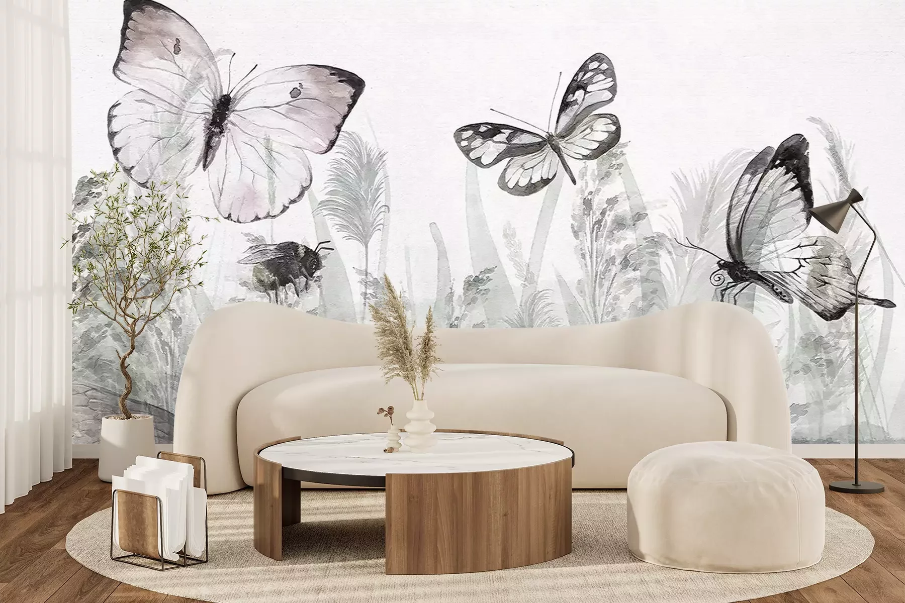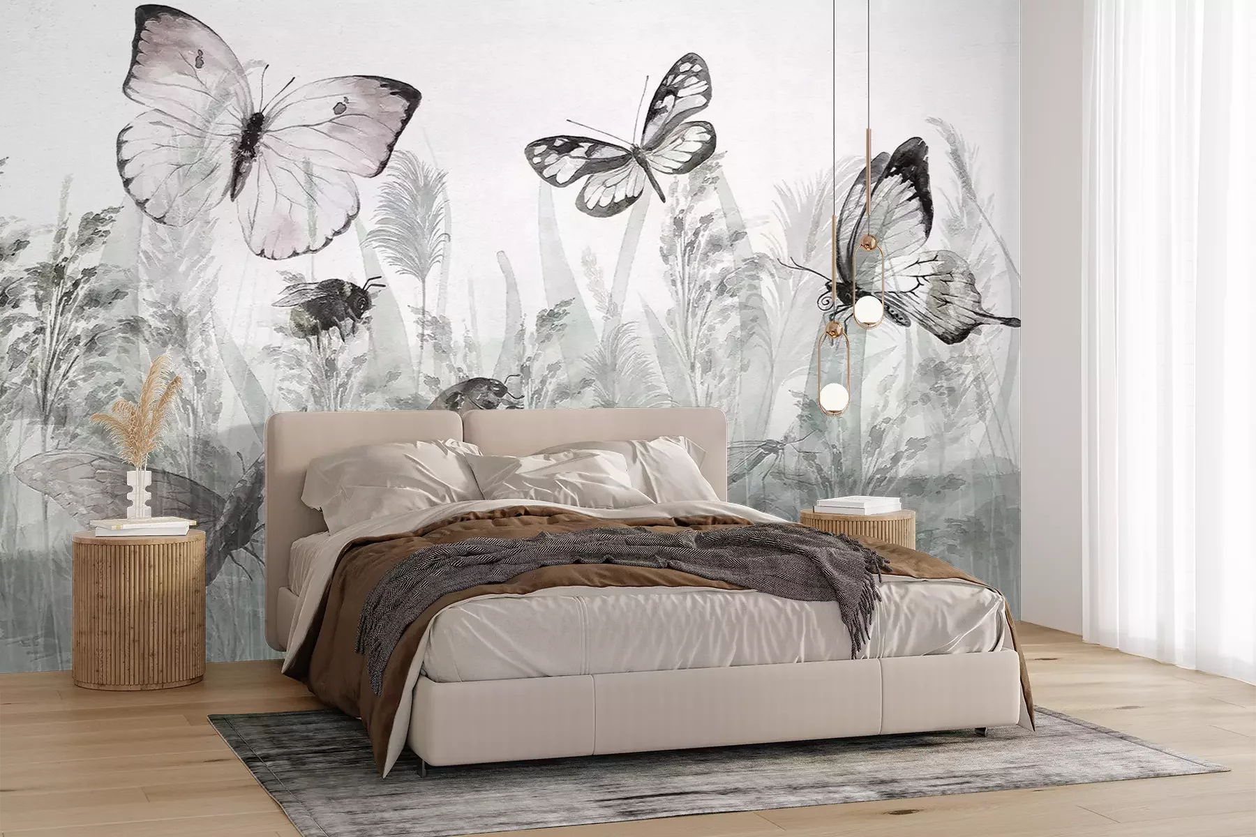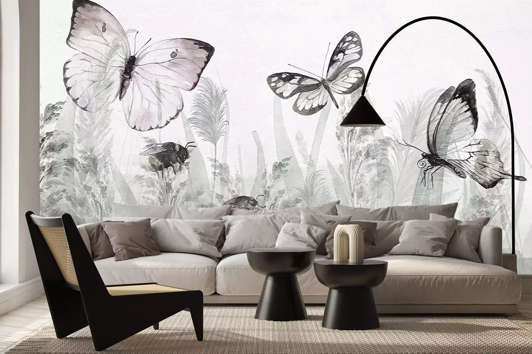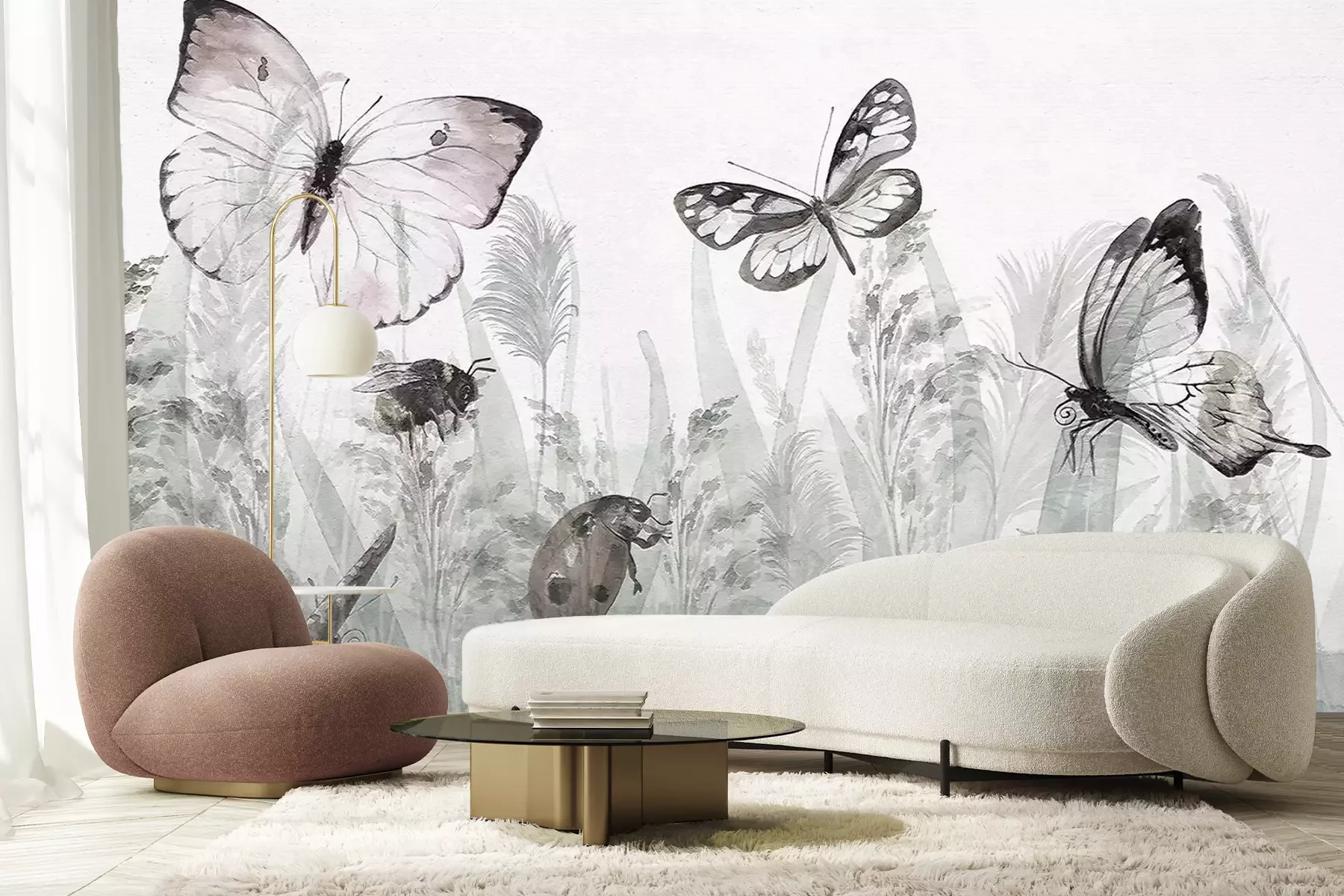 Zomerweidelandschap met lieveheersbeestjes en vlinders tussen de planten en grassen