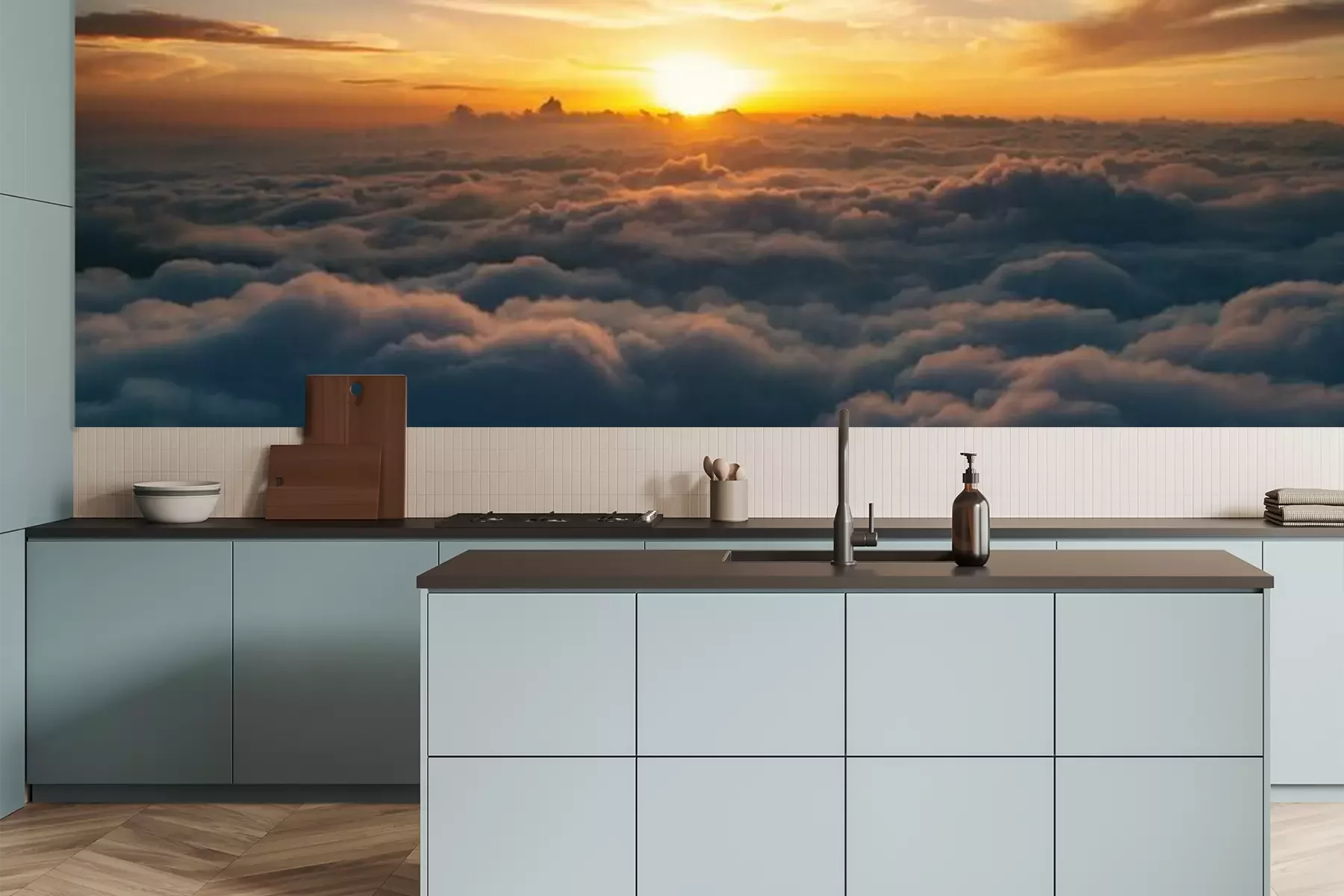 Het materiaal Premium is een glad vinyl op vlies, dat bestand is tegen uitrekken en vervorming. Het is dampdoorlatend – de muren kunnen vrij ademen – waardoor het geschikt is voor gebruik in de keuken en badkamer. Bij vervuiling kan het materiaal worden afgenomen met een vochtige doek. De maximale breedte van één baan bedraagt 95 of 105 cm, afhankelijk van de beschikbaarheid. Montage vindt plaats met de rand-aan-rand methode, wat een esthetisch resultaat zonder zichtbare naden oplevert. Omdat de lijm rechtstreeks op de muur wordt aangebracht, verloopt de installatie van het fotobehang snel en eenvoudig.