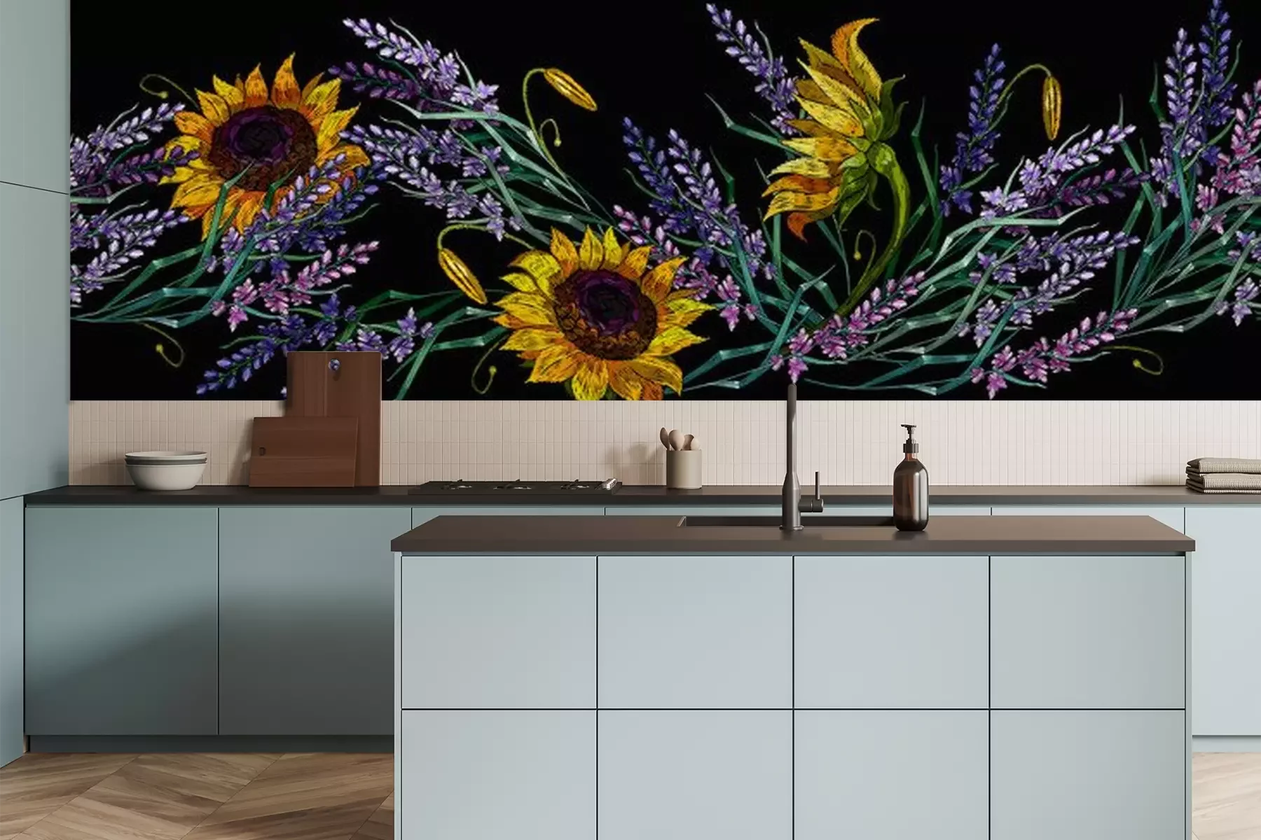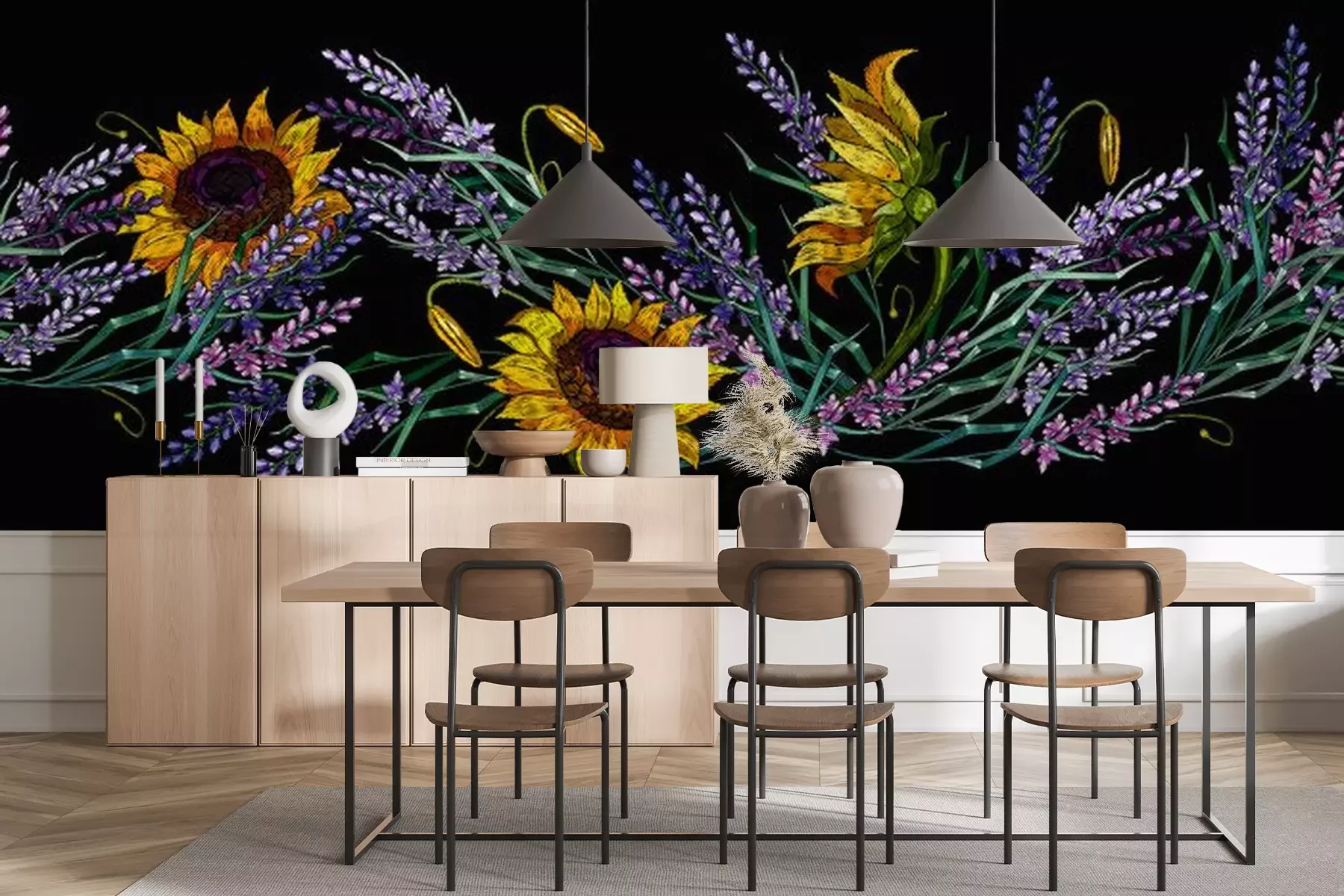 Fotobehang Zonnebloemen en lavendel op zwarte achtergrond