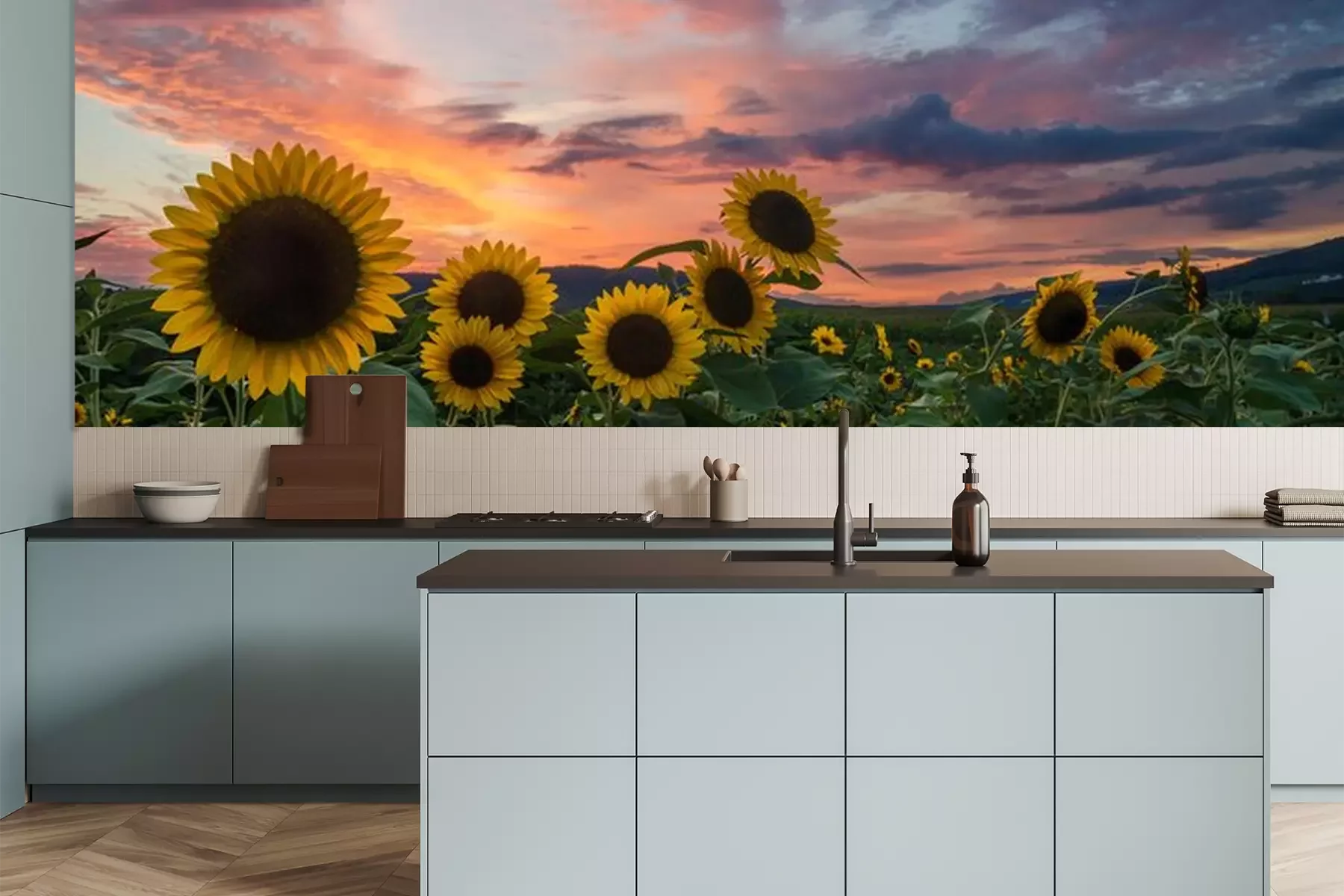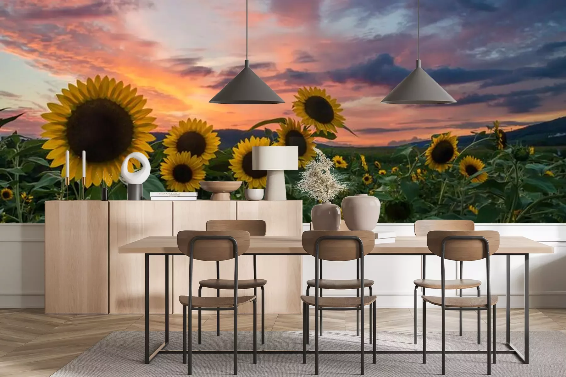 Fotobehang Zonnebloemen veld en ondergaande zon