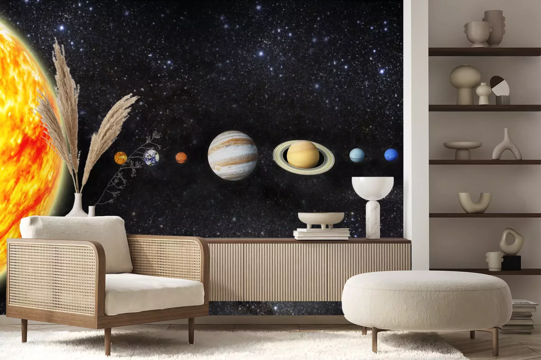 Het materiaal Premium+ is een gestructureerd vinyl op vlies met een gewicht van 255 g/m², dat kleine oneffenheden in de muur effectief camoufleert. De subtiele structuur van fijn zand geeft het oppervlak een exclusieve uitstraling, terwijl de halfmatte afwerking de diepte van de kleuren benadrukt. Het materiaal is dampdoorlatend, waardoor het ook in de keuken en badkamer kan worden gebruikt. De maximale breedte van één baan bedraagt 100 cm – bij grotere afmetingen wordt het fotobehang in meerdere gelijke banen verdeeld. De lijm wordt direct op de muur aangebracht en het behang wordt rand-aan-rand geplakt, wat zorgt voor een esthetisch resultaat zonder zichtbare naden. Het oppervlak kan gemakkelijk worden schoongemaakt door het voorzichtig af te nemen met een vochtige doek.