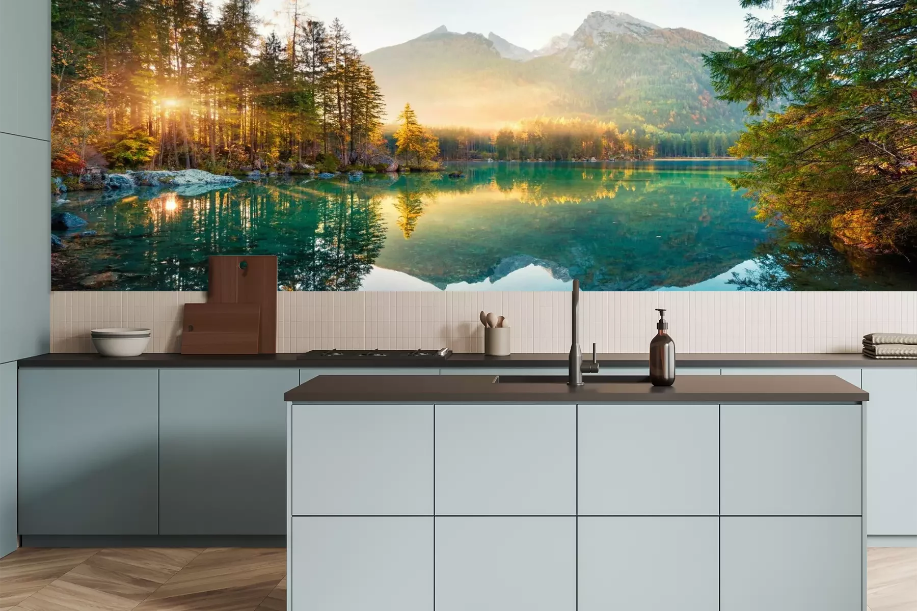 Het materiaal Premium is een glad vinyl op vlies, dat bestand is tegen uitrekken en vervorming. Het is dampdoorlatend – de muren kunnen vrij ademen – waardoor het geschikt is voor gebruik in de keuken en badkamer. Bij vervuiling kan het materiaal worden afgenomen met een vochtige doek. De maximale breedte van één baan bedraagt 95 of 105 cm, afhankelijk van de beschikbaarheid. Montage vindt plaats met de rand-aan-rand methode, wat een esthetisch resultaat zonder zichtbare naden oplevert. Omdat de lijm rechtstreeks op de muur wordt aangebracht, verloopt de installatie van het fotobehang snel en eenvoudig.