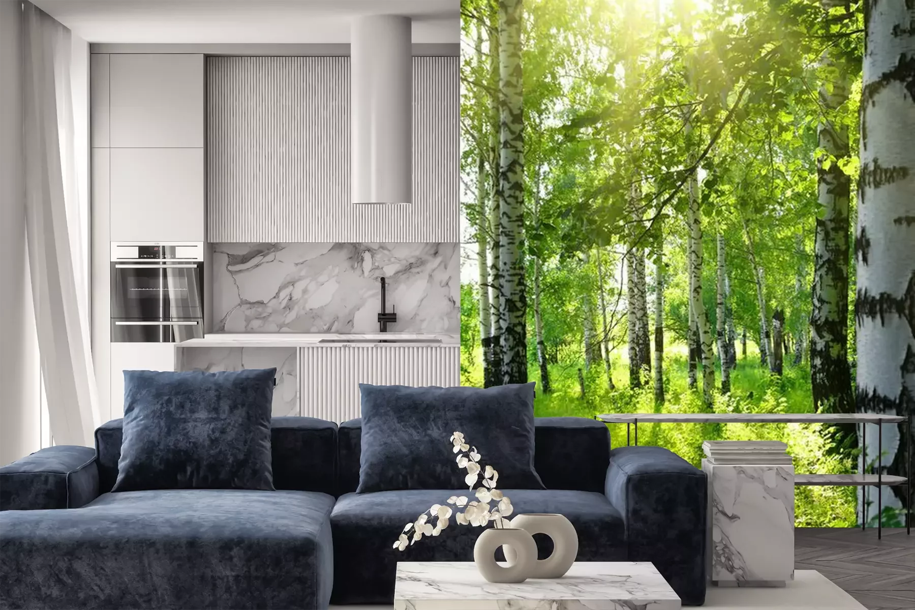 Het materiaal Premium+ is een gestructureerd vinyl op vlies met een gewicht van 255 g/m², dat kleine oneffenheden in de muur effectief camoufleert. De subtiele structuur van fijn zand geeft het oppervlak een exclusieve uitstraling, terwijl de halfmatte afwerking de diepte van de kleuren benadrukt. Het materiaal is dampdoorlatend, waardoor het ook in de keuken en badkamer kan worden gebruikt. De maximale breedte van één baan bedraagt 100 cm – bij grotere afmetingen wordt het fotobehang in meerdere gelijke banen verdeeld. De lijm wordt direct op de muur aangebracht en het behang wordt rand-aan-rand geplakt, wat zorgt voor een esthetisch resultaat zonder zichtbare naden. Het oppervlak kan gemakkelijk worden schoongemaakt door het voorzichtig af te nemen met een vochtige doek.