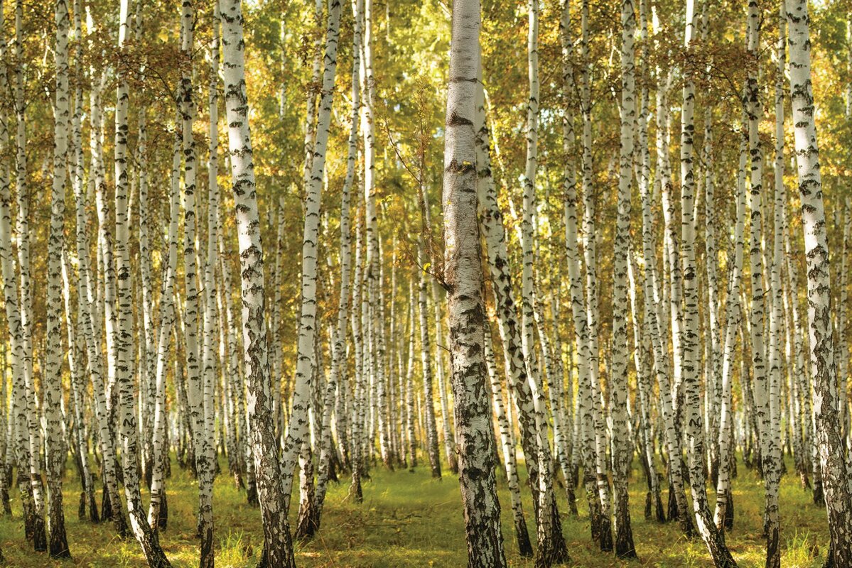 Fotobehang: Zonnig uitzicht op het berkenbos