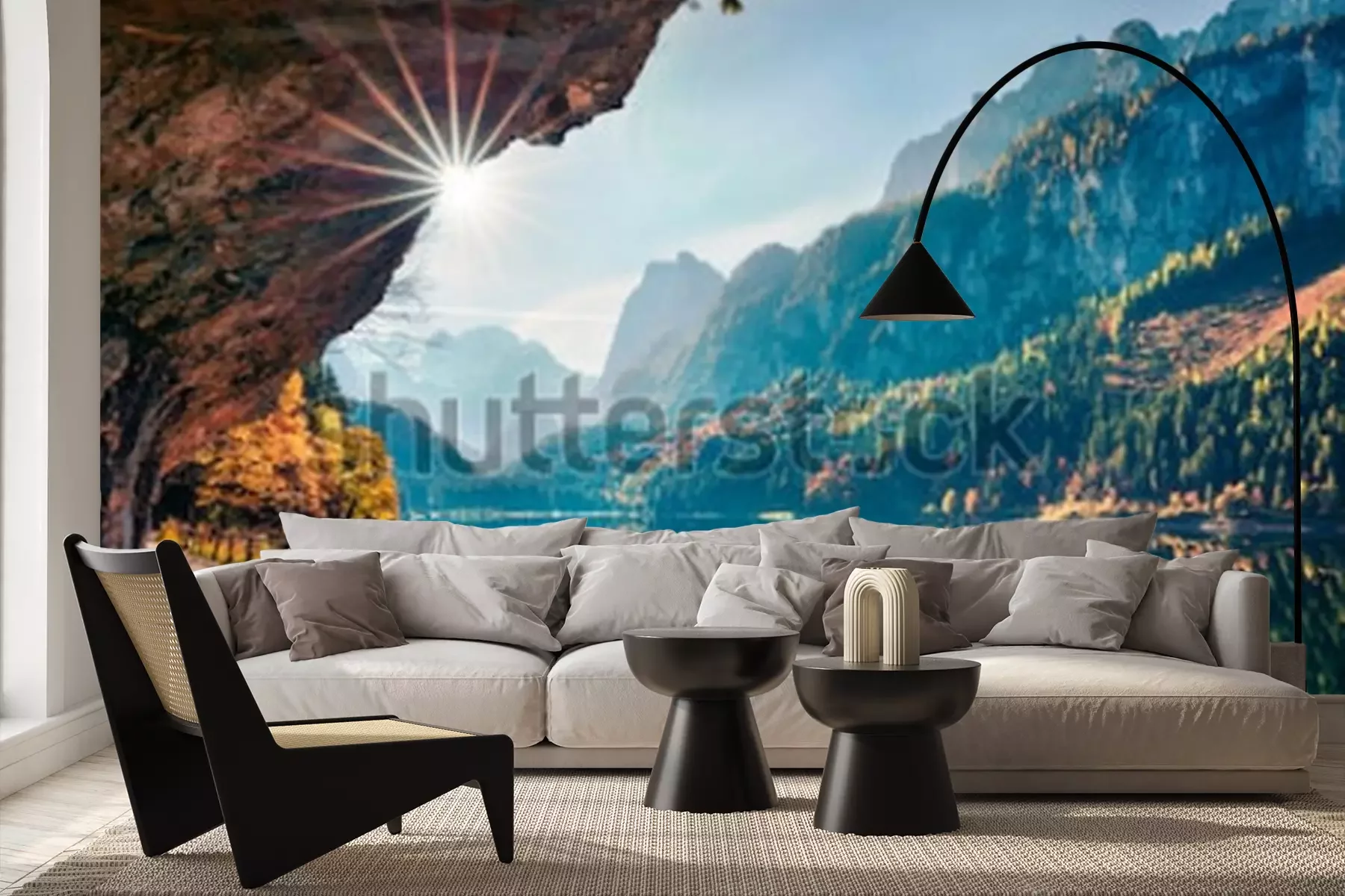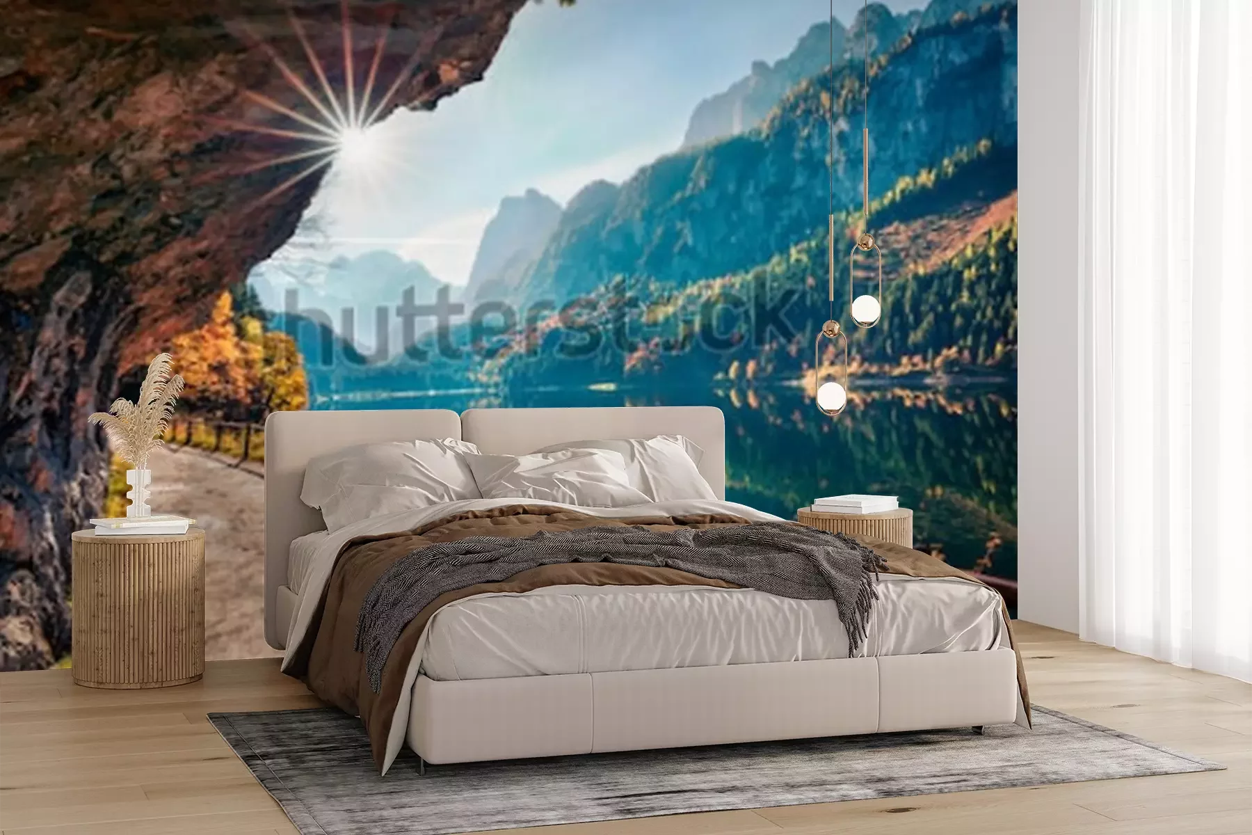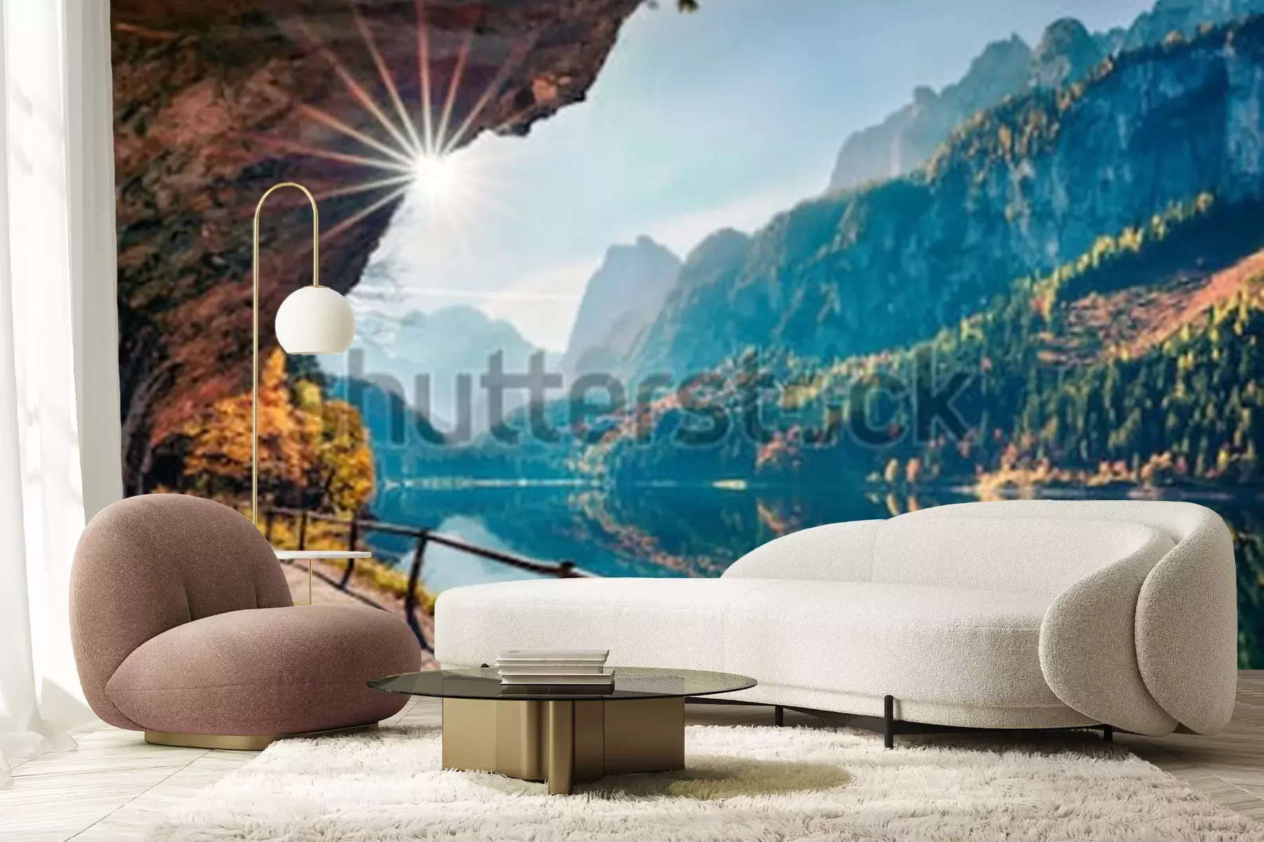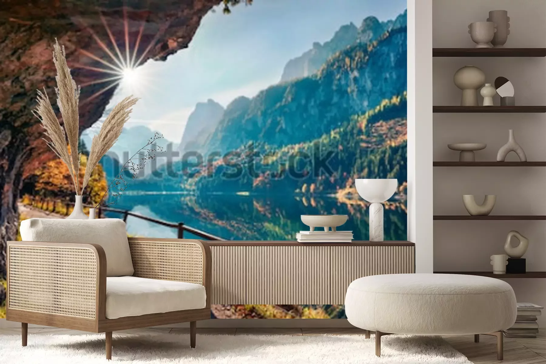 Fotobehang Zonnige de herfstscène van meer Vorderer (Gosausee). Kleurrijke ochtendmening van Oostenrijkse Alpen, Boven-Oostenrijk, Europa. Schoonheid van de natuur concept achtergrond.
