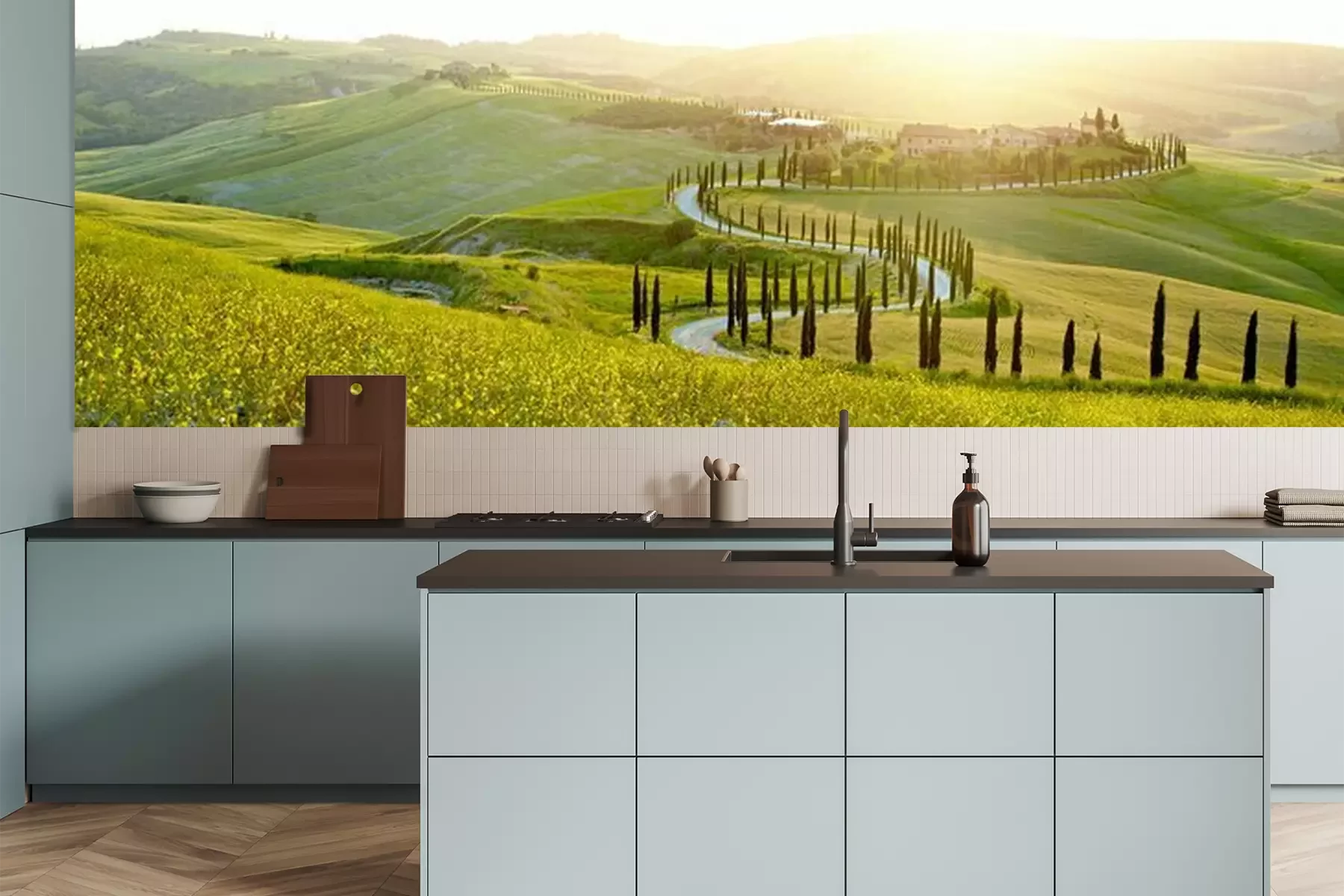 Het materiaal Premium is een glad vinyl op vlies, dat bestand is tegen uitrekken en vervorming. Het is dampdoorlatend – de muren kunnen vrij ademen – waardoor het geschikt is voor gebruik in de keuken en badkamer. Bij vervuiling kan het materiaal worden afgenomen met een vochtige doek. De maximale breedte van één baan bedraagt 95 of 105 cm, afhankelijk van de beschikbaarheid. Montage vindt plaats met de rand-aan-rand methode, wat een esthetisch resultaat zonder zichtbare naden oplevert. Omdat de lijm rechtstreeks op de muur wordt aangebracht, verloopt de installatie van het fotobehang snel en eenvoudig.