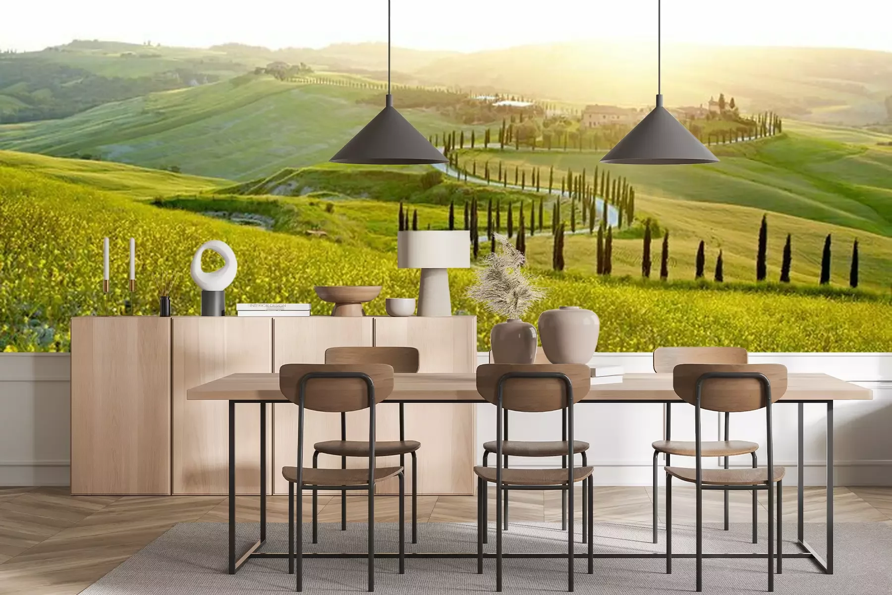 Het materiaal Premium+ is een gestructureerd vinyl op vlies met een gewicht van 255 g/m², dat kleine oneffenheden in de muur effectief camoufleert. De subtiele structuur van fijn zand geeft het oppervlak een exclusieve uitstraling, terwijl de halfmatte afwerking de diepte van de kleuren benadrukt. Het materiaal is dampdoorlatend, waardoor het ook in de keuken en badkamer kan worden gebruikt. De maximale breedte van één baan bedraagt 100 cm – bij grotere afmetingen wordt het fotobehang in meerdere gelijke banen verdeeld. De lijm wordt direct op de muur aangebracht en het behang wordt rand-aan-rand geplakt, wat zorgt voor een esthetisch resultaat zonder zichtbare naden. Het oppervlak kan gemakkelijk worden schoongemaakt door het voorzichtig af te nemen met een vochtige doek.
