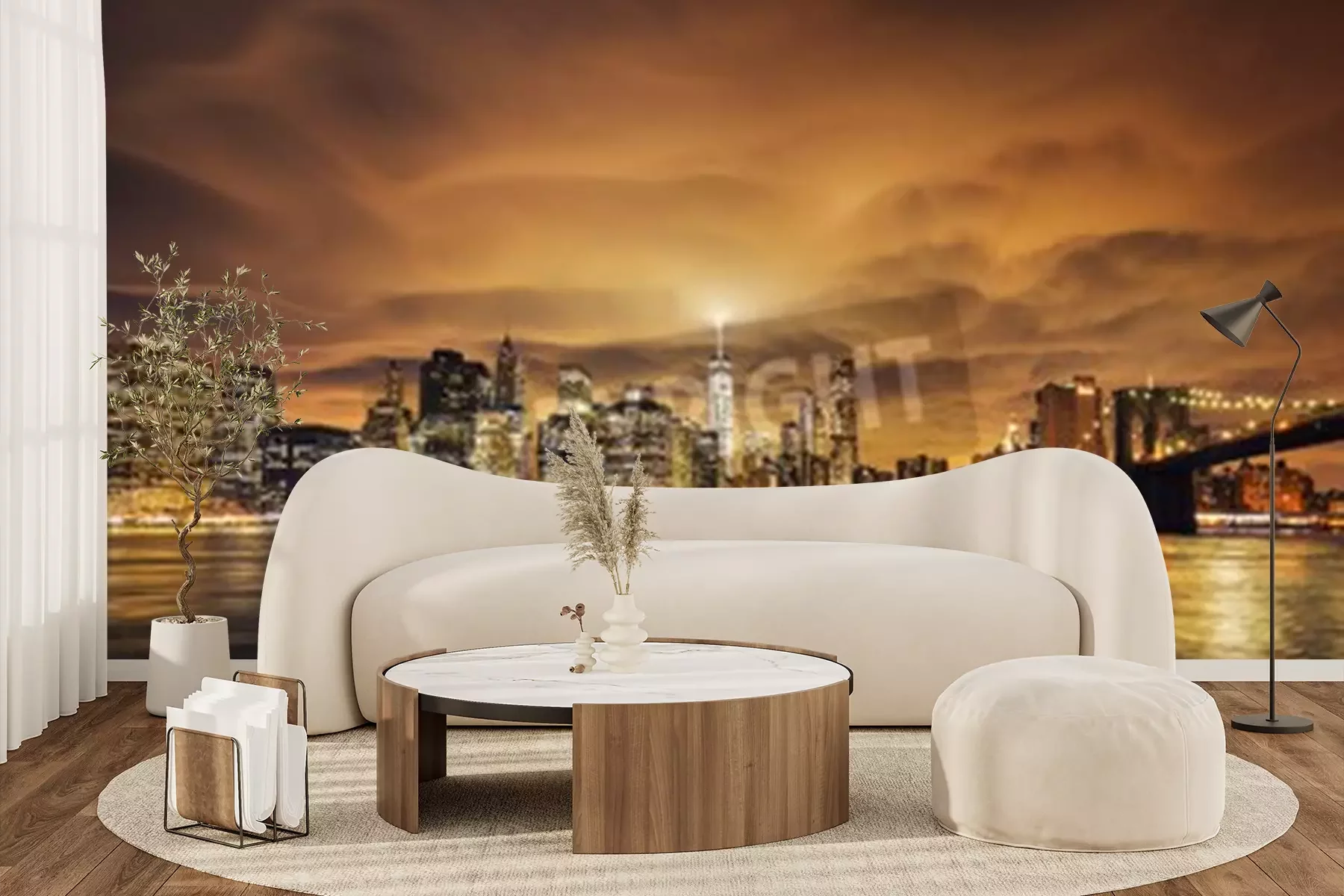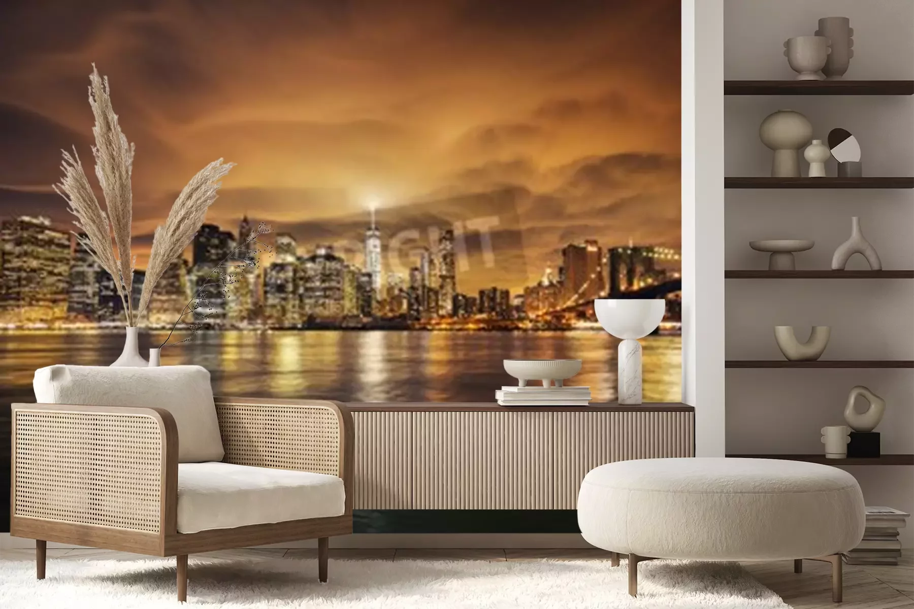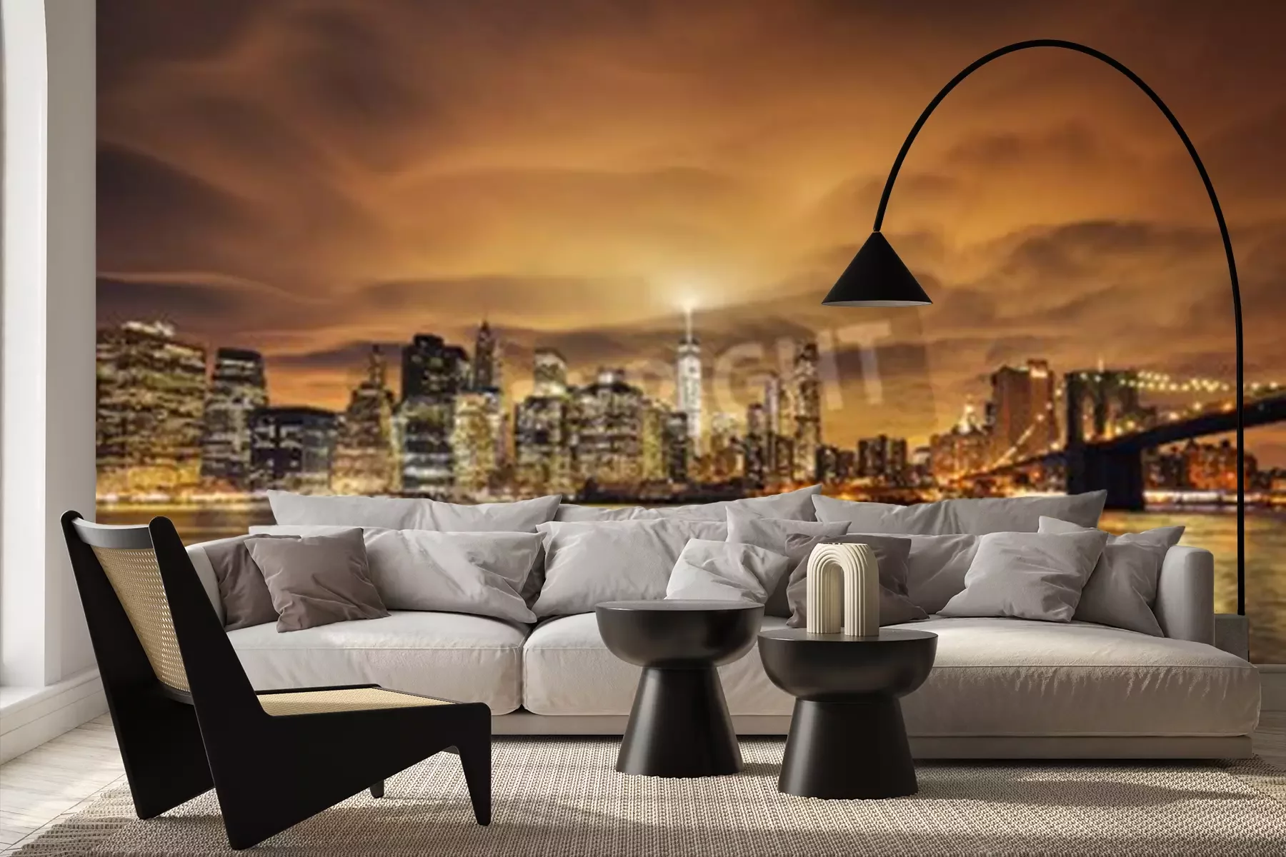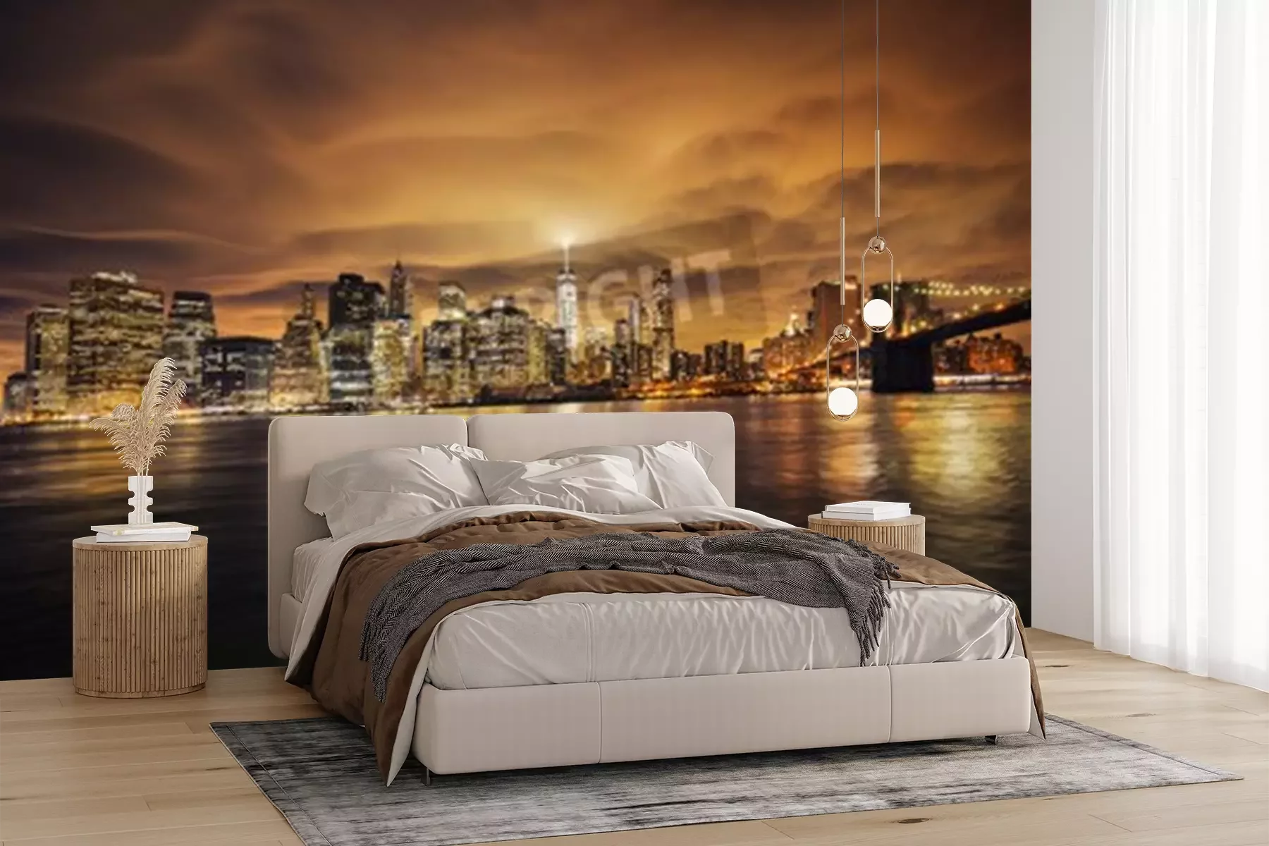 Fotobehang Zonsondergang achter de wolkenkrabbers van NY